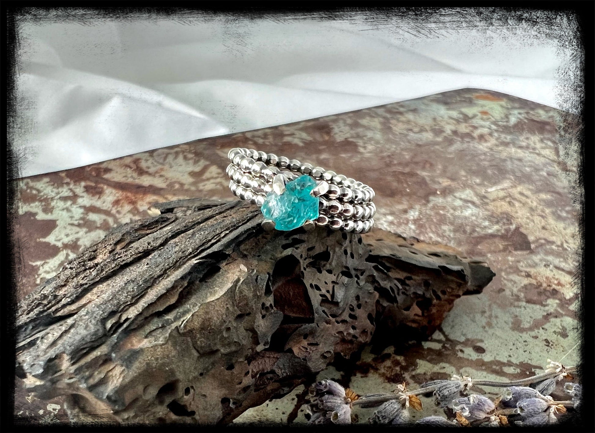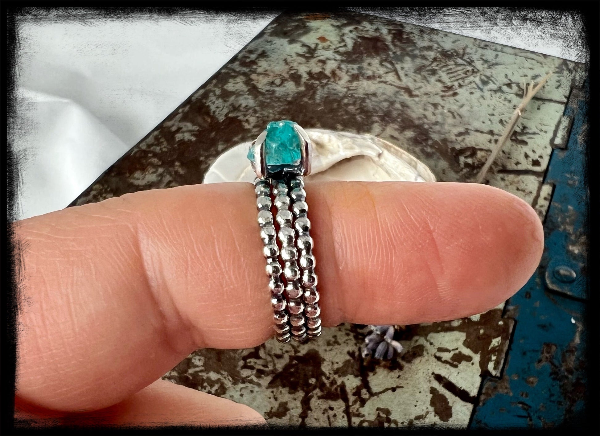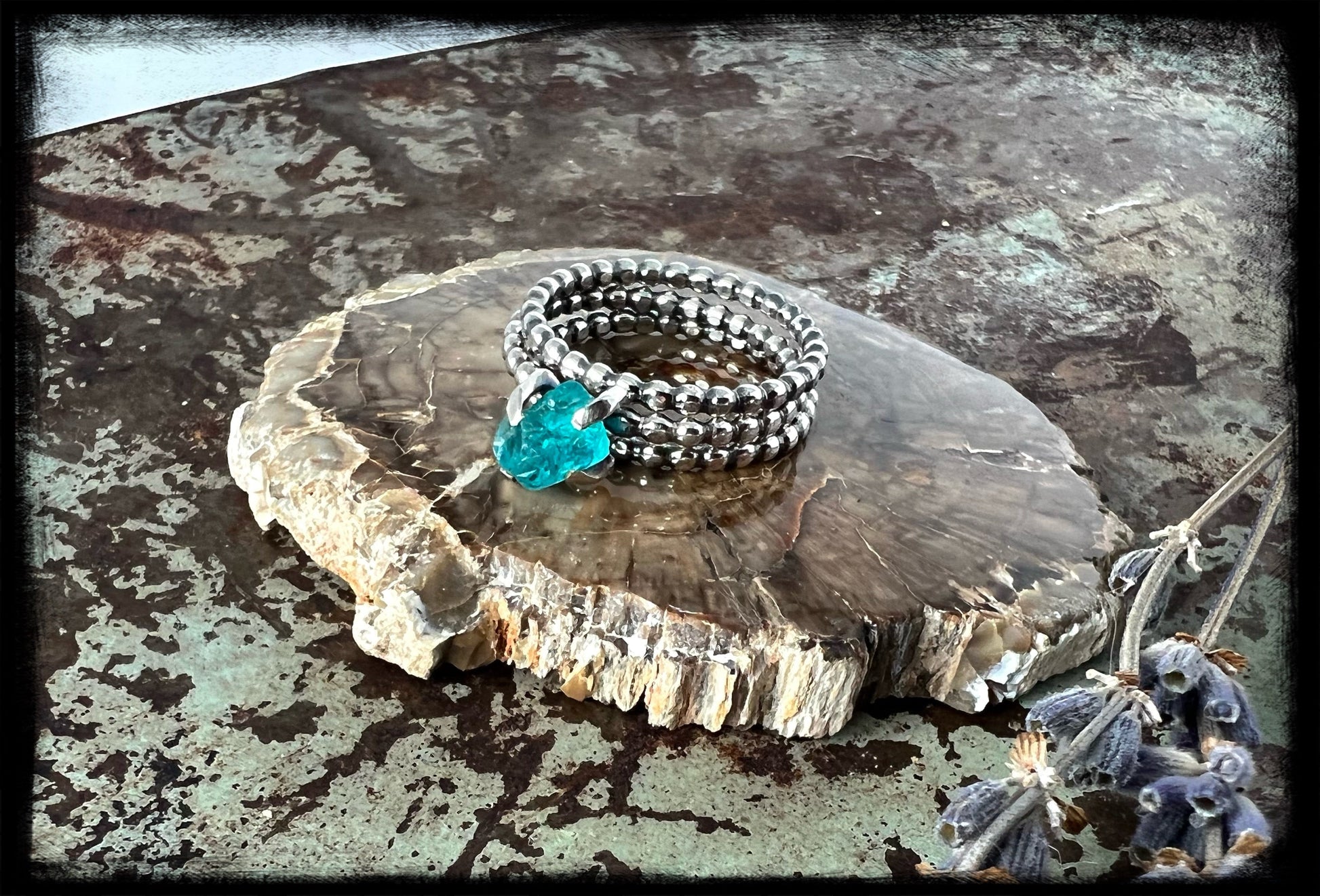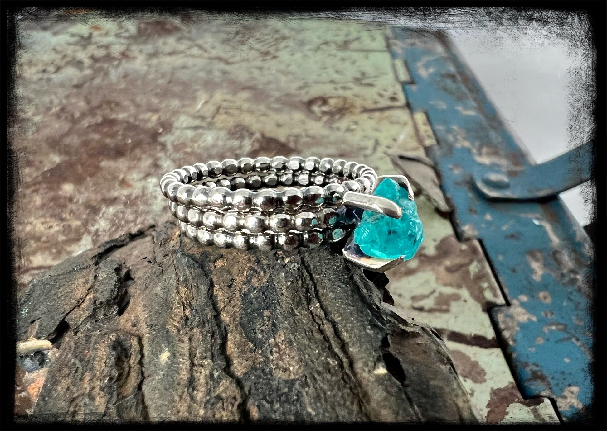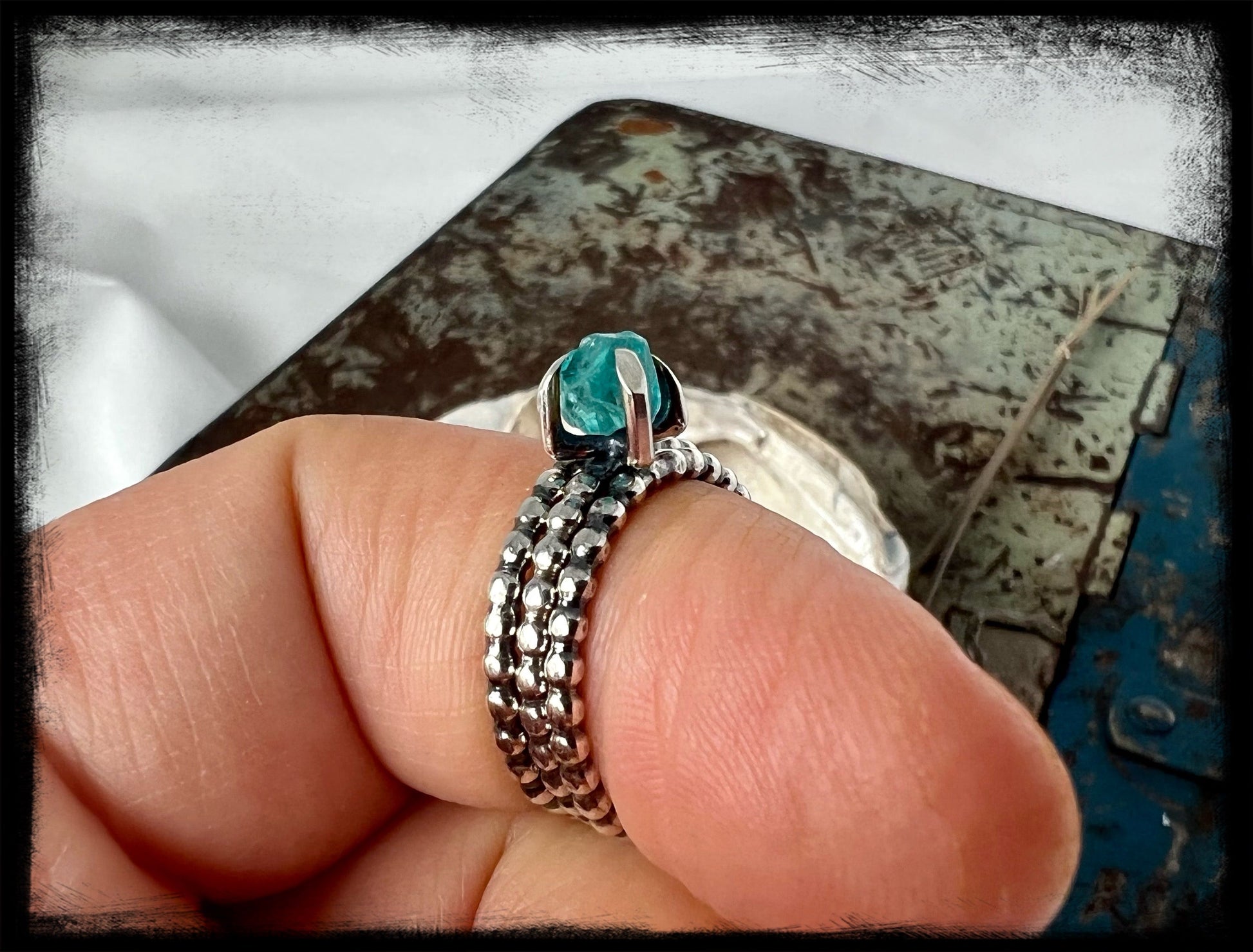 This is a beautiful stacker set, which includes one with a 6mm rough cut apatite stone. This stone has a stunning blue-green color. The ring back styles are a beaded wire design, all in sterling silve. This set comes with two plain beaded wire rings and one ring with an apatite stone. Additional plain stackers are available in your specific size in another listing if you would like to build your stack larger.