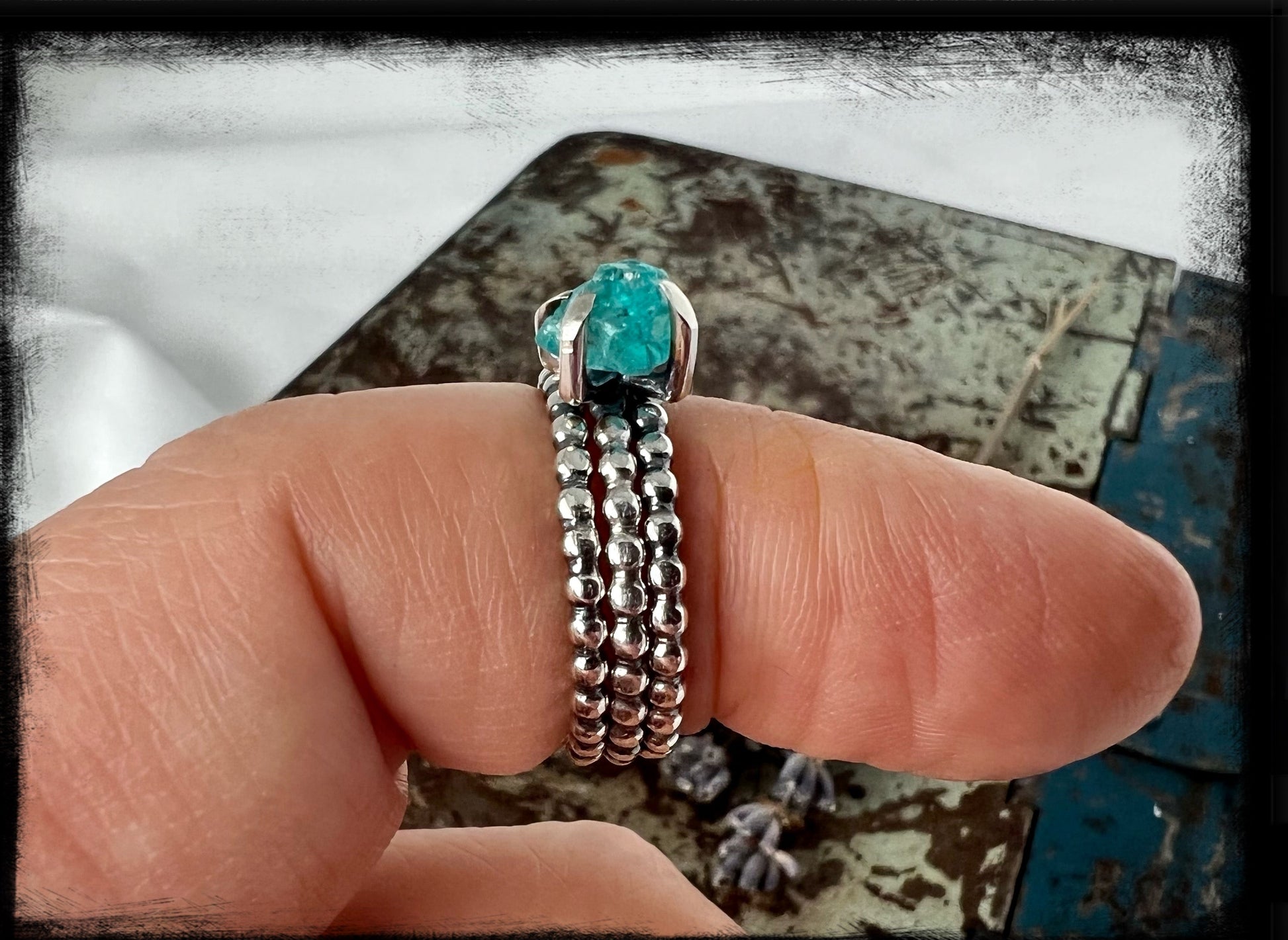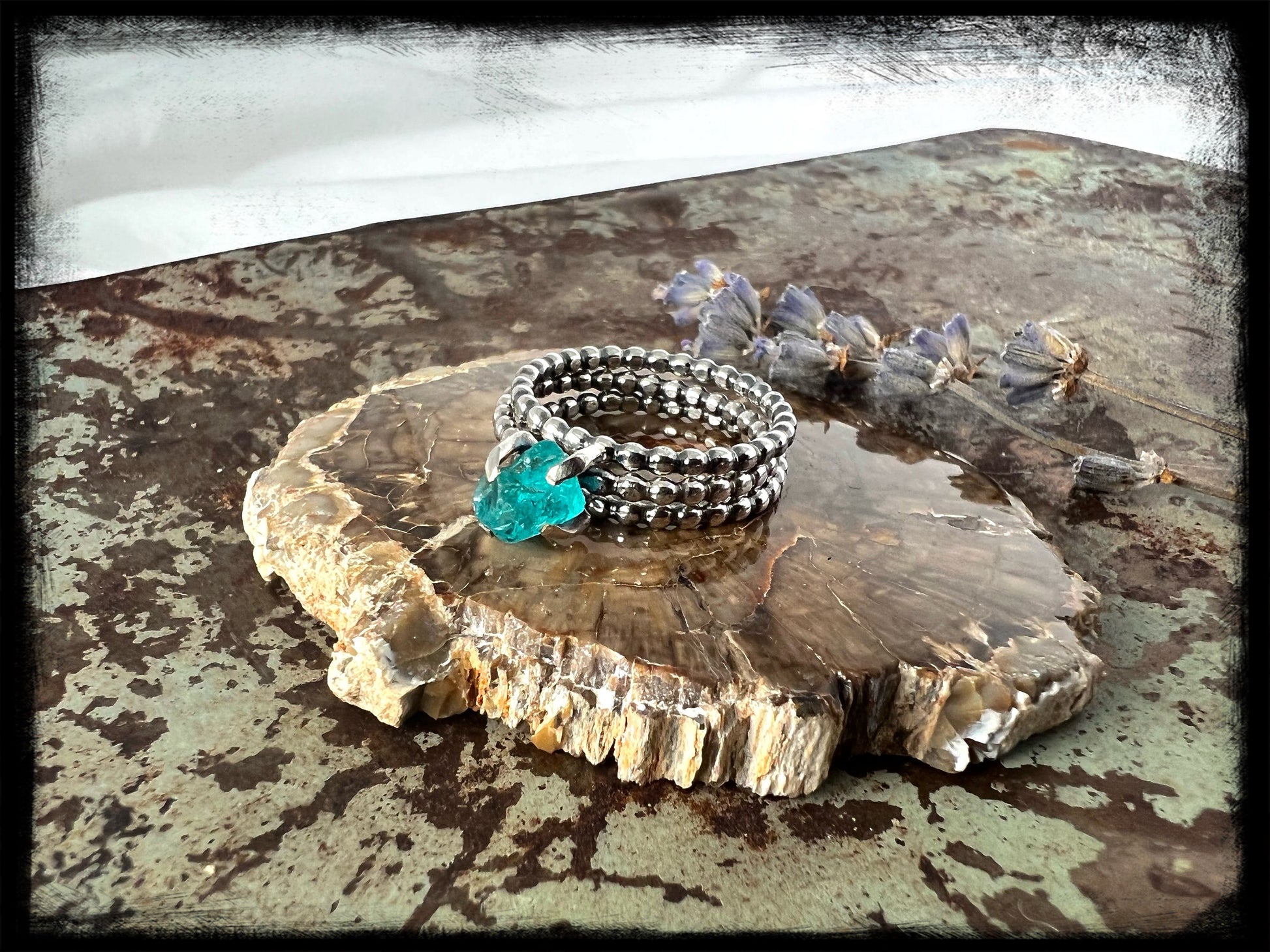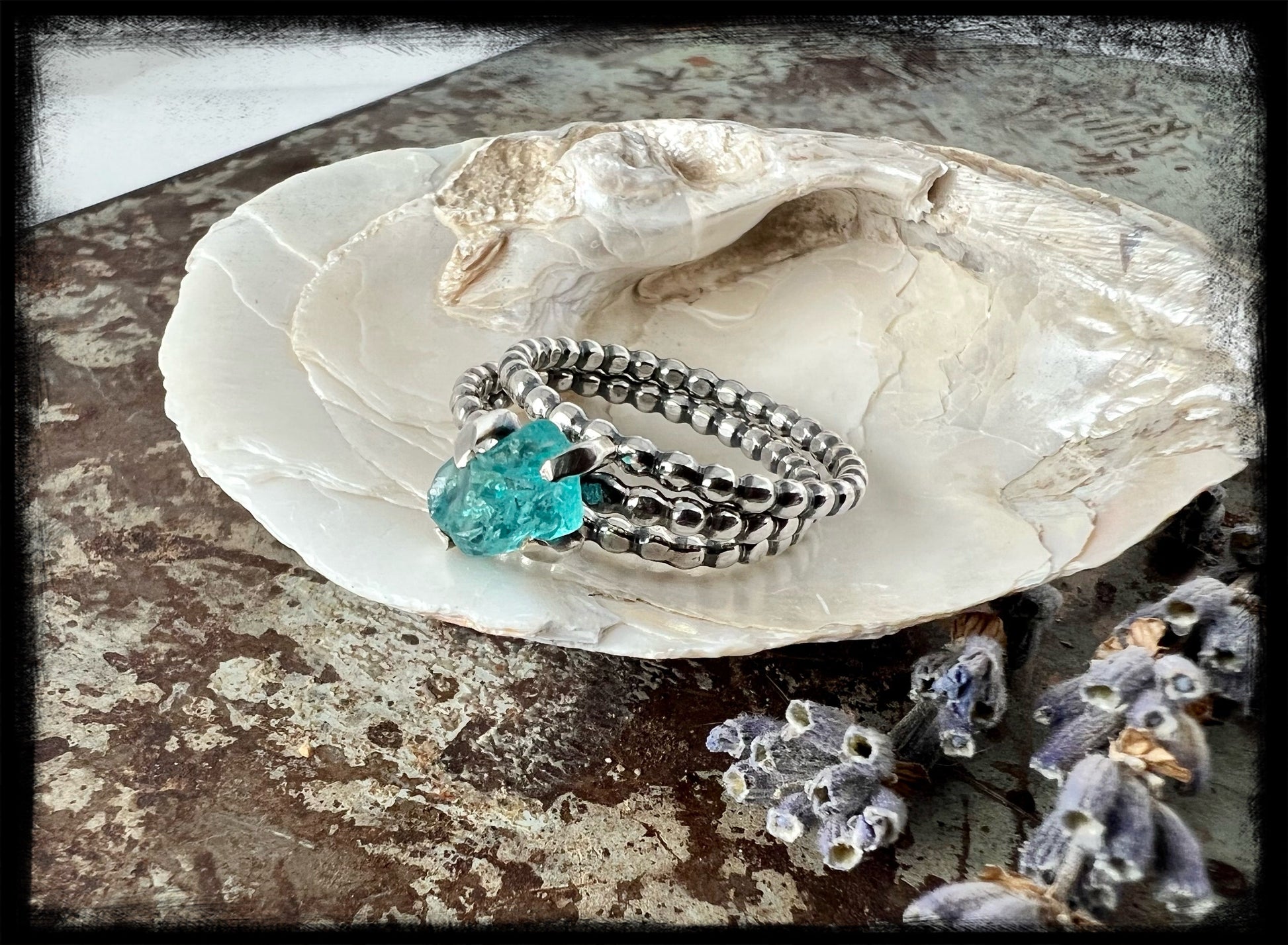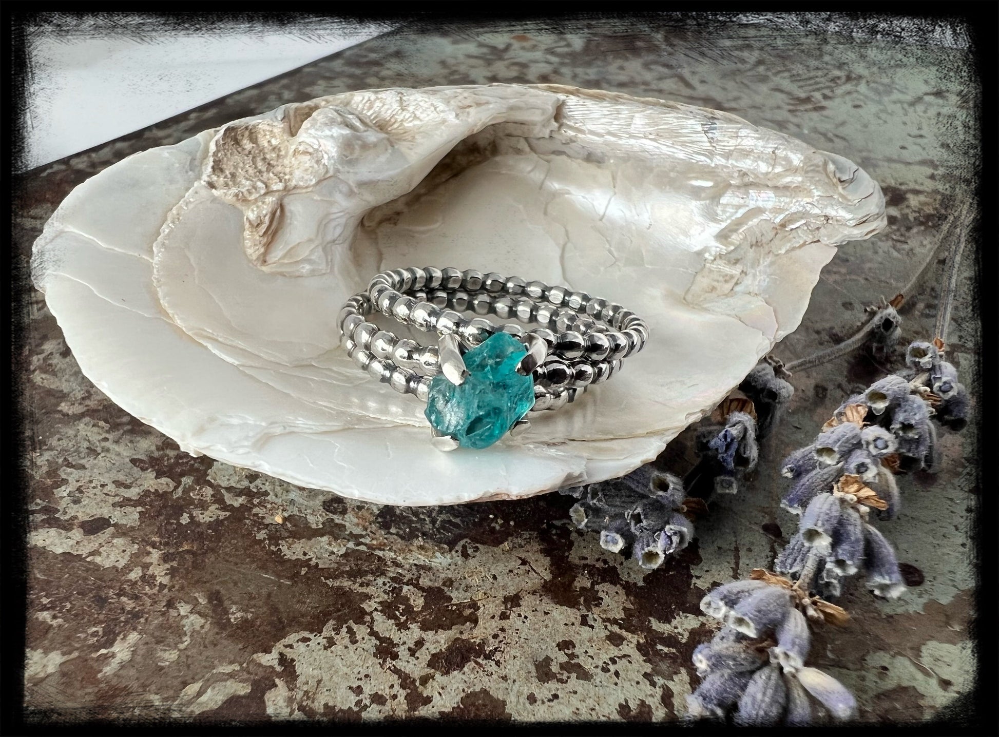 This is a beautiful stacker set, which includes one with a 6mm rough cut apatite stone. This stone has a stunning blue-green color. The ring back styles are a beaded wire design, all in sterling silve. This set comes with two plain beaded wire rings and one ring with an apatite stone. Additional plain stackers are available in your specific size in another listing if you would like to build your stack larger.