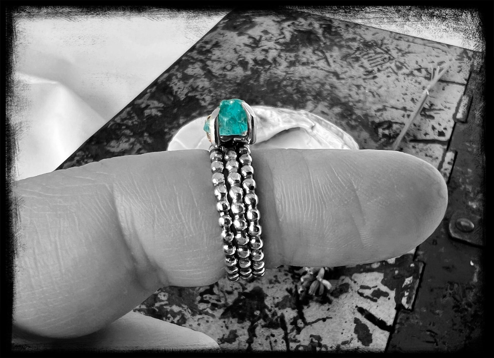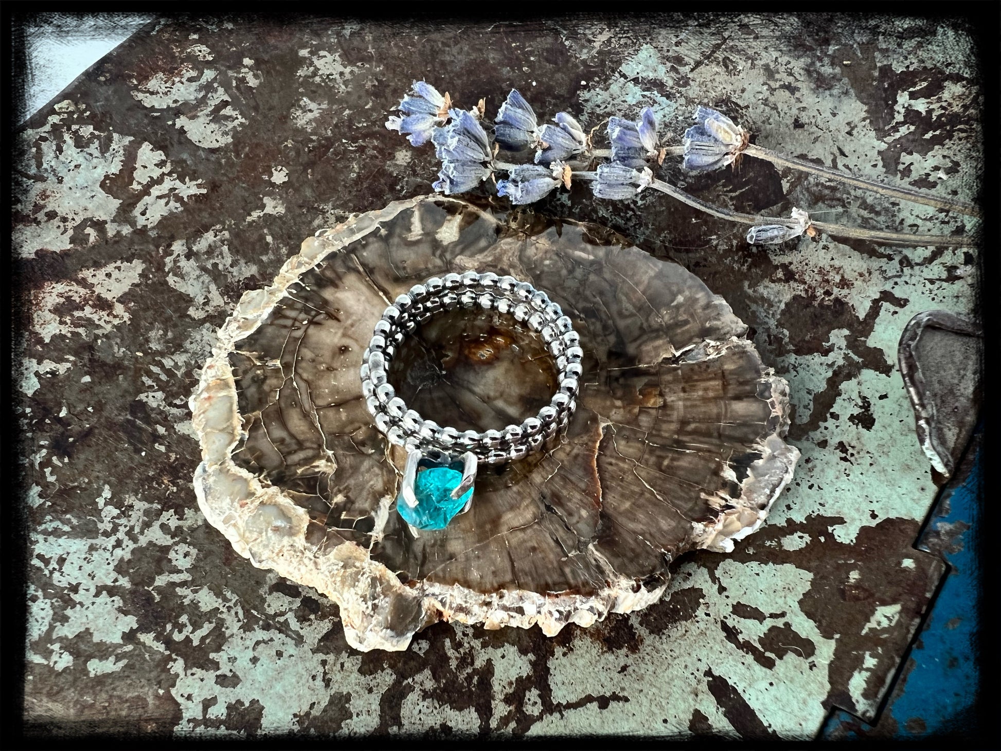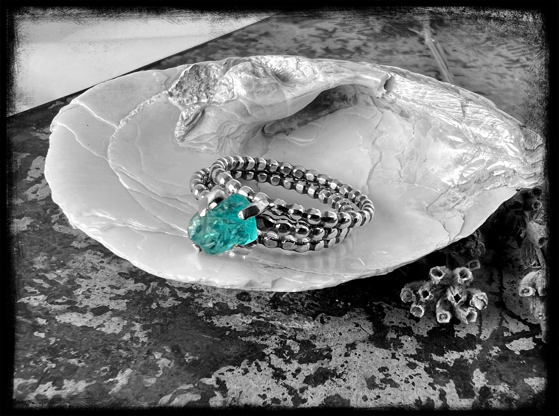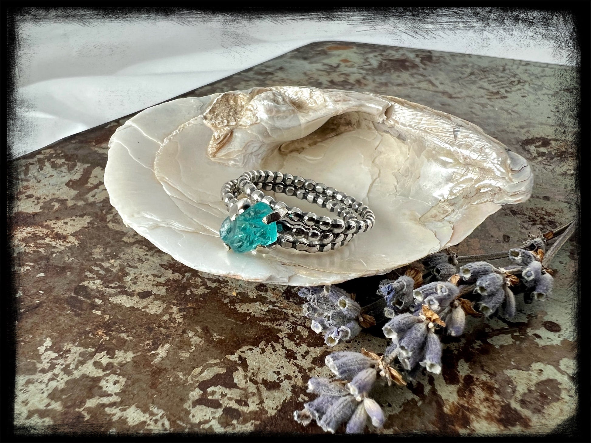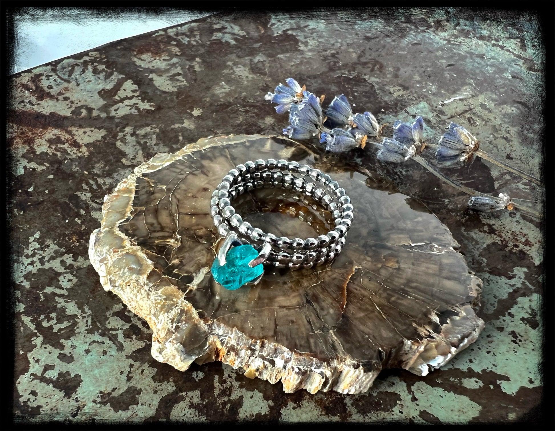 This is a beautiful stacker set, which includes one with a 6mm rough cut apatite stone. This stone has a stunning blue-green color. The ring back styles are a beaded wire design, all in sterling silve. This set comes with two plain beaded wire rings and one ring with an apatite stone. Additional plain stackers are available in your specific size in another listing if you would like to build your stack larger.