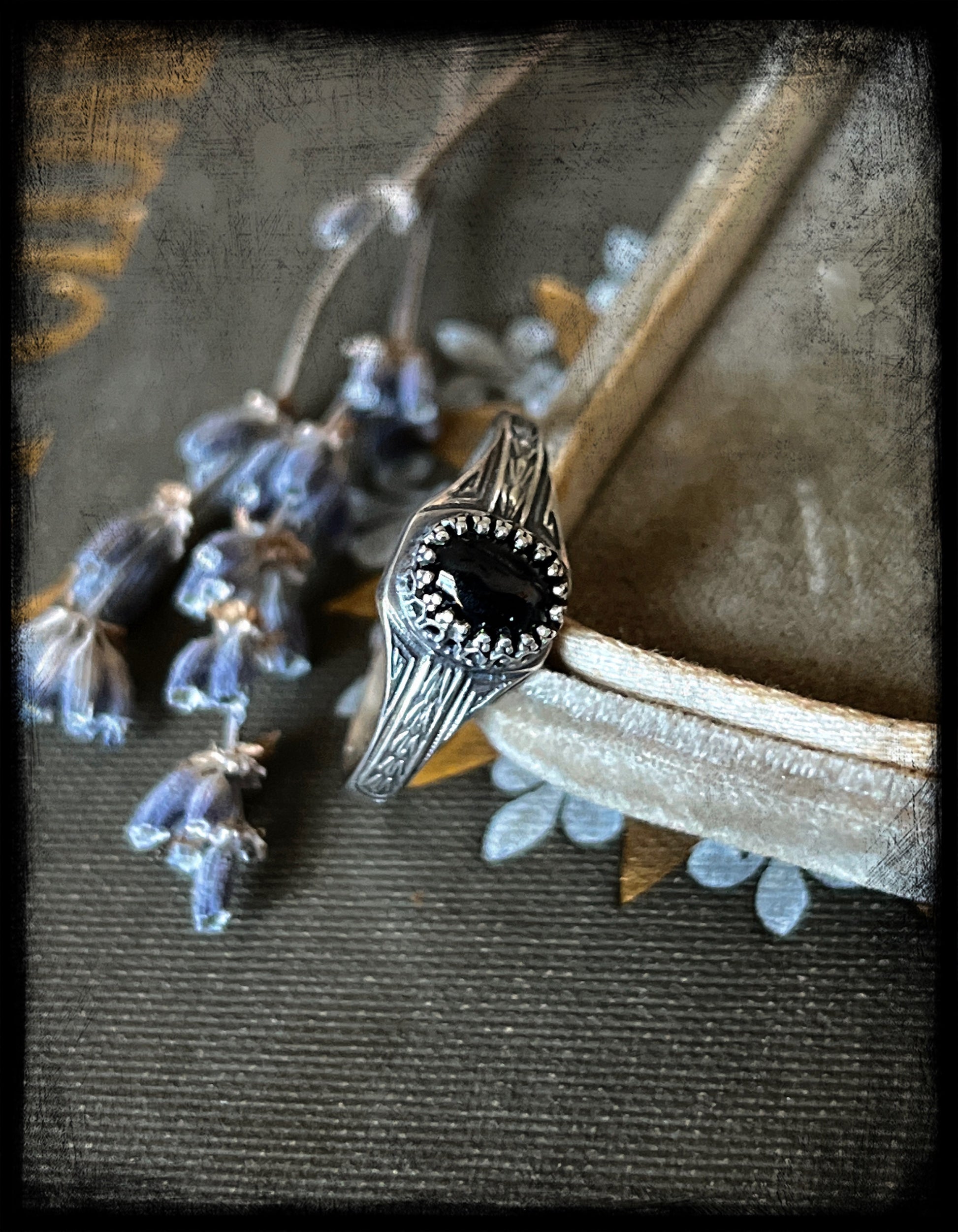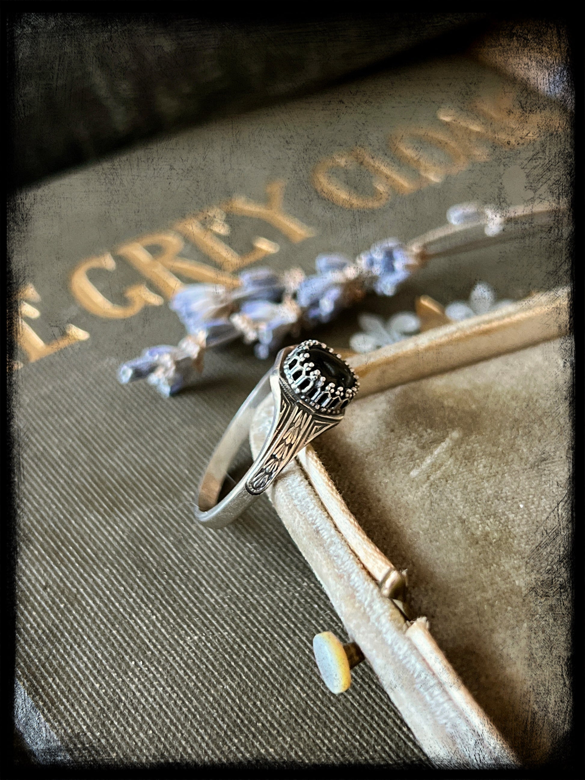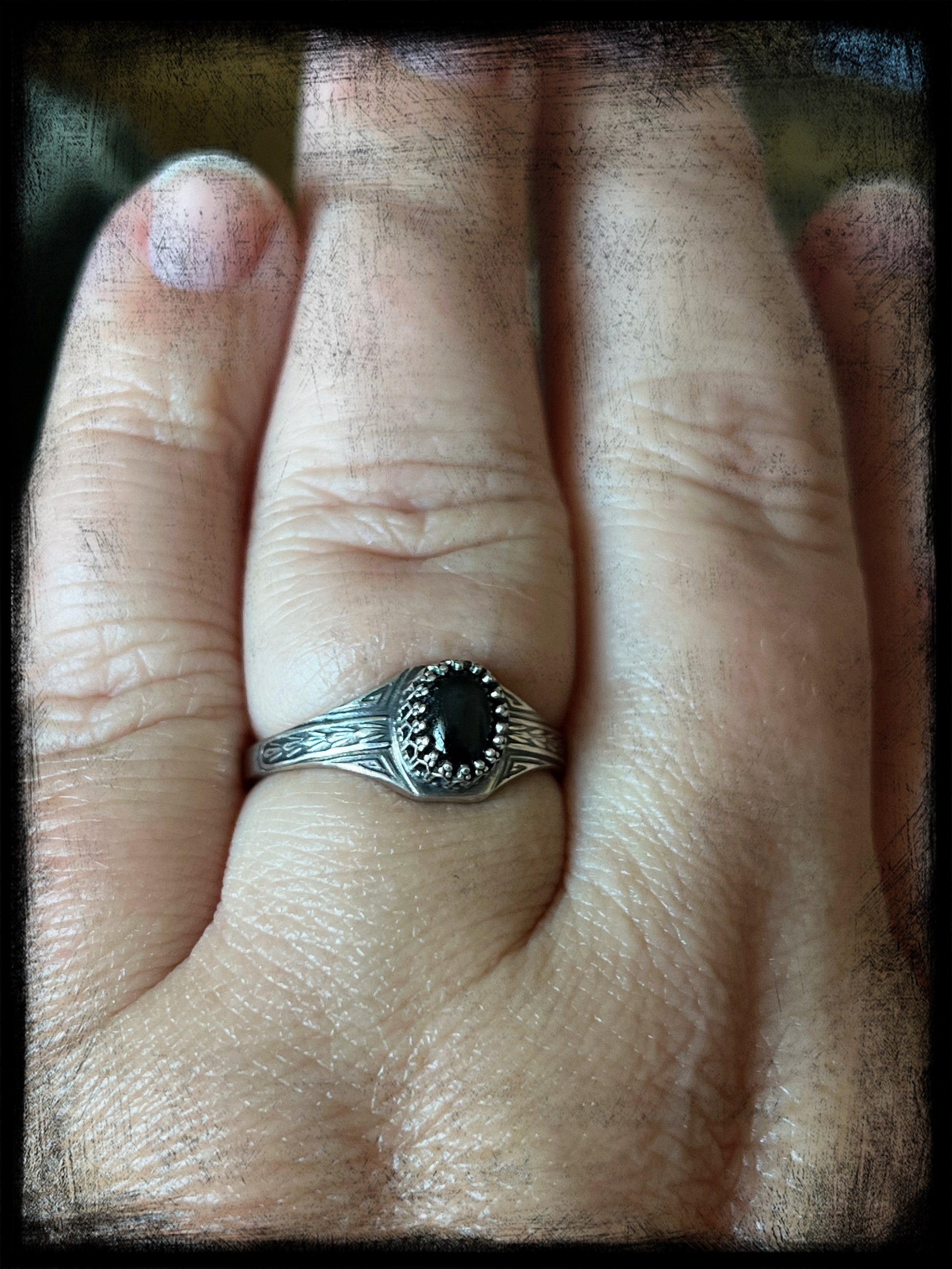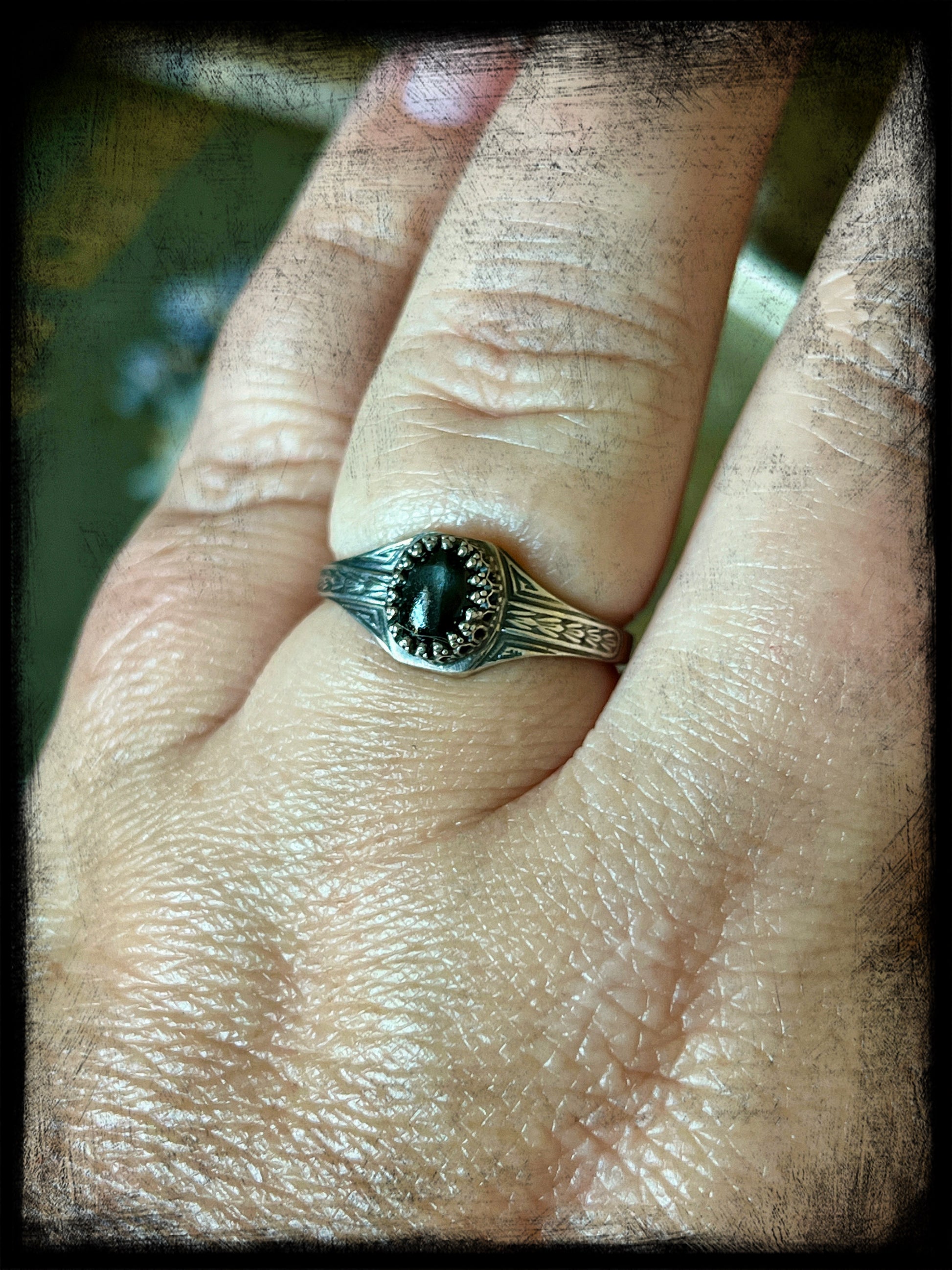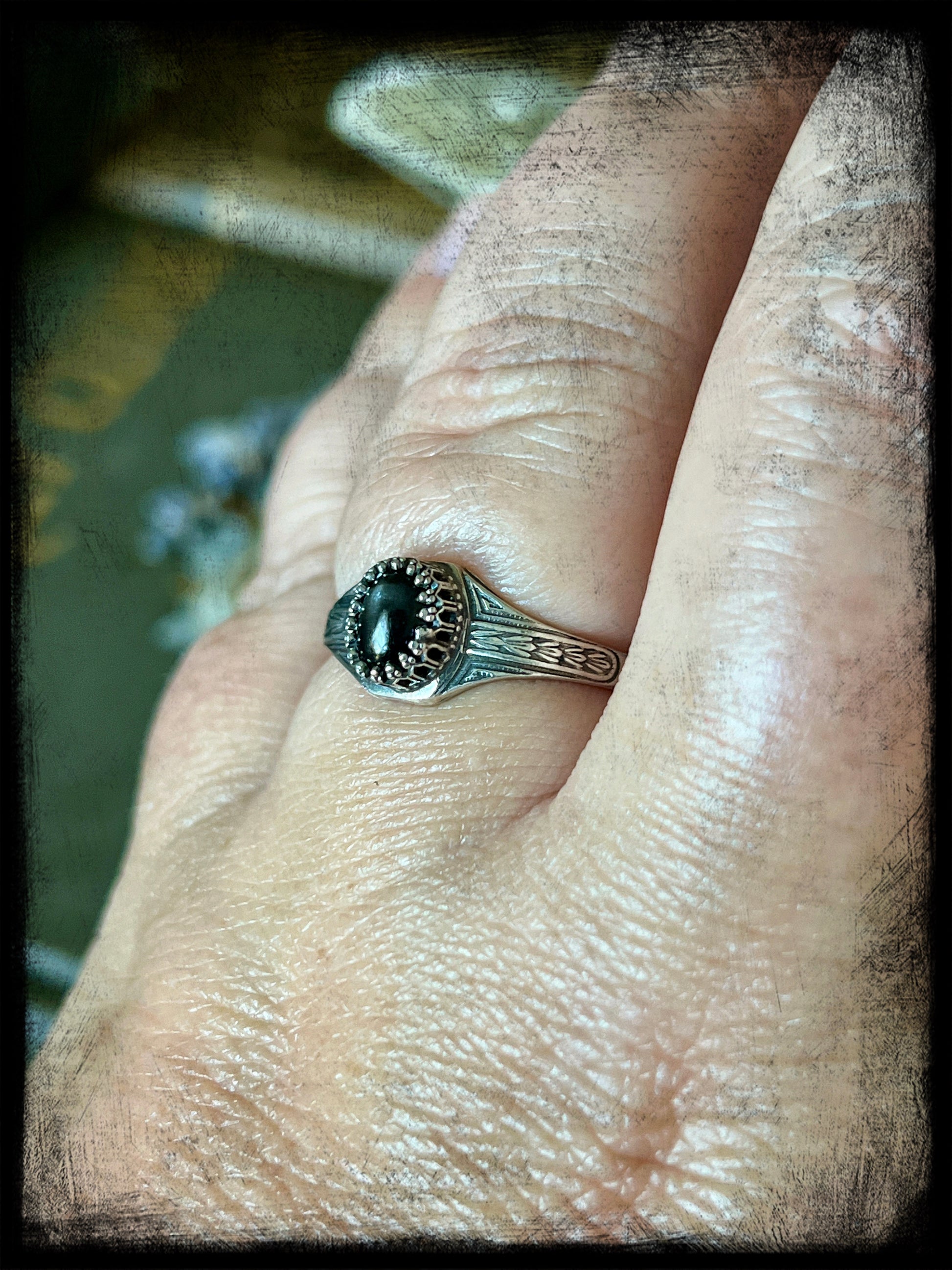 This is a beautiful black star diopside stone set in sterling silver. The ring band is an Art Deco style band created by an Art Deco era jewelry steel die. The ring measures 9US. Truly one of a kind.