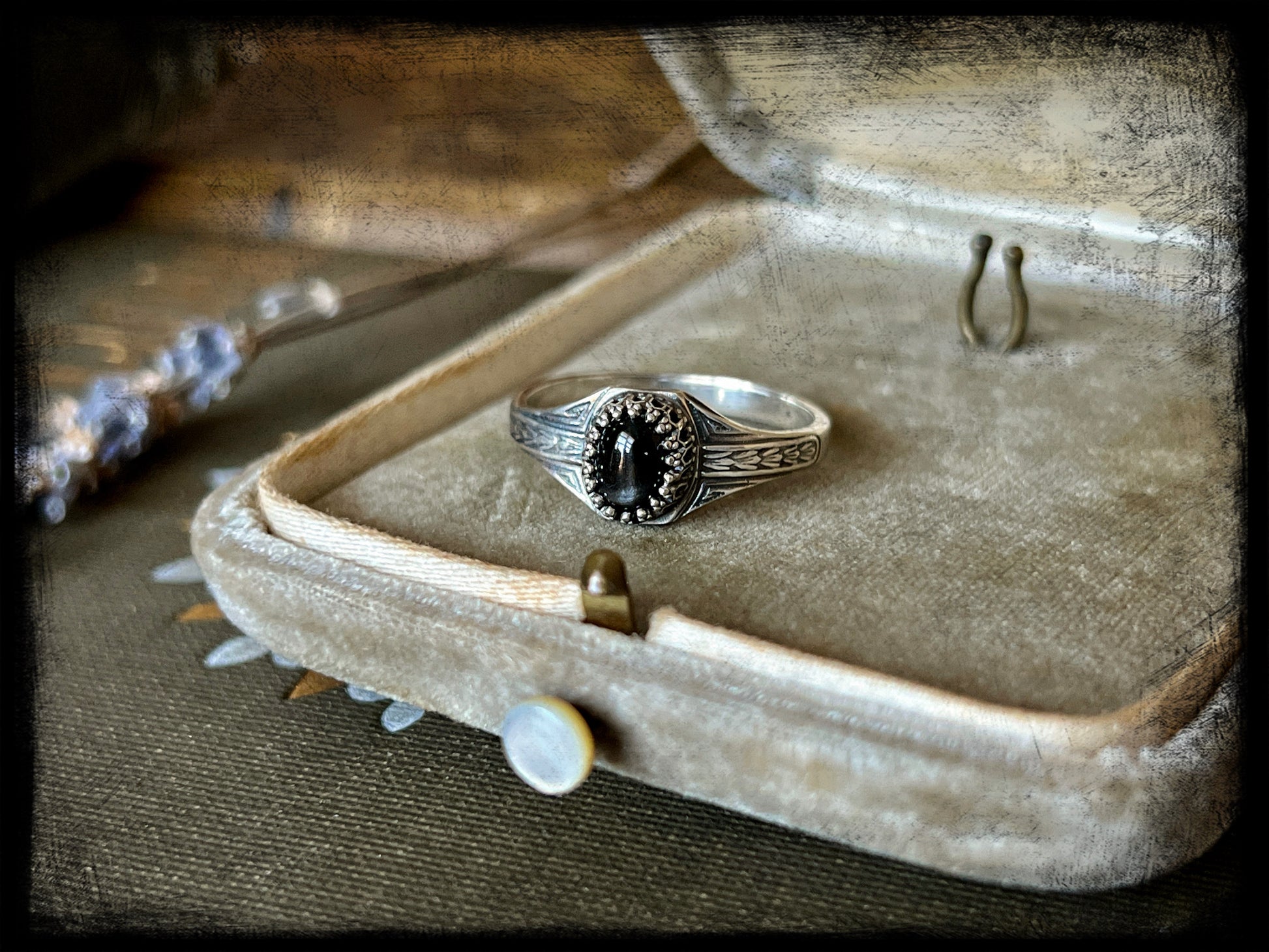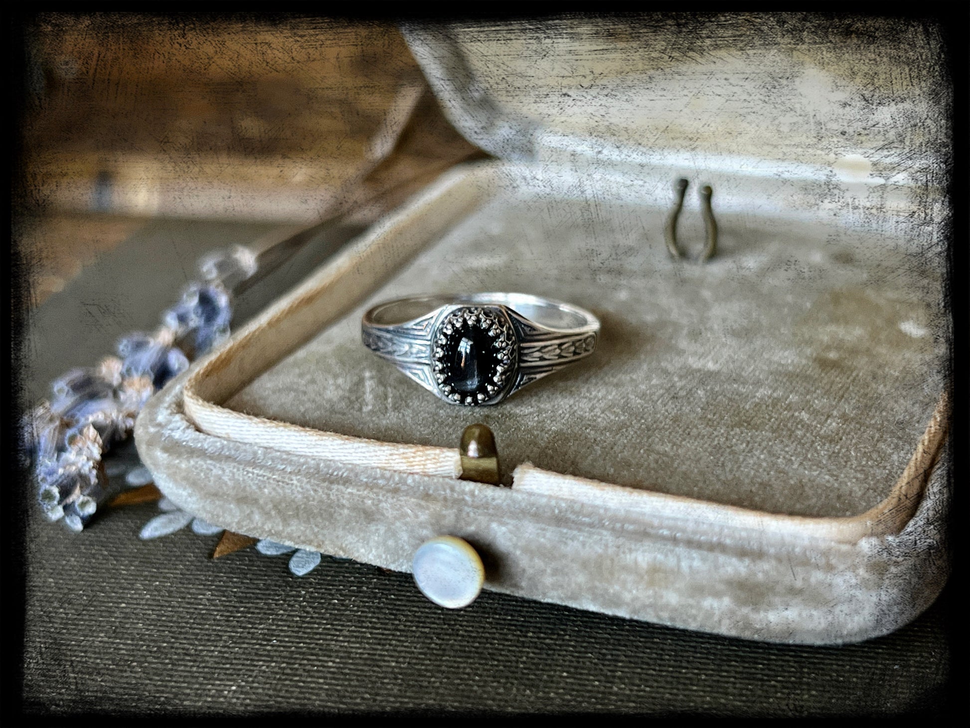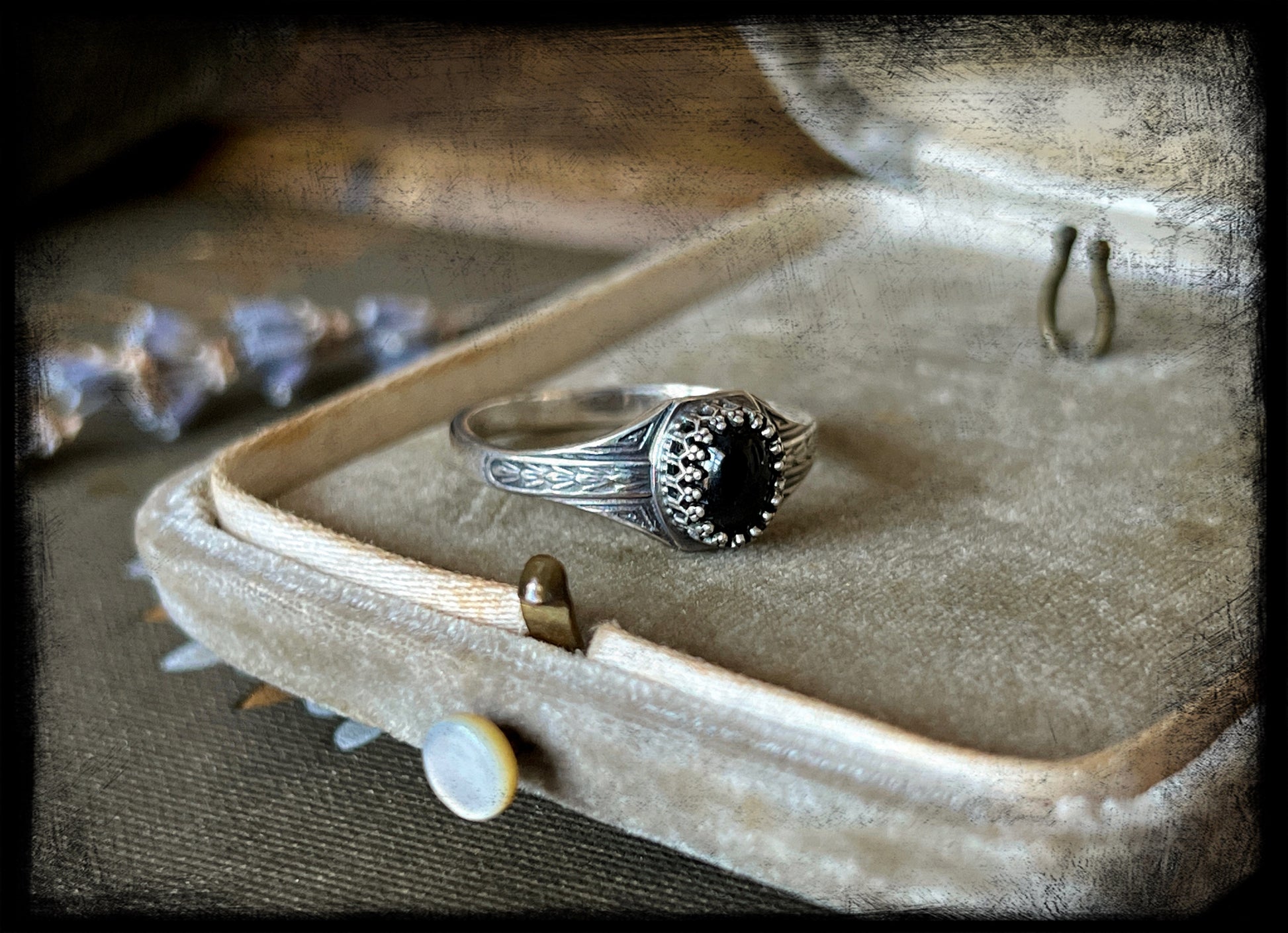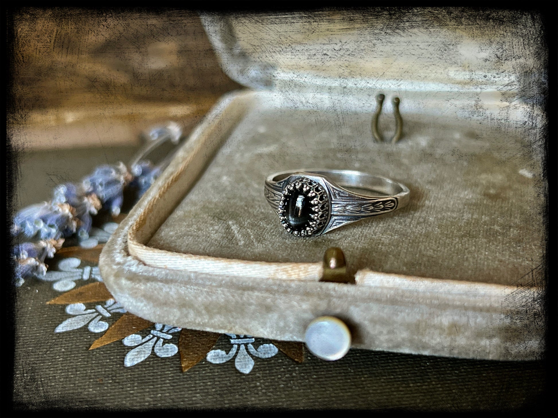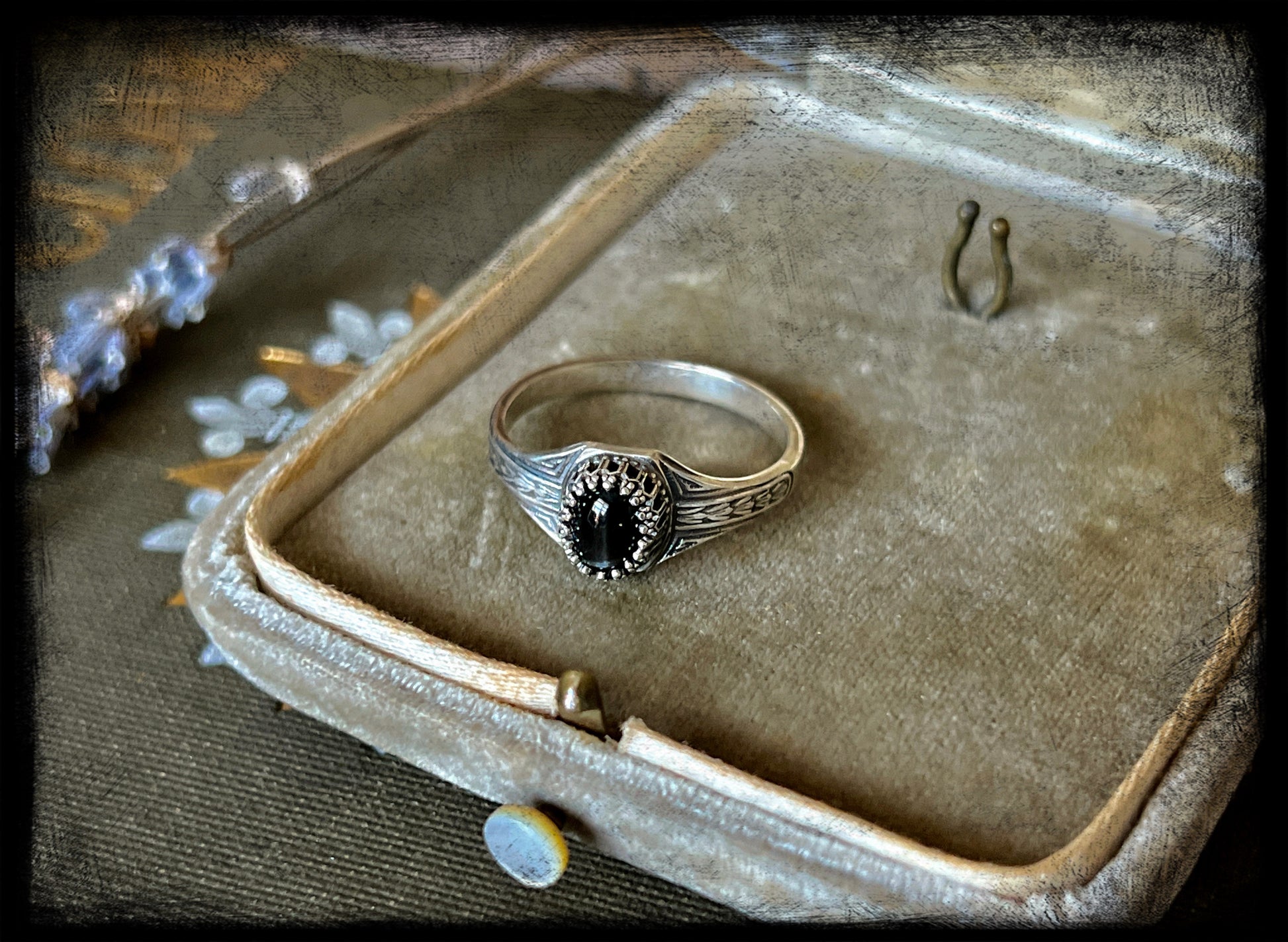 This is a beautiful black star diopside stone set in sterling silver. The ring band is an Art Deco style band created by an Art Deco era jewelry steel die. The ring measures 9US. Truly one of a kind.