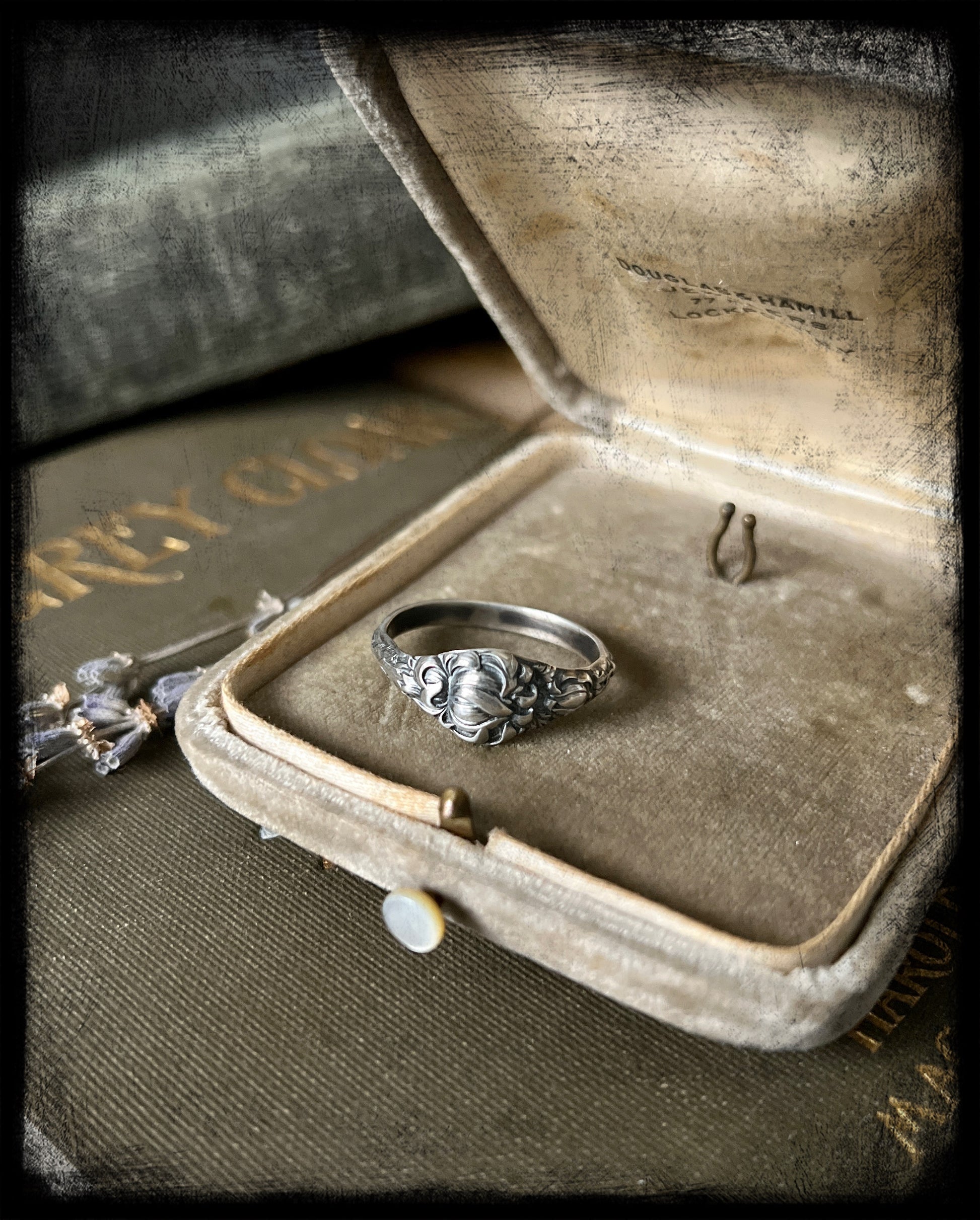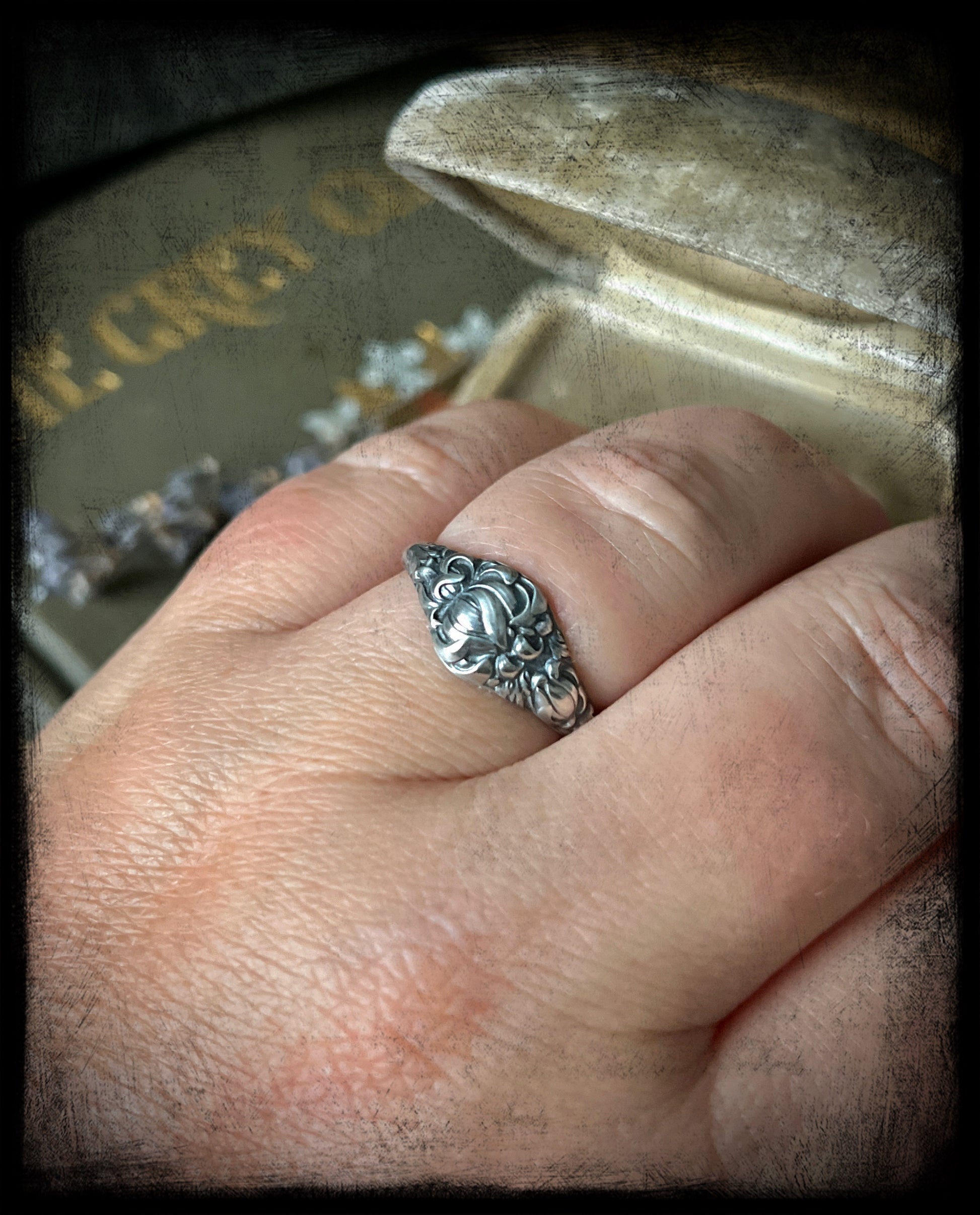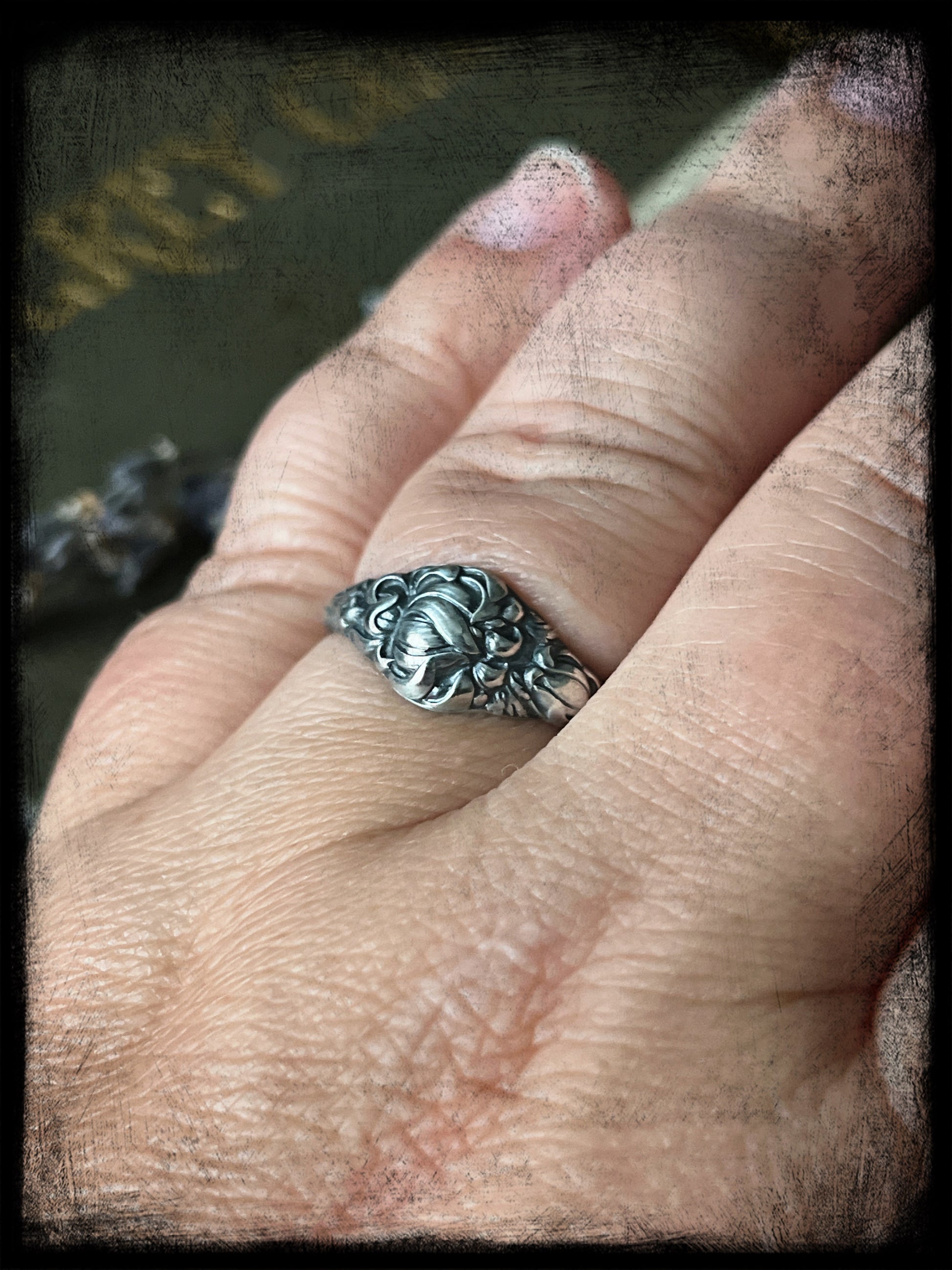 This is a beautiful Chrysanthemum Flower Birth Month Ring representing the month of November. This ring is part of a series of birth flower rings made from a steel die from the early 20th century. These are truly one of a kind.