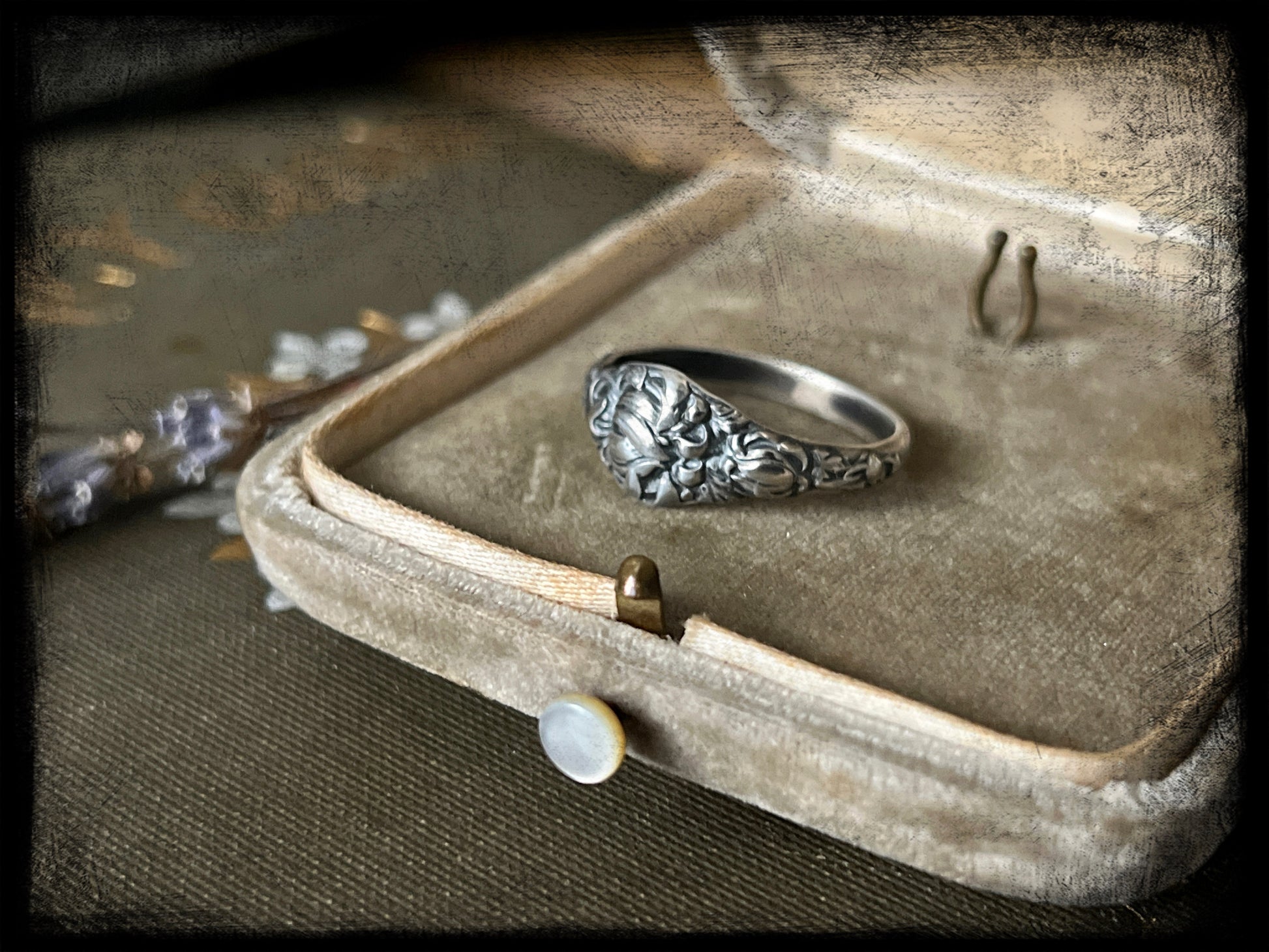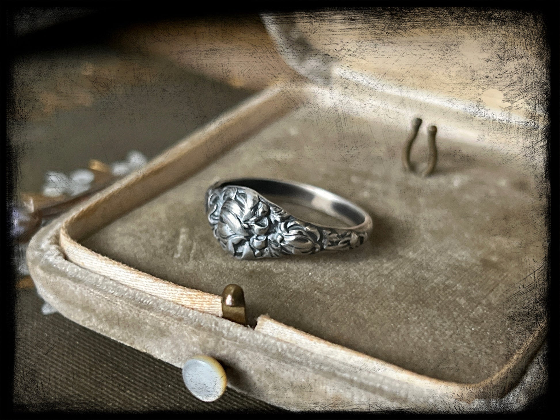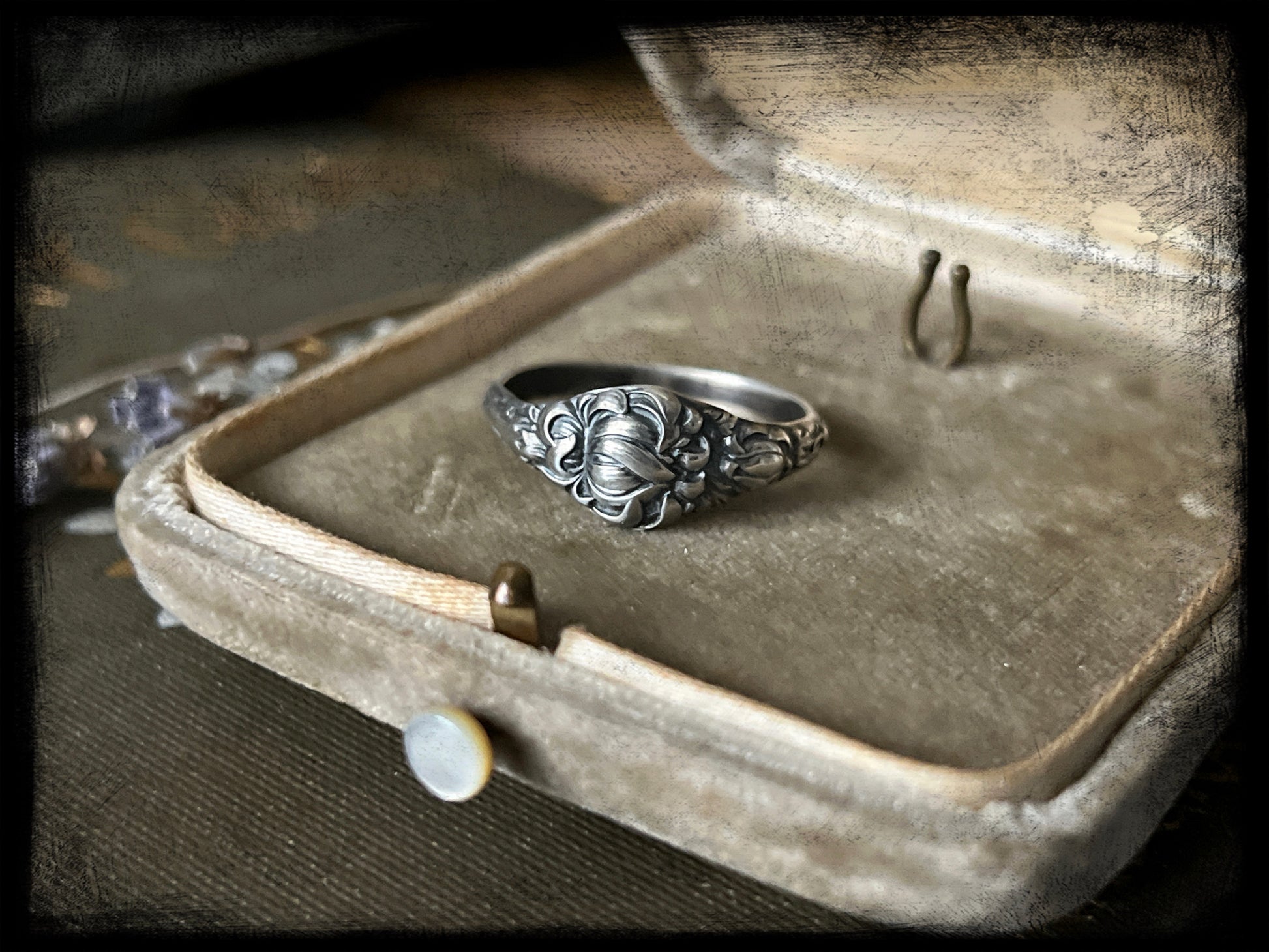 This is a beautiful Chrysanthemum Flower Birth Month Ring representing the month of November. This ring is part of a series of birth flower rings made from a steel die from the early 20th century. These are truly one of a kind.