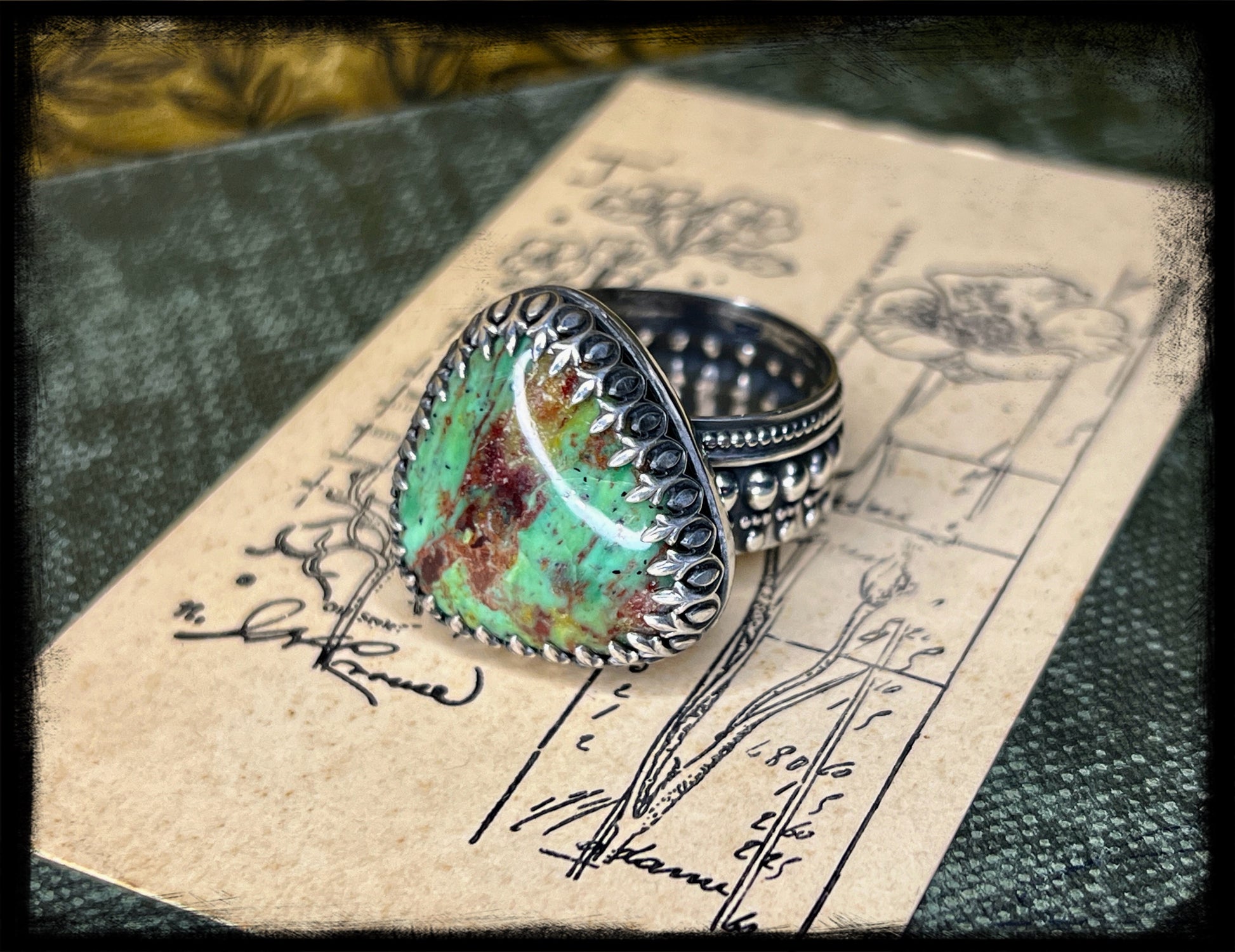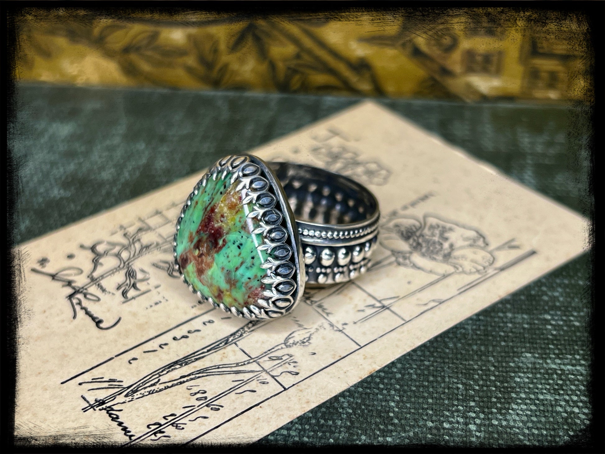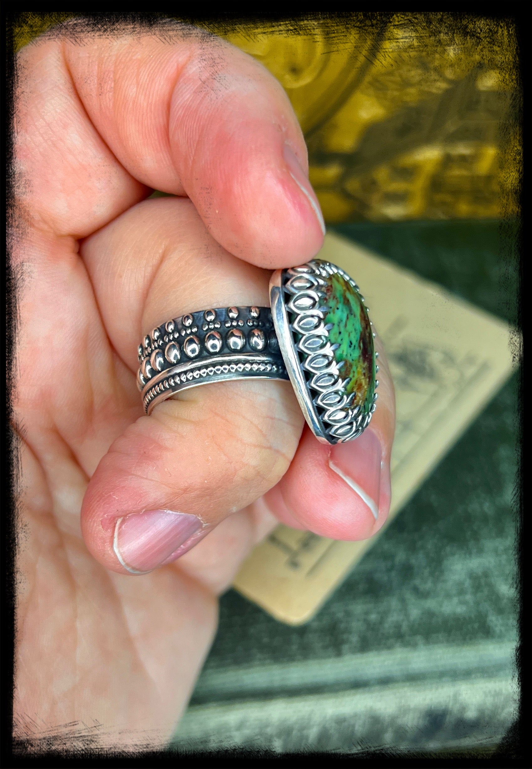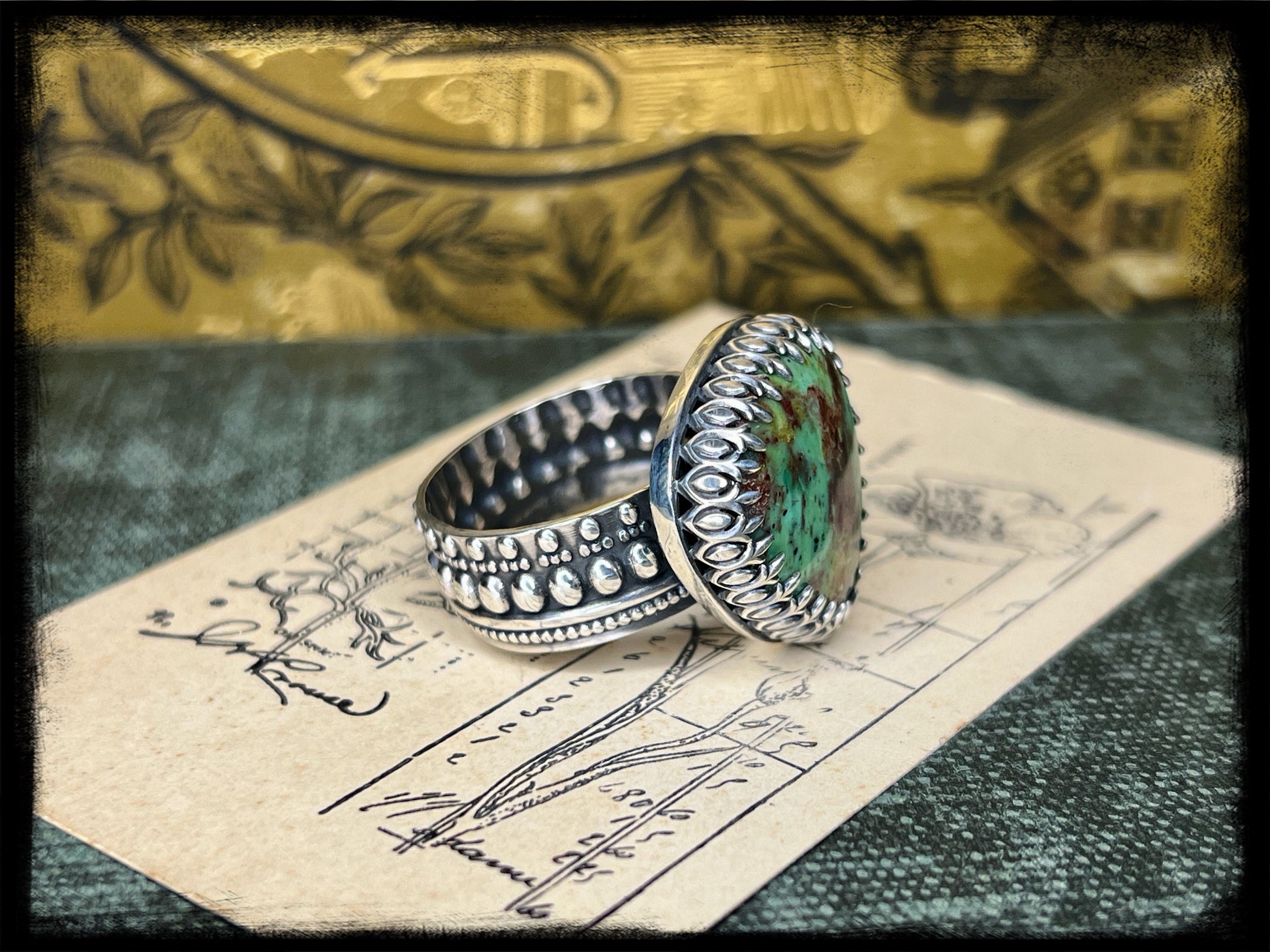 Whether paired with flowing fabrics and floral prints or layered with other eclectic pieces, this Chrysocolla ring set captures the essence of bohemian elegance and adds a touch of magic to any ensemble.