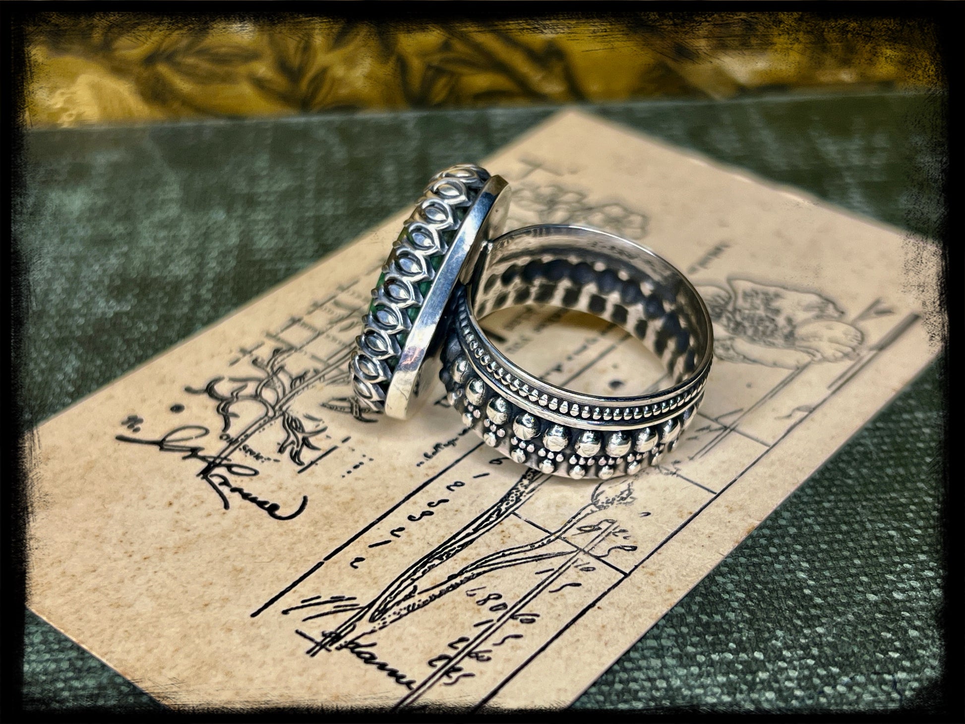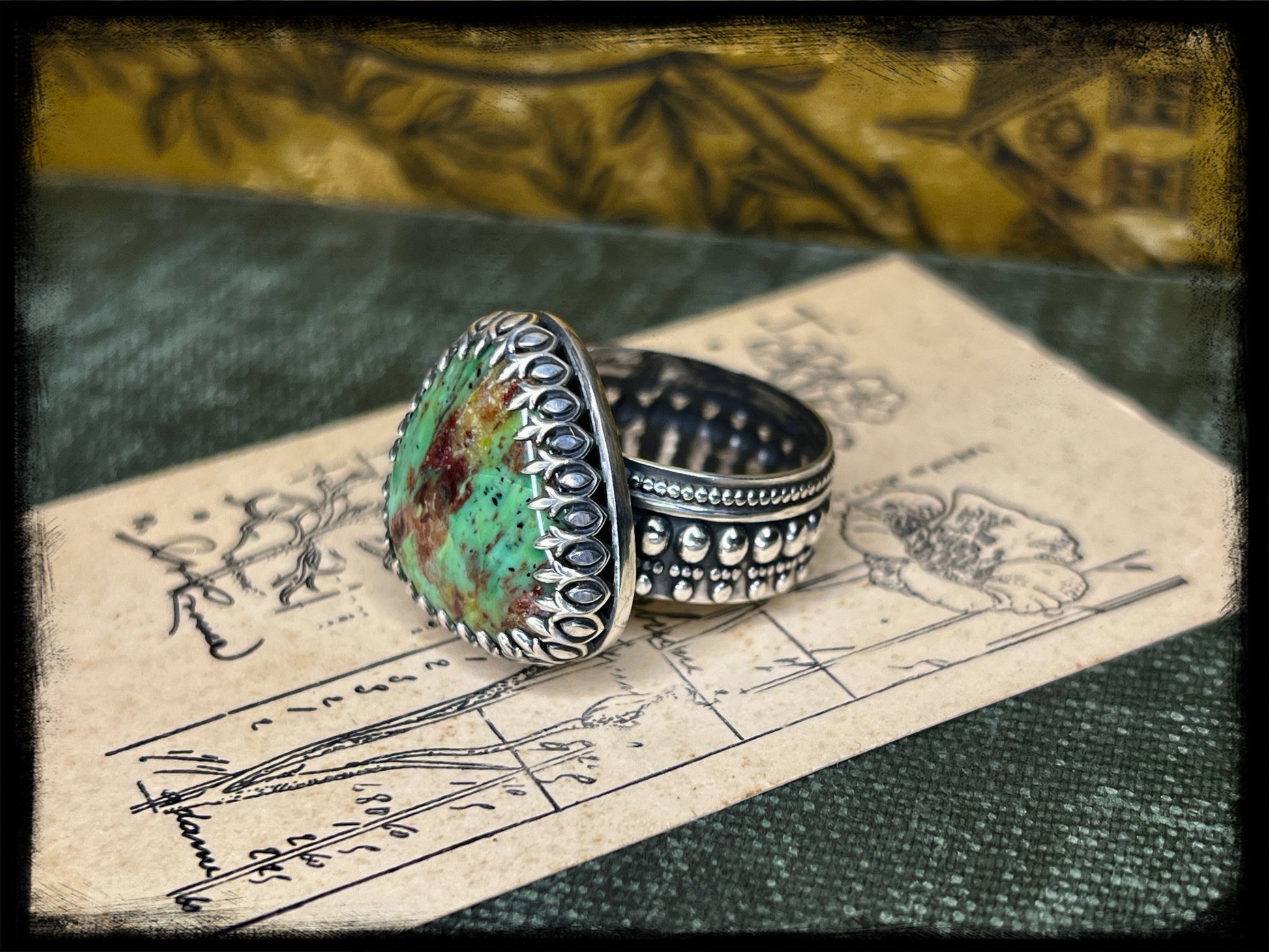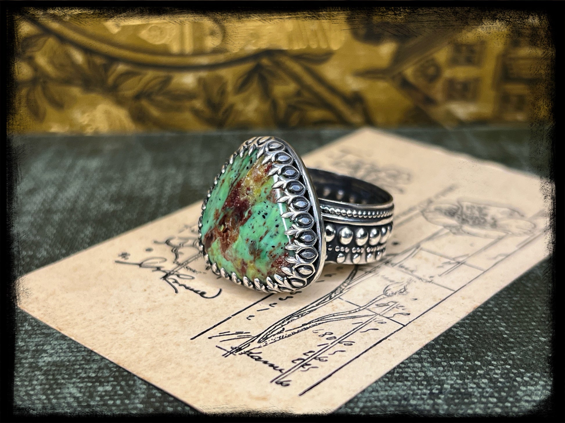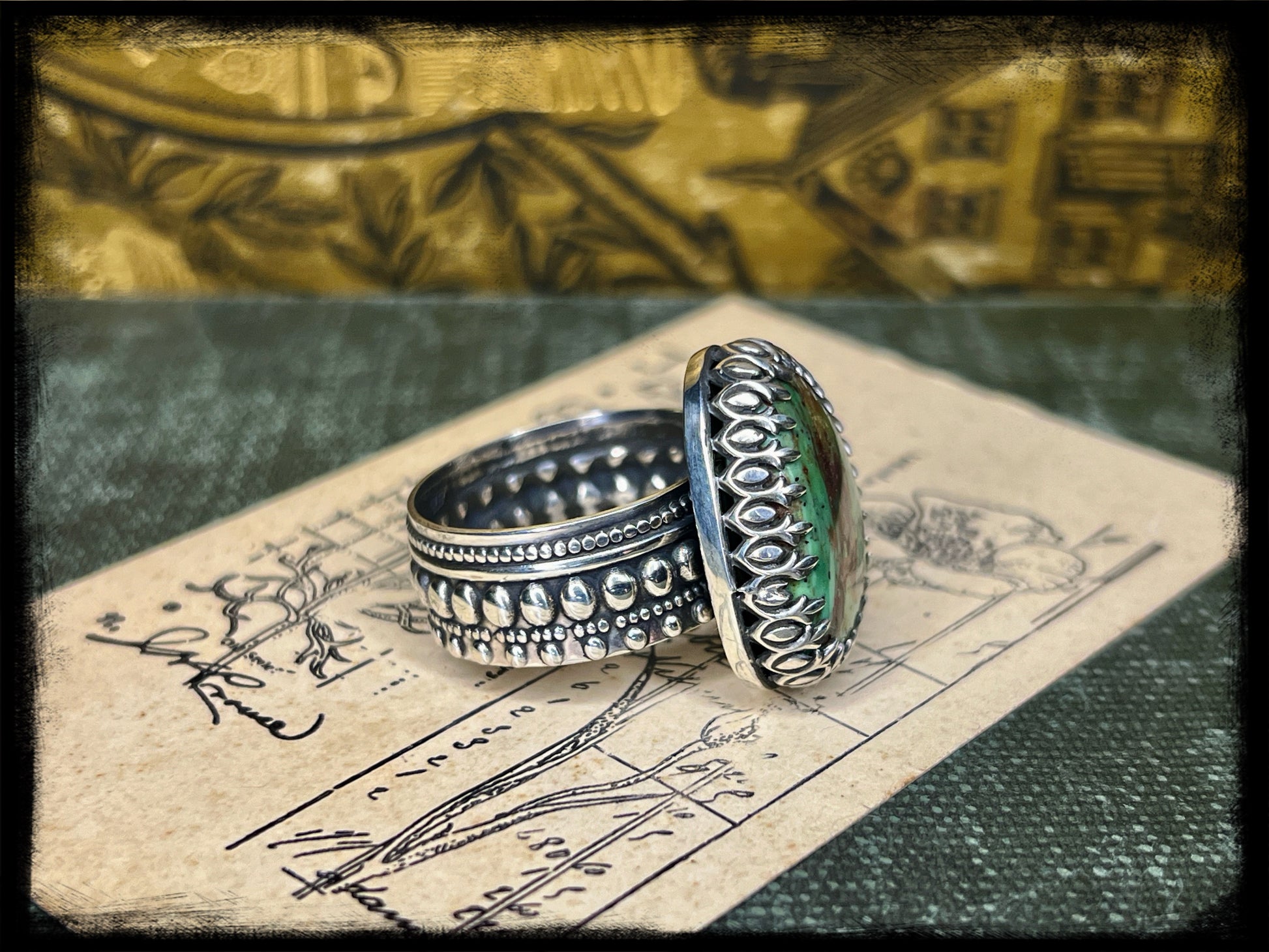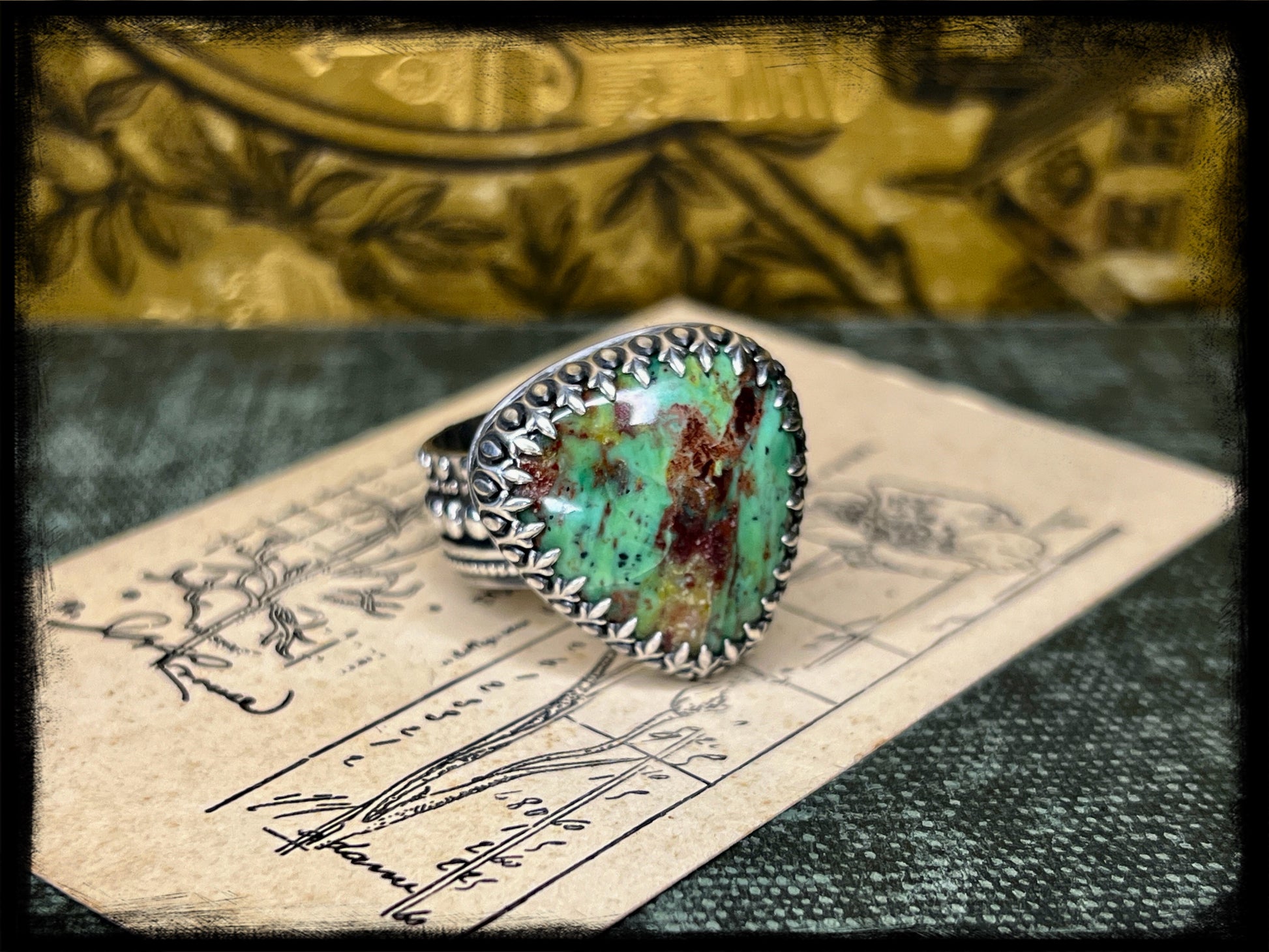 Whether paired with flowing fabrics and floral prints or layered with other eclectic pieces, this Chrysocolla ring set captures the essence of bohemian elegance and adds a touch of magic to any ensemble.