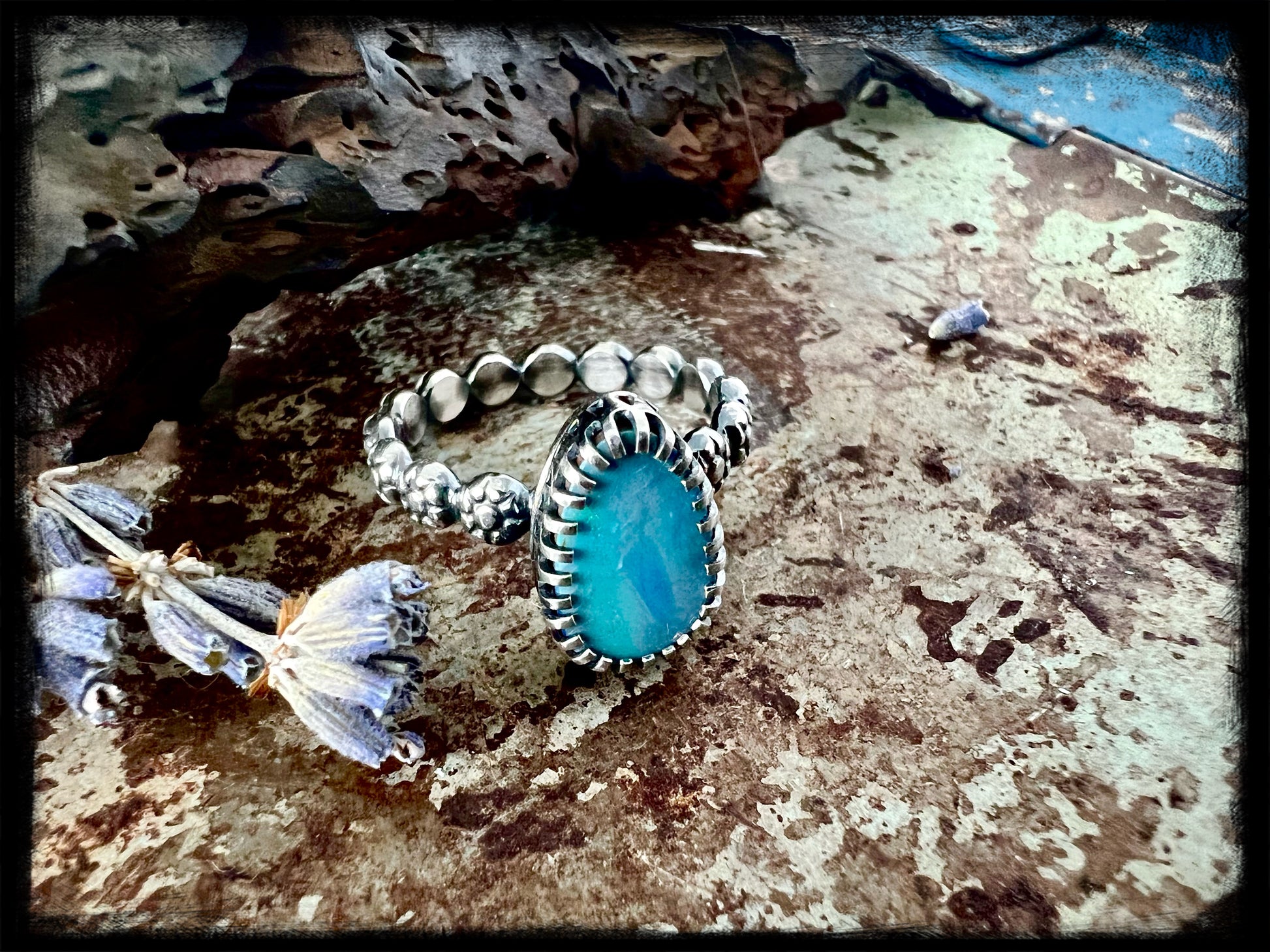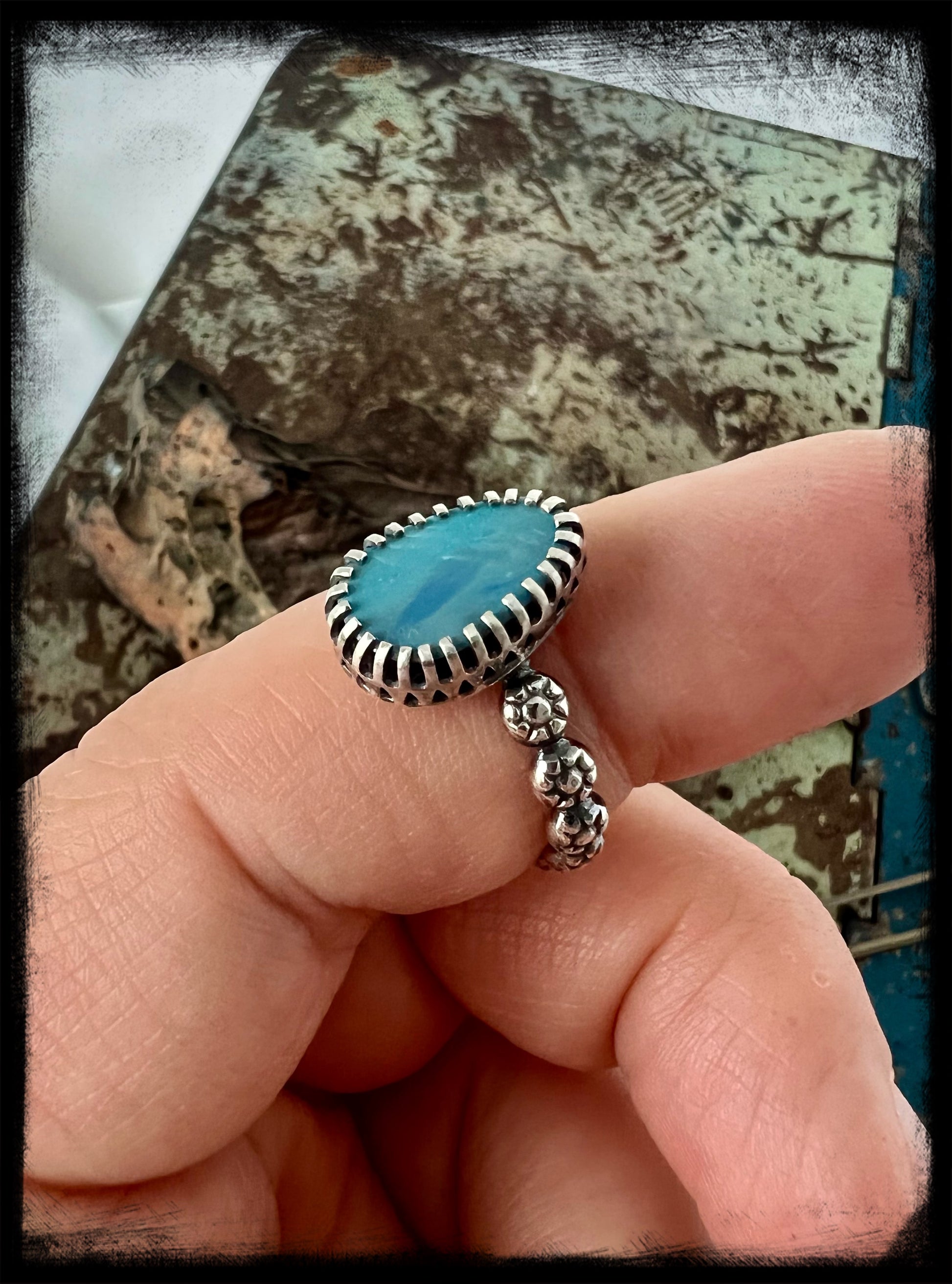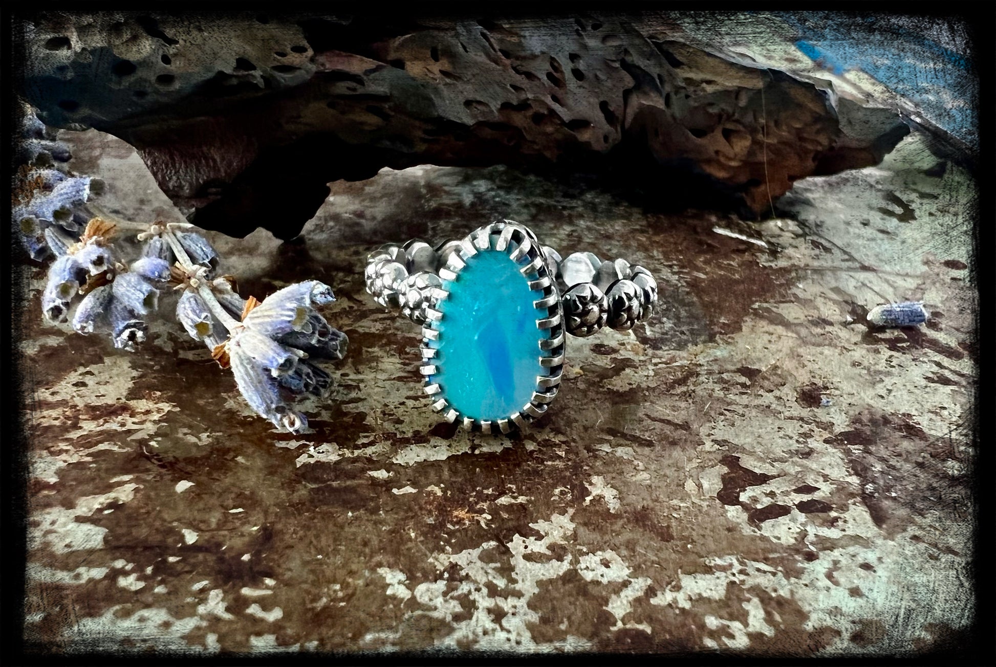 This is a beautiful blue opal doublet set in sterling silver with a berry beaded ring band measuring a US 8.5. The stone is a beautiful light blue with a ton of iridescence and measures 1/2" tall by 3/8"" wide. The ring has a beautiful satin finish but can also be polish for a shinier finish if desired. Just let me know at check out.