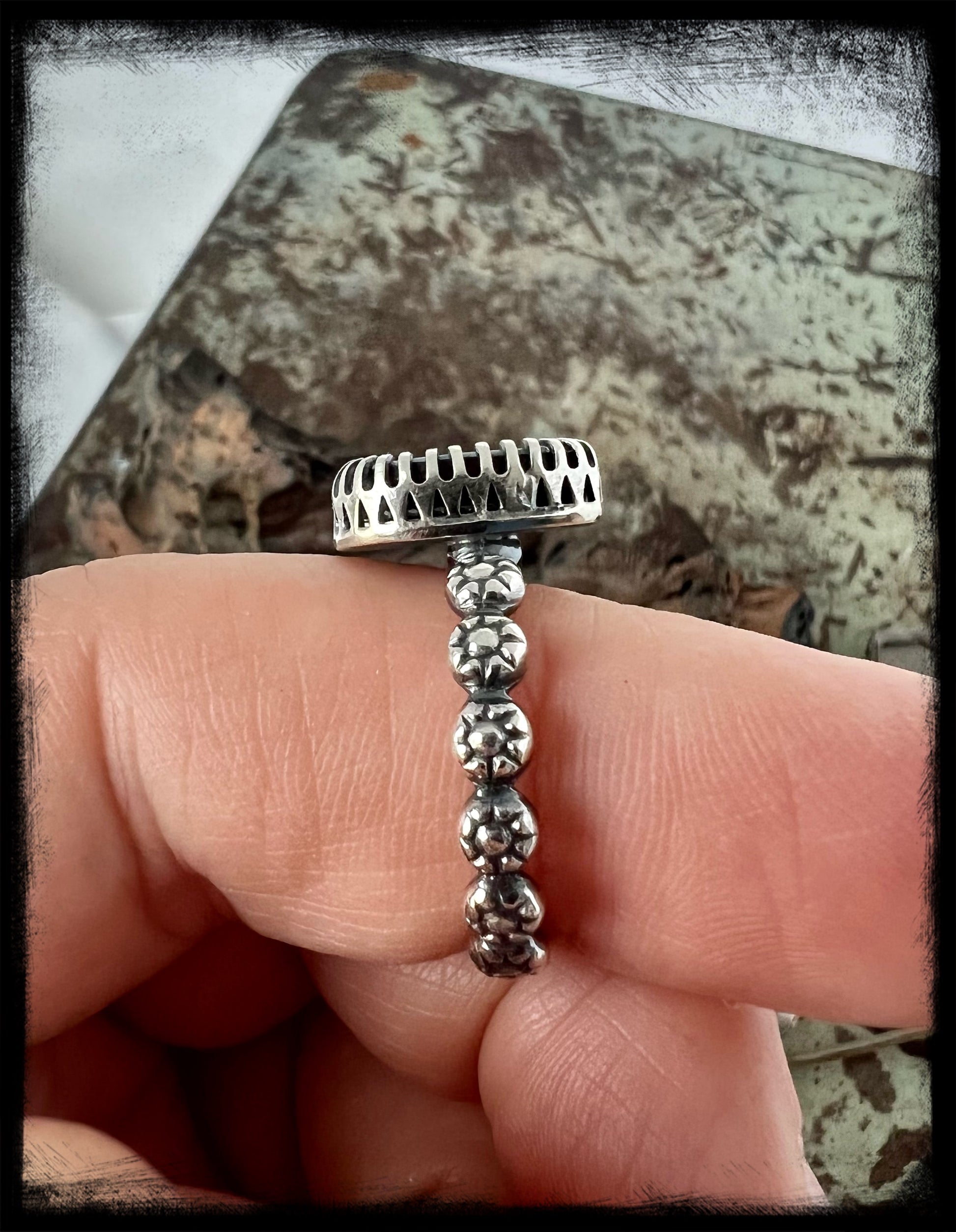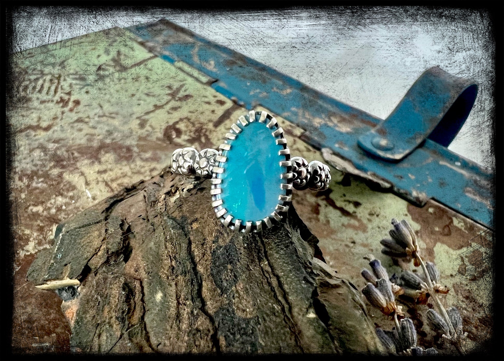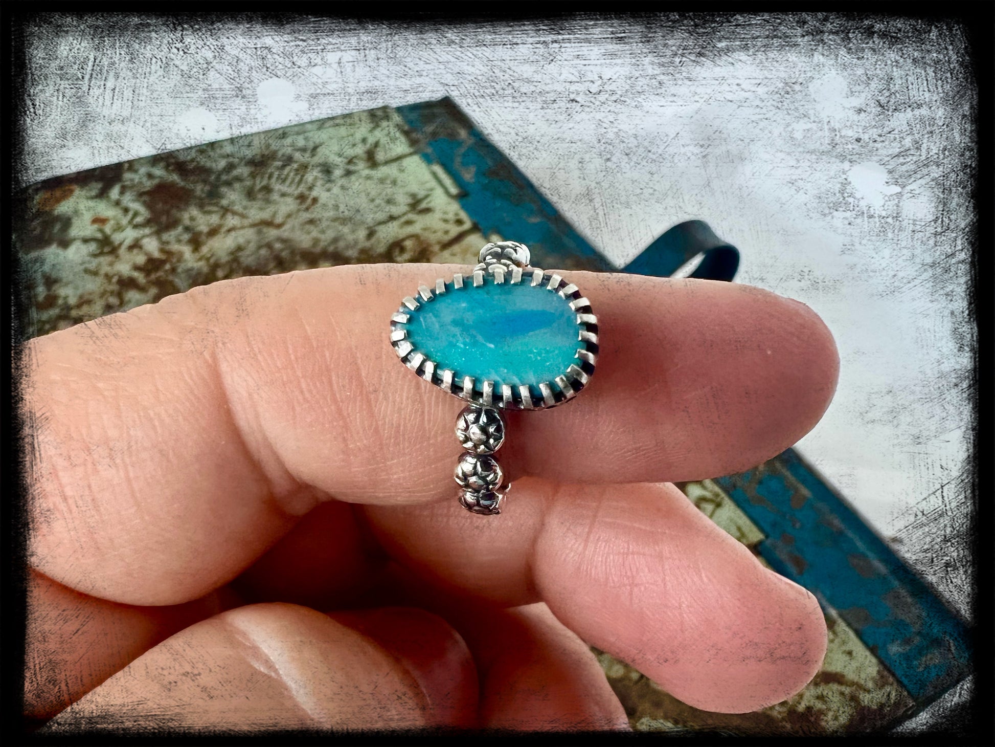 This is a beautiful blue opal doublet set in sterling silver with a berry beaded ring band measuring a US 8.5. The stone is a beautiful light blue with a ton of iridescence and measures 1/2" tall by 3/8"" wide. The ring has a beautiful satin finish but can also be polish for a shinier finish if desired. Just let me know at check out.