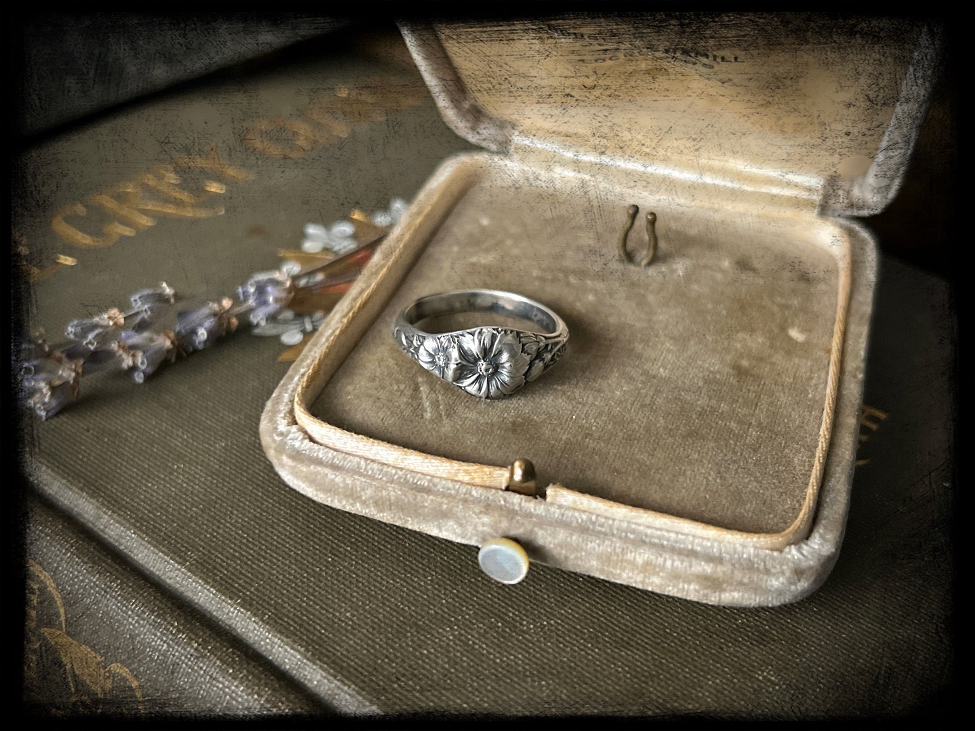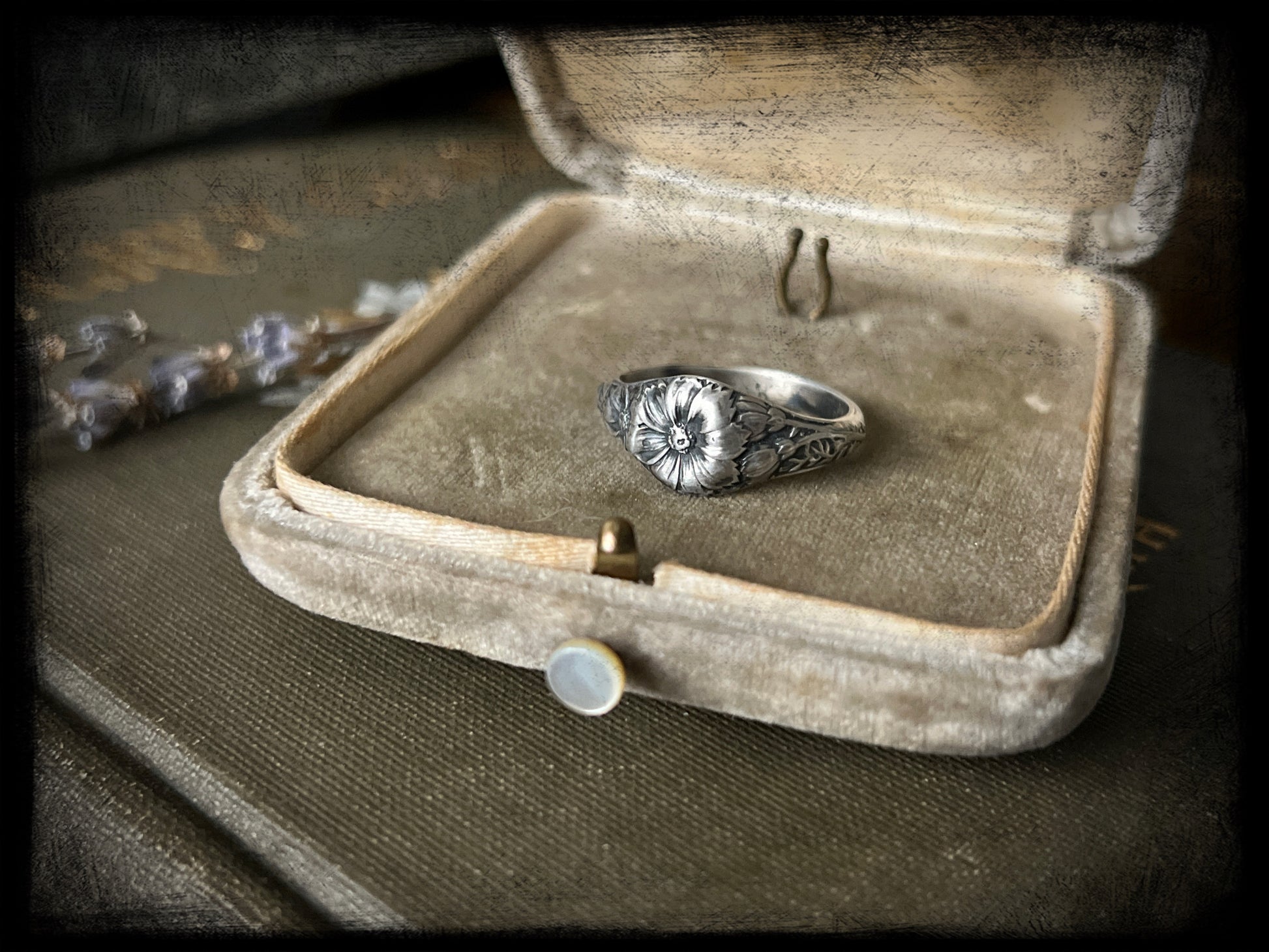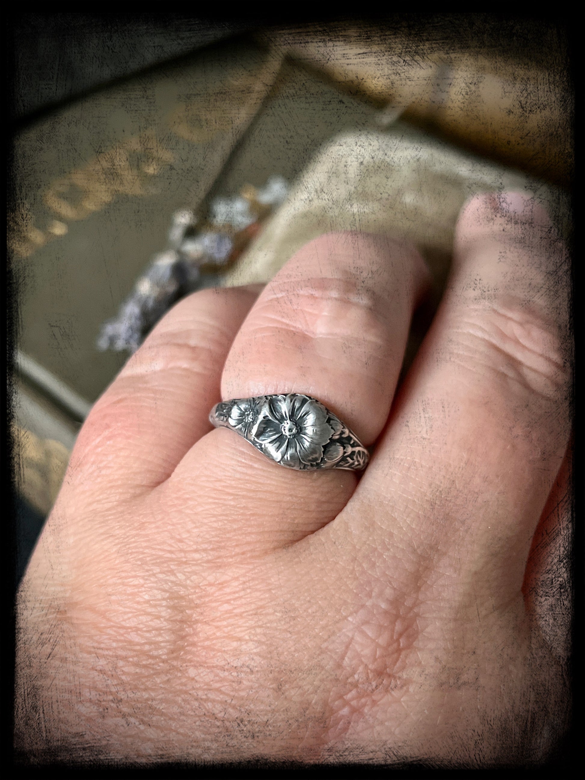 This is a beautiful Cosmos Flower Birth Month Ring representing the month of October. This ring is part of a series of birth flower rings made from a steel die from the early 20th century. These are truly one of a kind.