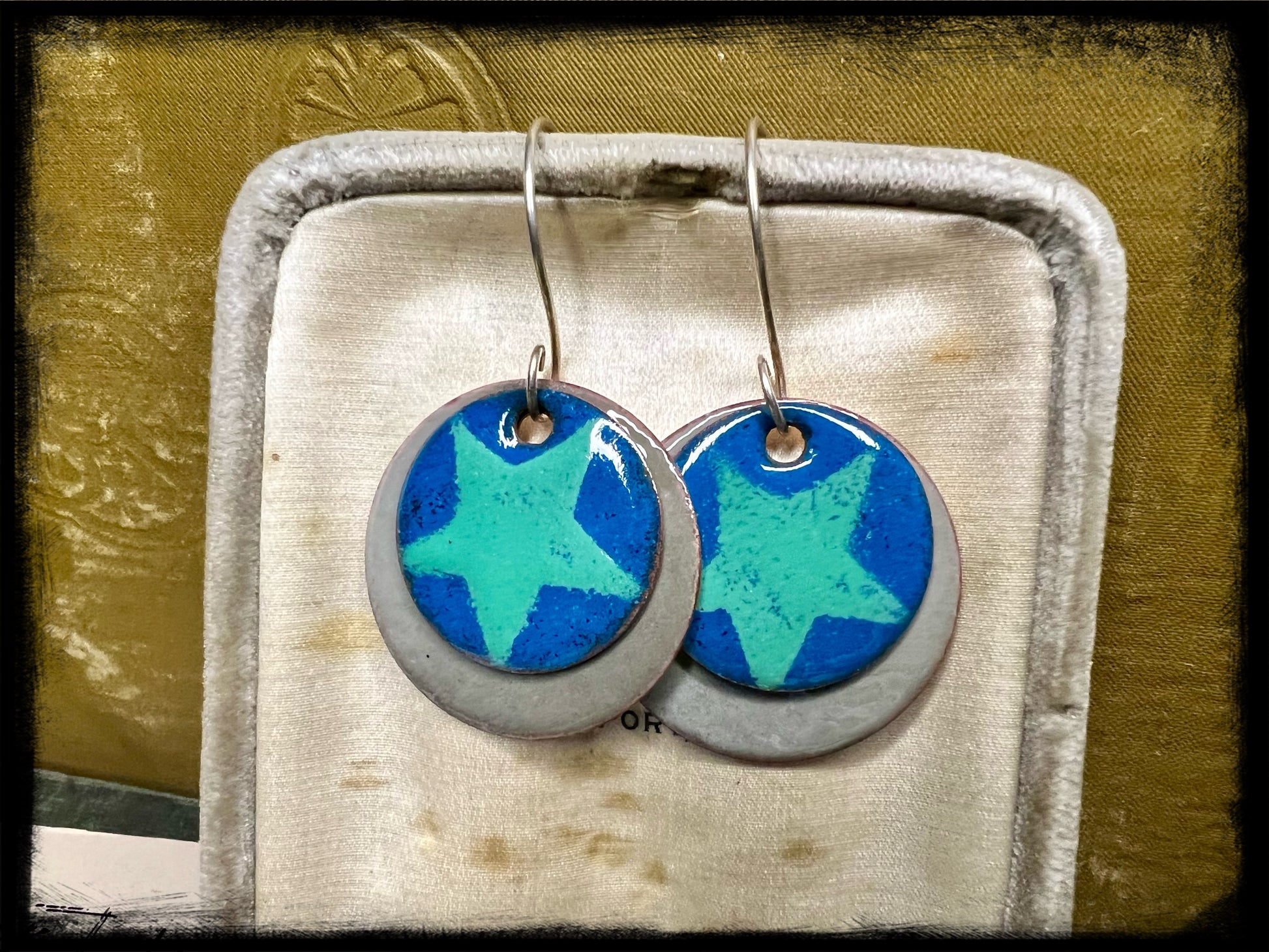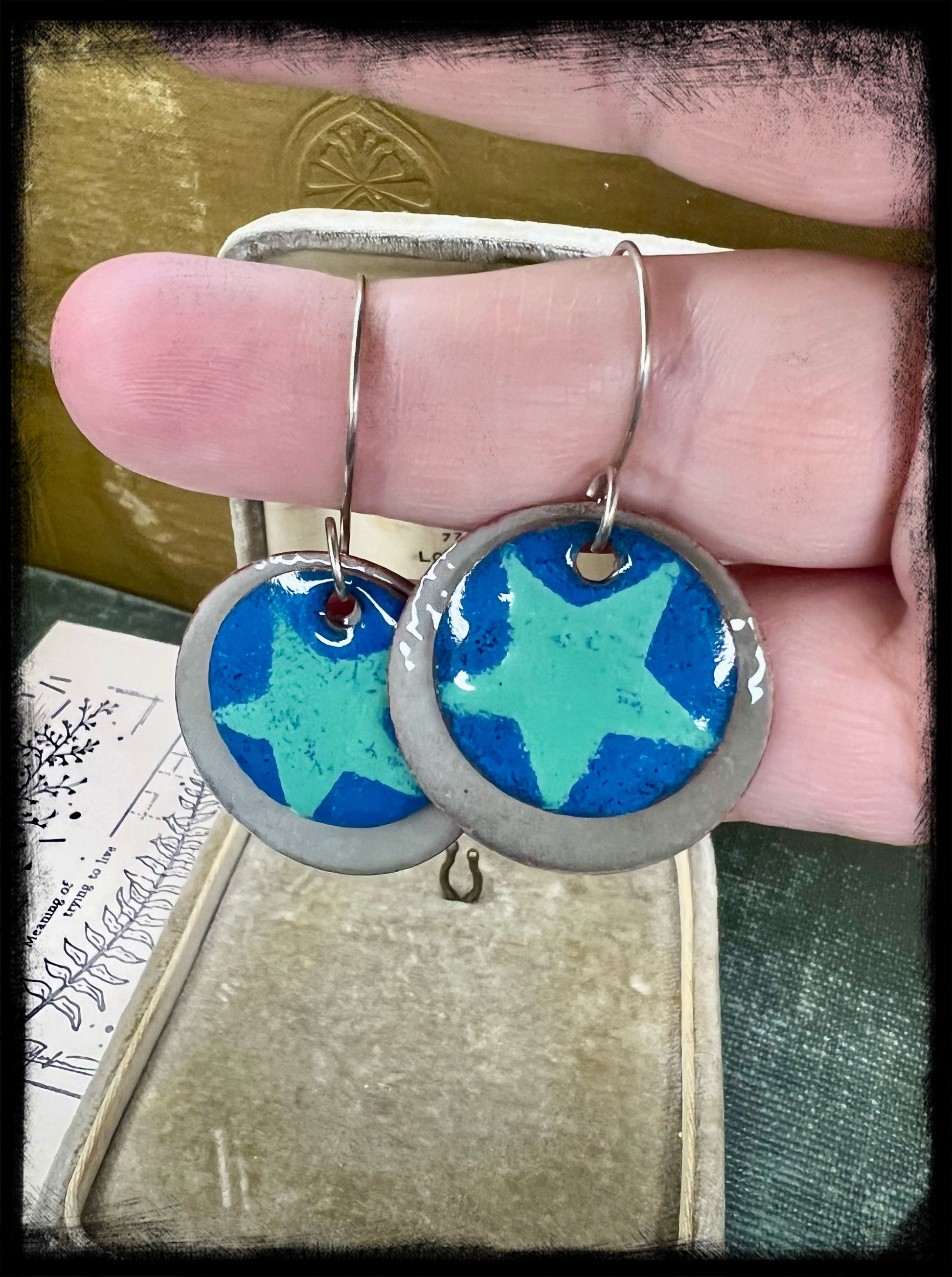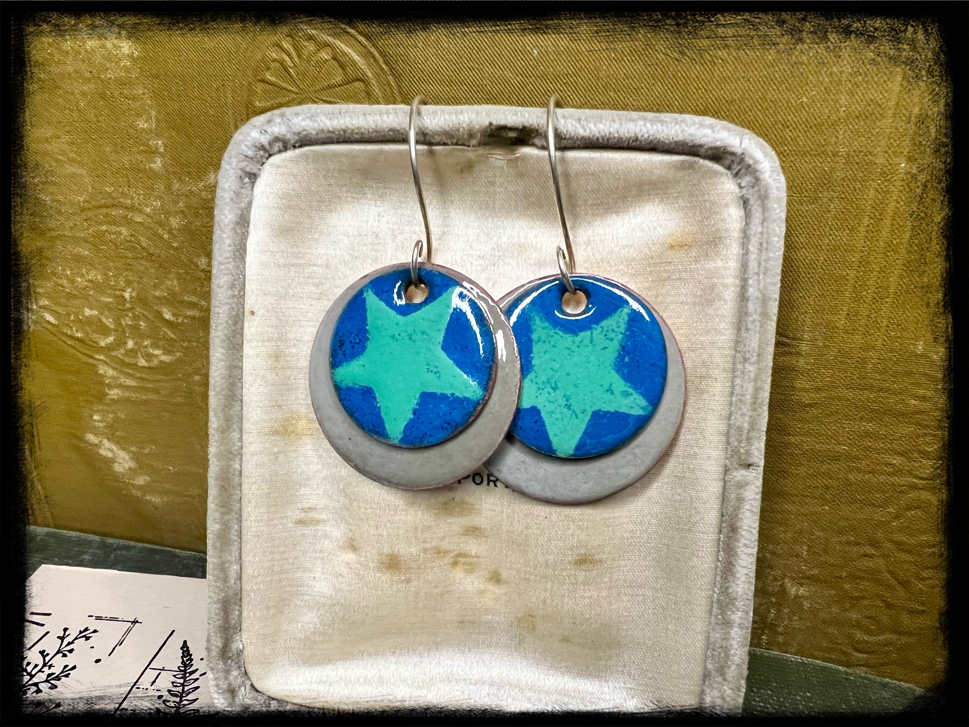 Introducing the enamel Stellar Heroine Coin Earrings, an enchanting fusion of whimsy and superhero allure. These captivating earrings, adorned with a star design, boast a mesmerizing combination of grey, green, and blue enamel, reminiscent of a cosmic heroine's iconic emblem.