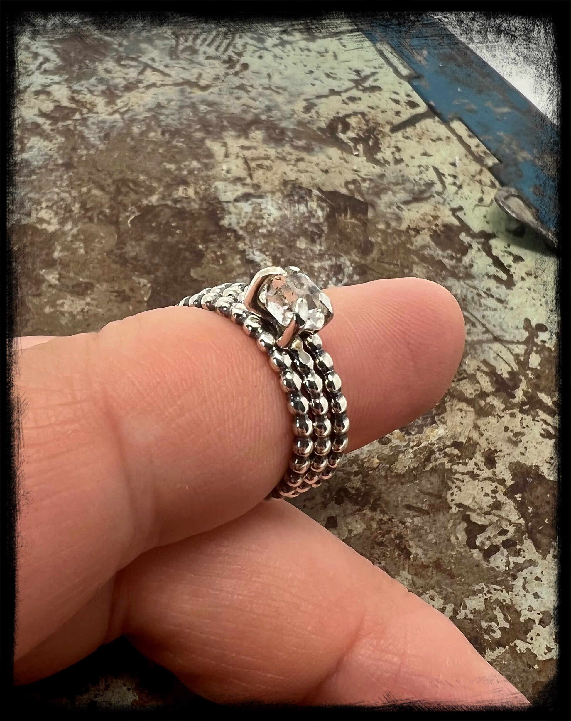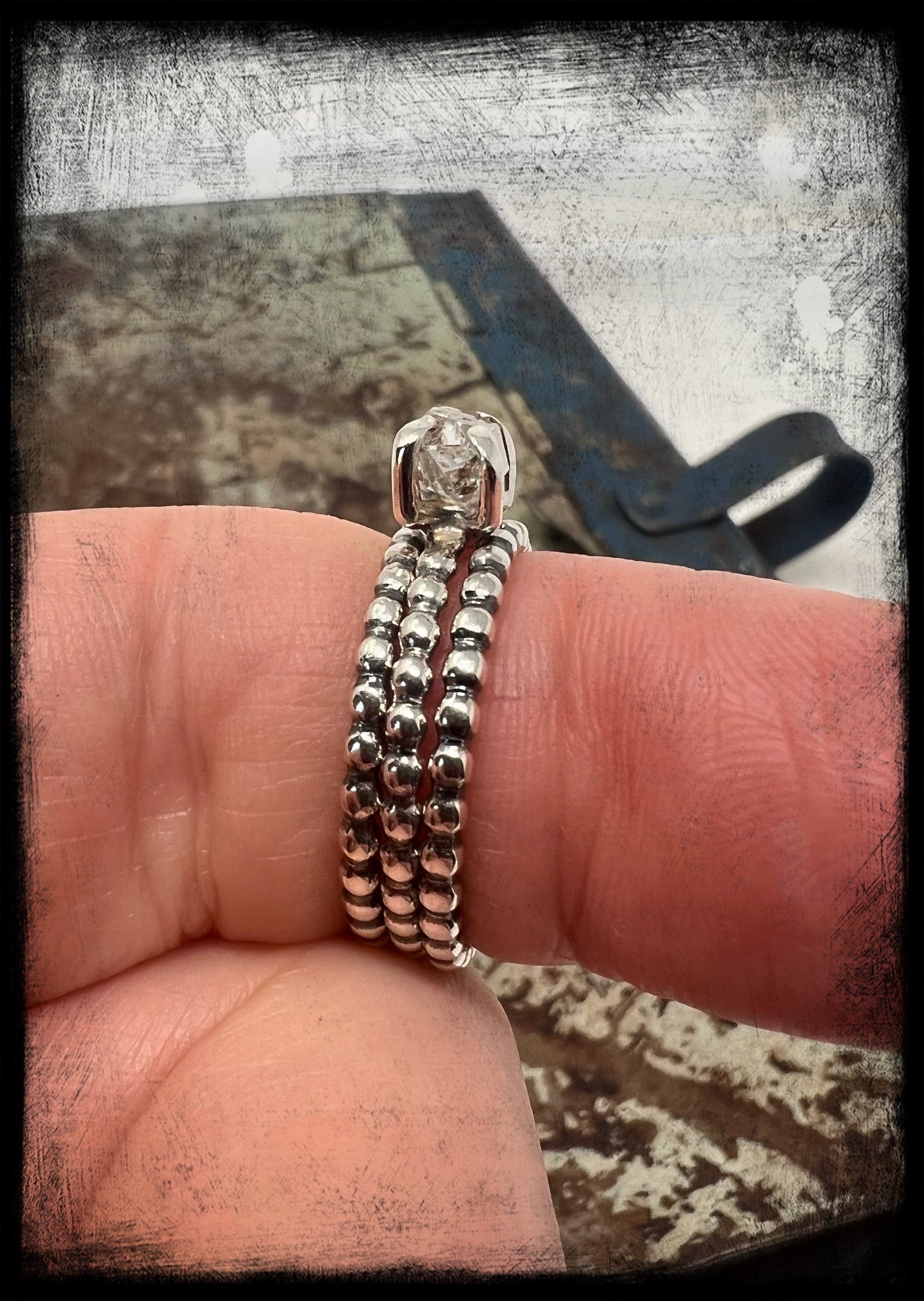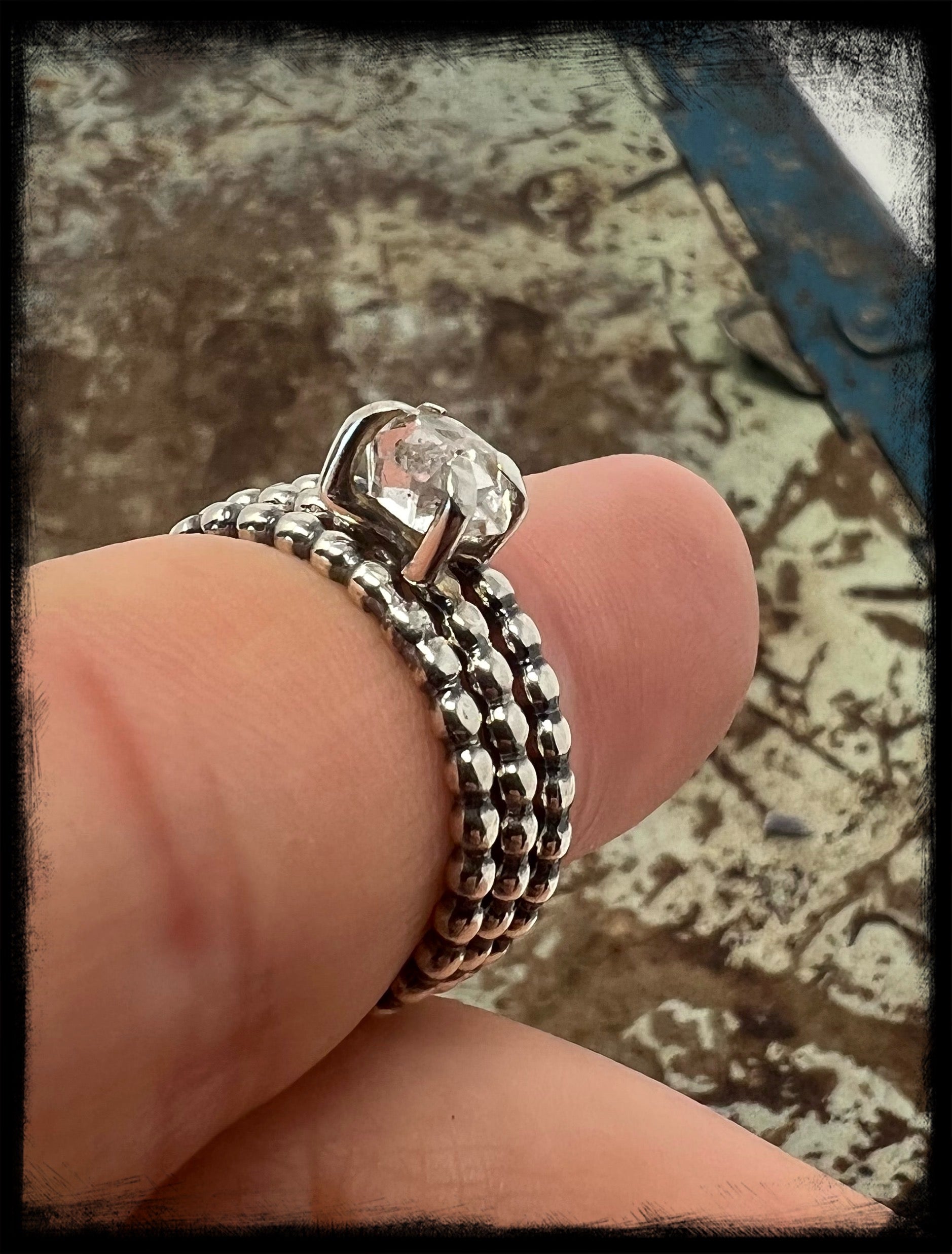 This is a beautiful set, which includes one Herkimer Diamond stacker and two sterling silver plain stackers of the same size-US 8.  The ring bands are a beaded design and the Herkimer Diamond is set in a four prong setting.  Additional plain stackers can be purchased to build the ring or to simply place a couple on another finger for accent.  The Herkimer diamond has no inclusions and is crystal clear.  This Herkimer measures 6mm in length, smaller but stunning.
