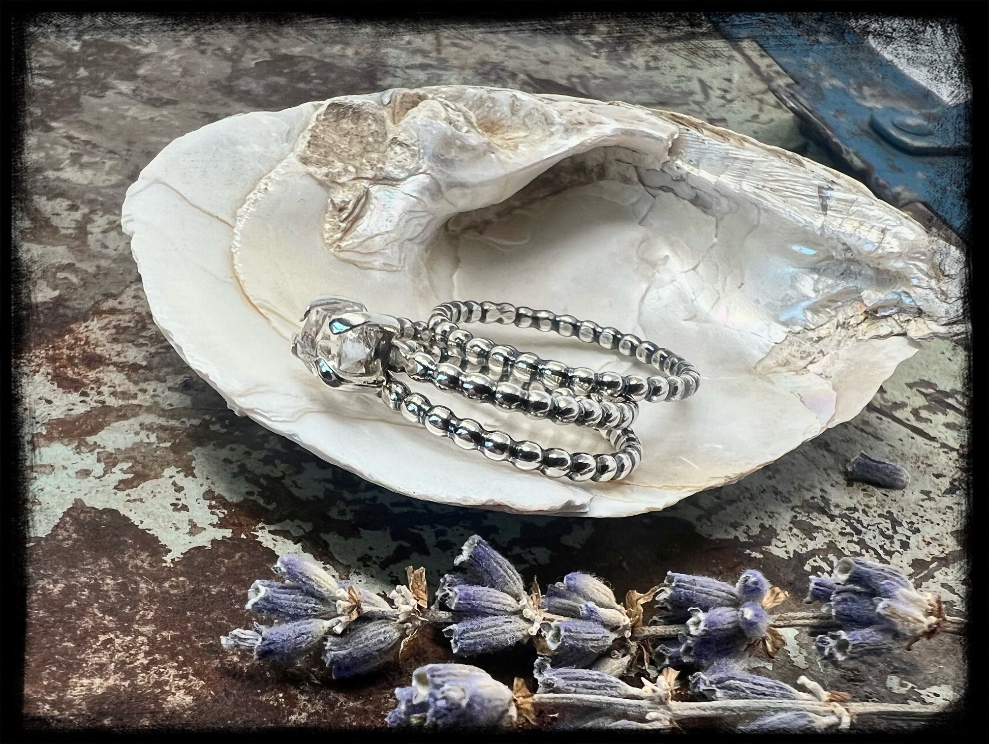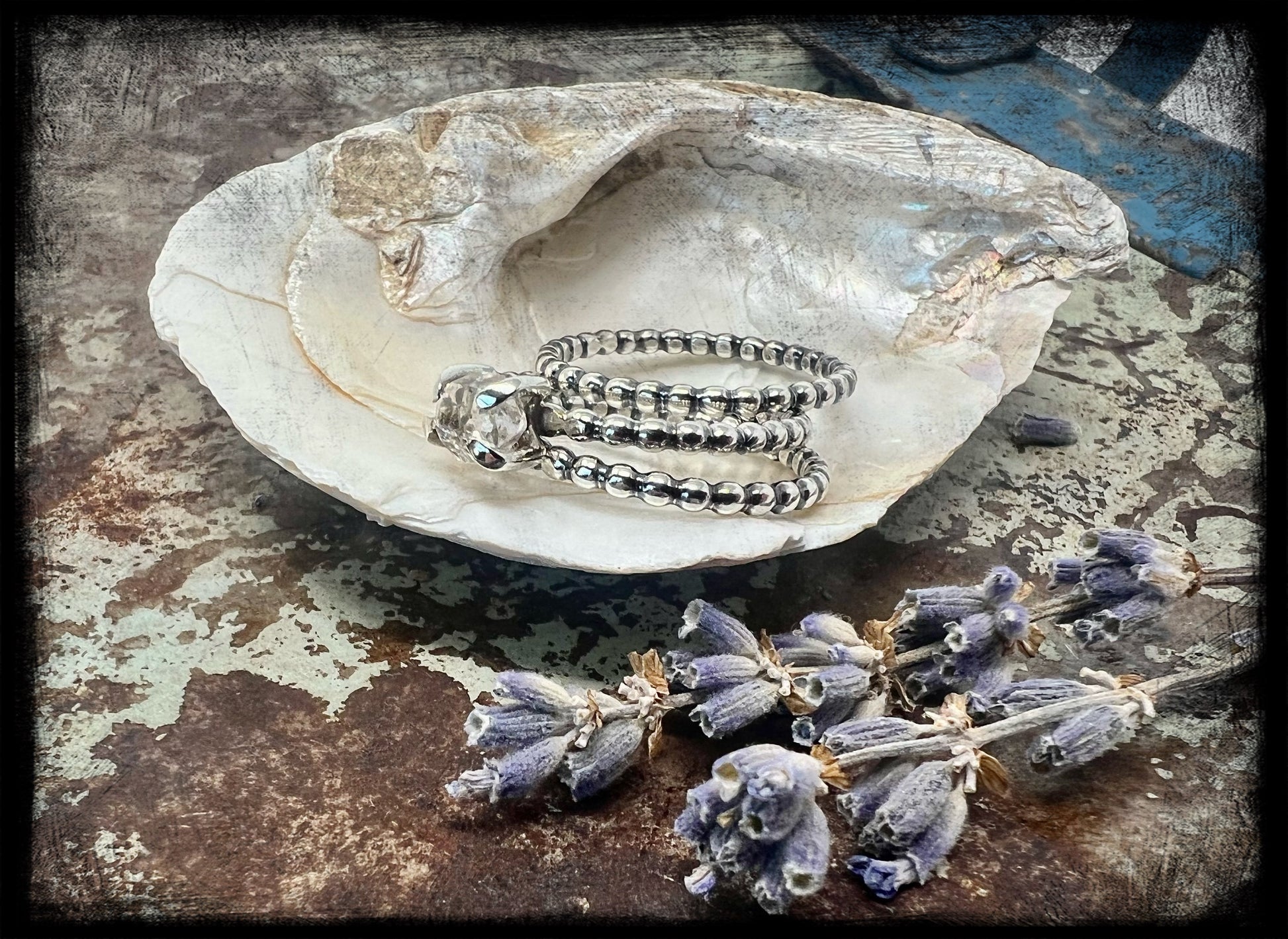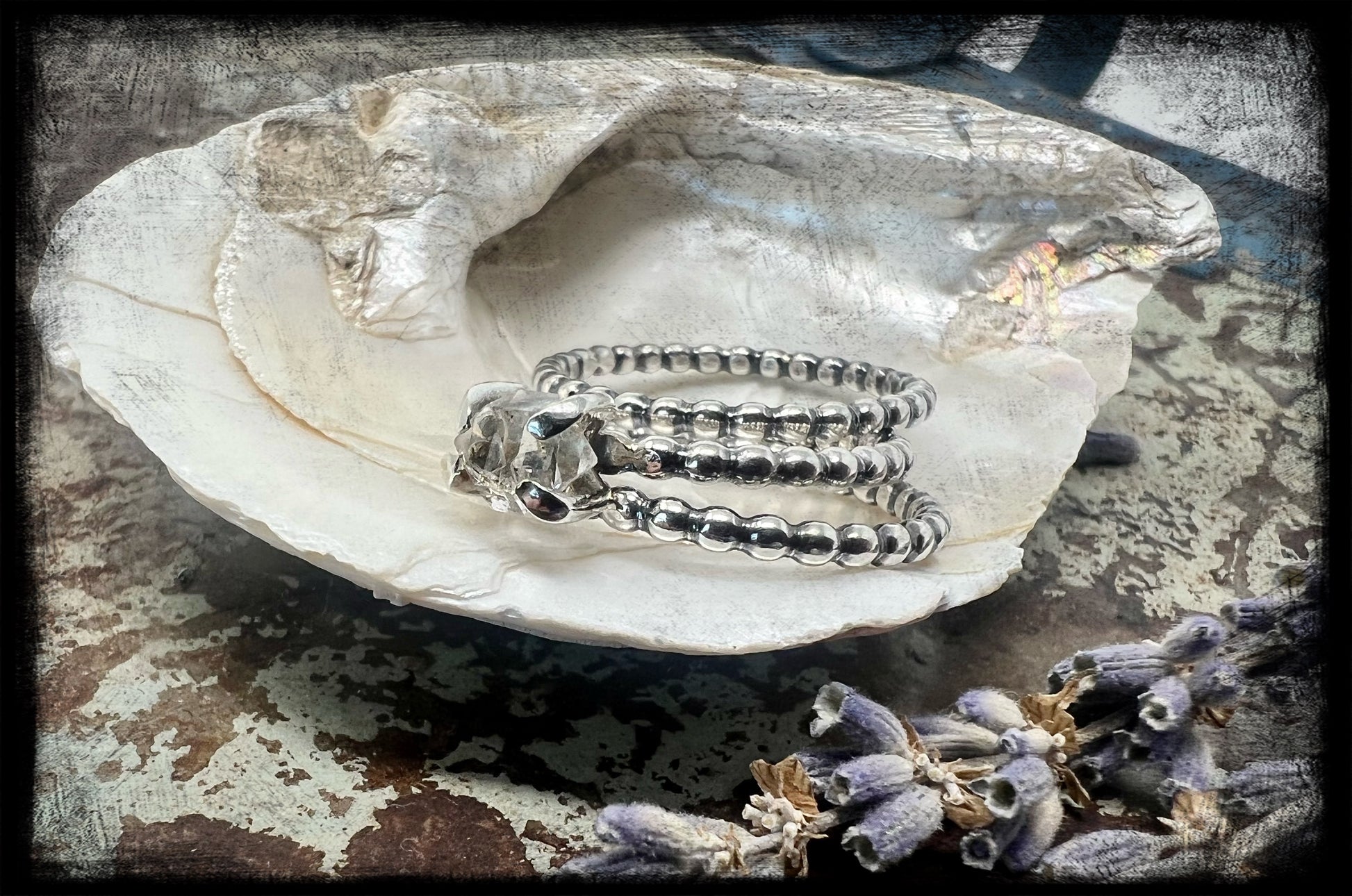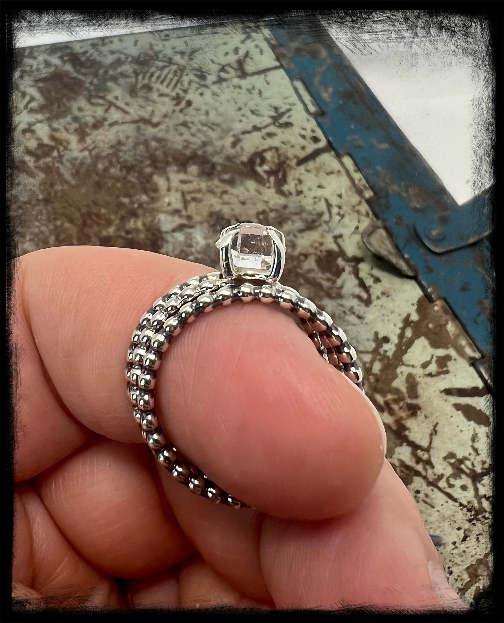 This is a beautiful set, which includes one Herkimer Diamond stacker and two sterling silver plain stackers of the same size-US 8.  The ring bands are a beaded design and the Herkimer Diamond is set in a four prong setting.  Additional plain stackers can be purchased to build the ring or to simply place a couple on another finger for accent.  The Herkimer diamond has no inclusions and is crystal clear.  This Herkimer measures 6mm in length, smaller but stunning.