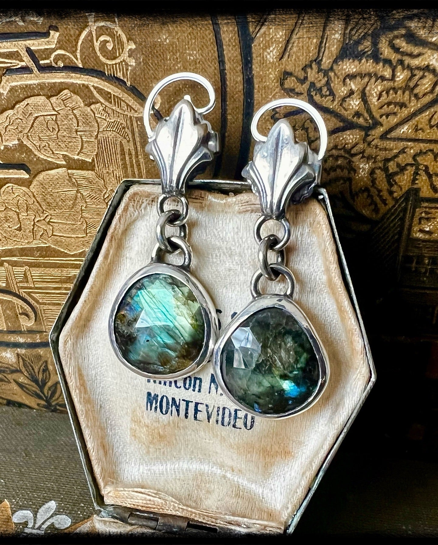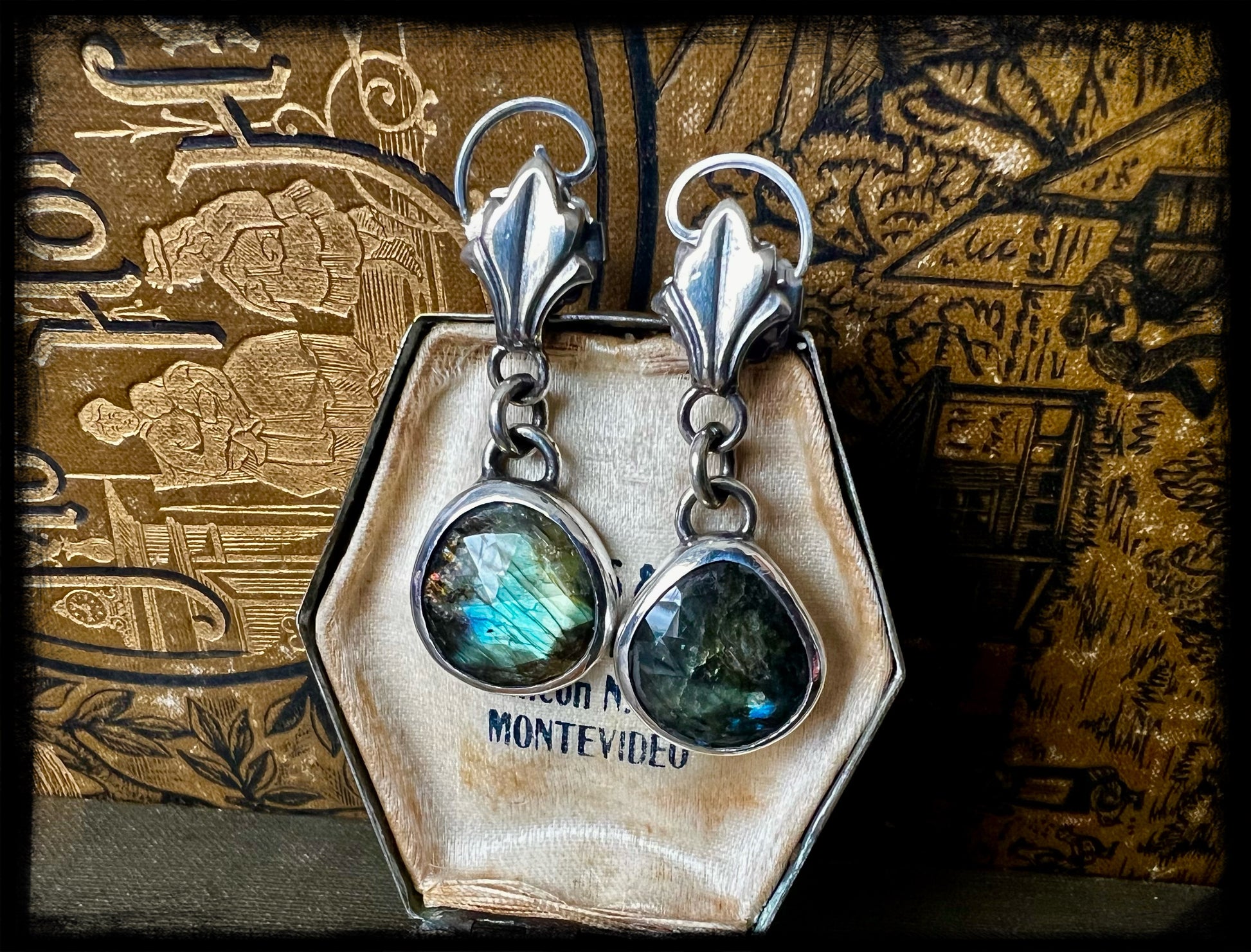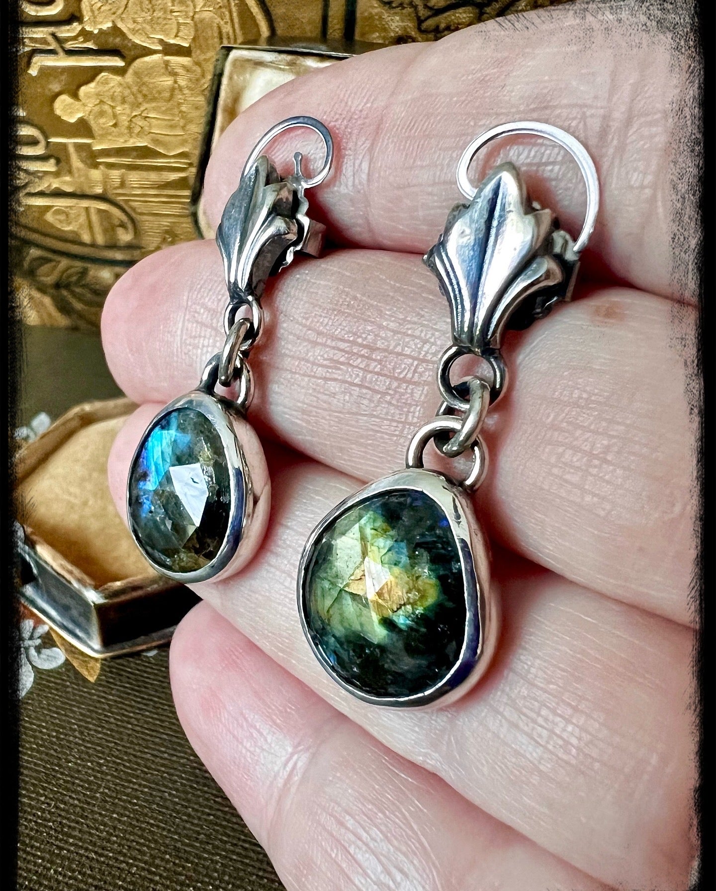 Discover elegance with these handmade labradorite earrings, expertly set in sterling silver and adorned with a vintage-style stud. These earrings showcase the stunning labradorite stone, celebrated for its captivating play of colors—vibrant flashes of blue, green, and gold that shift with the light.