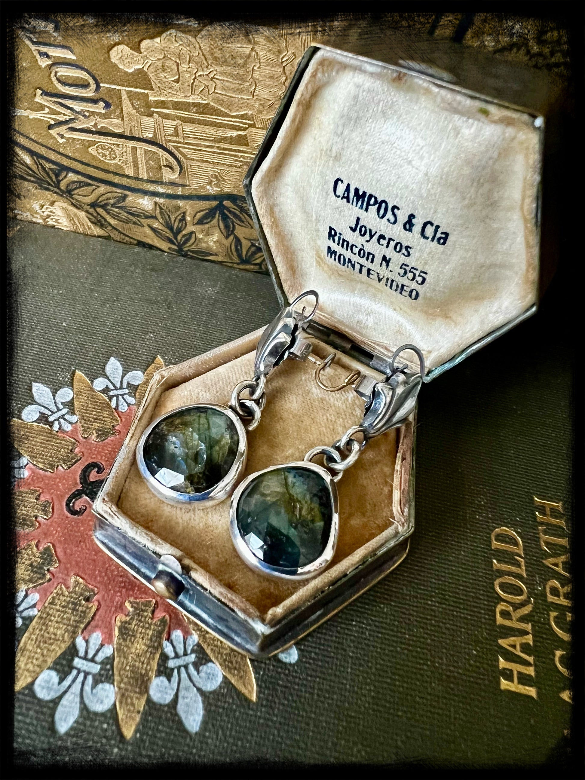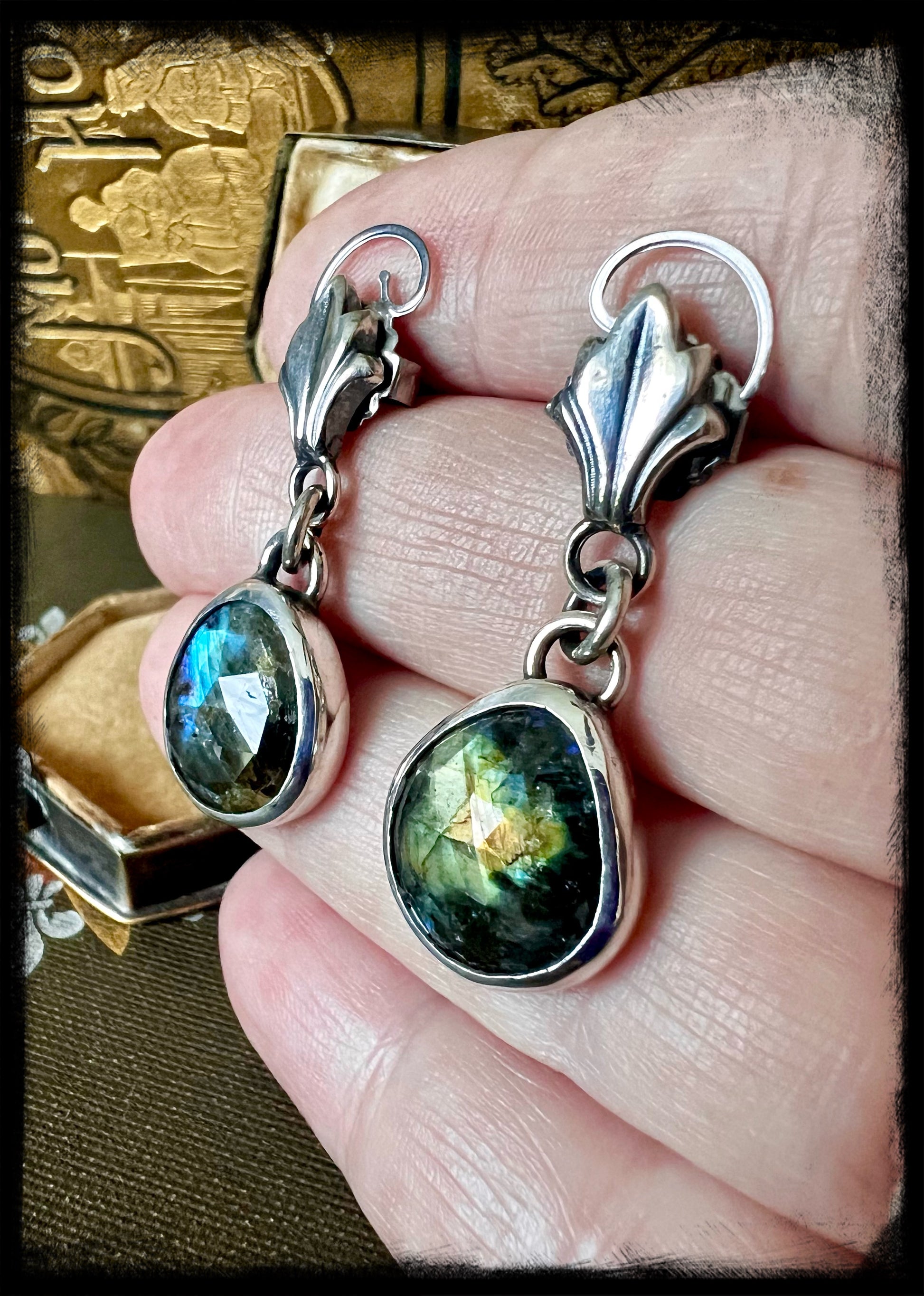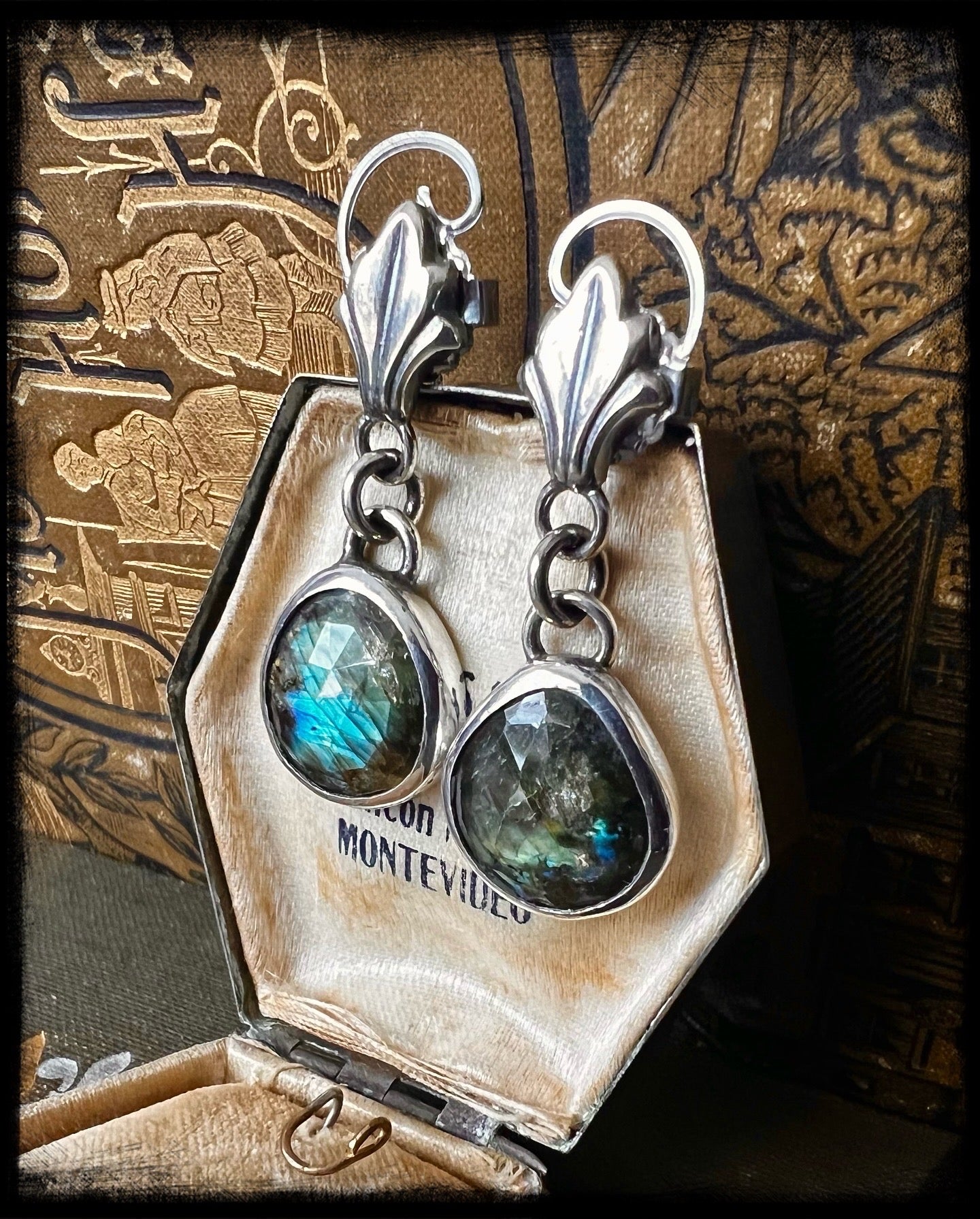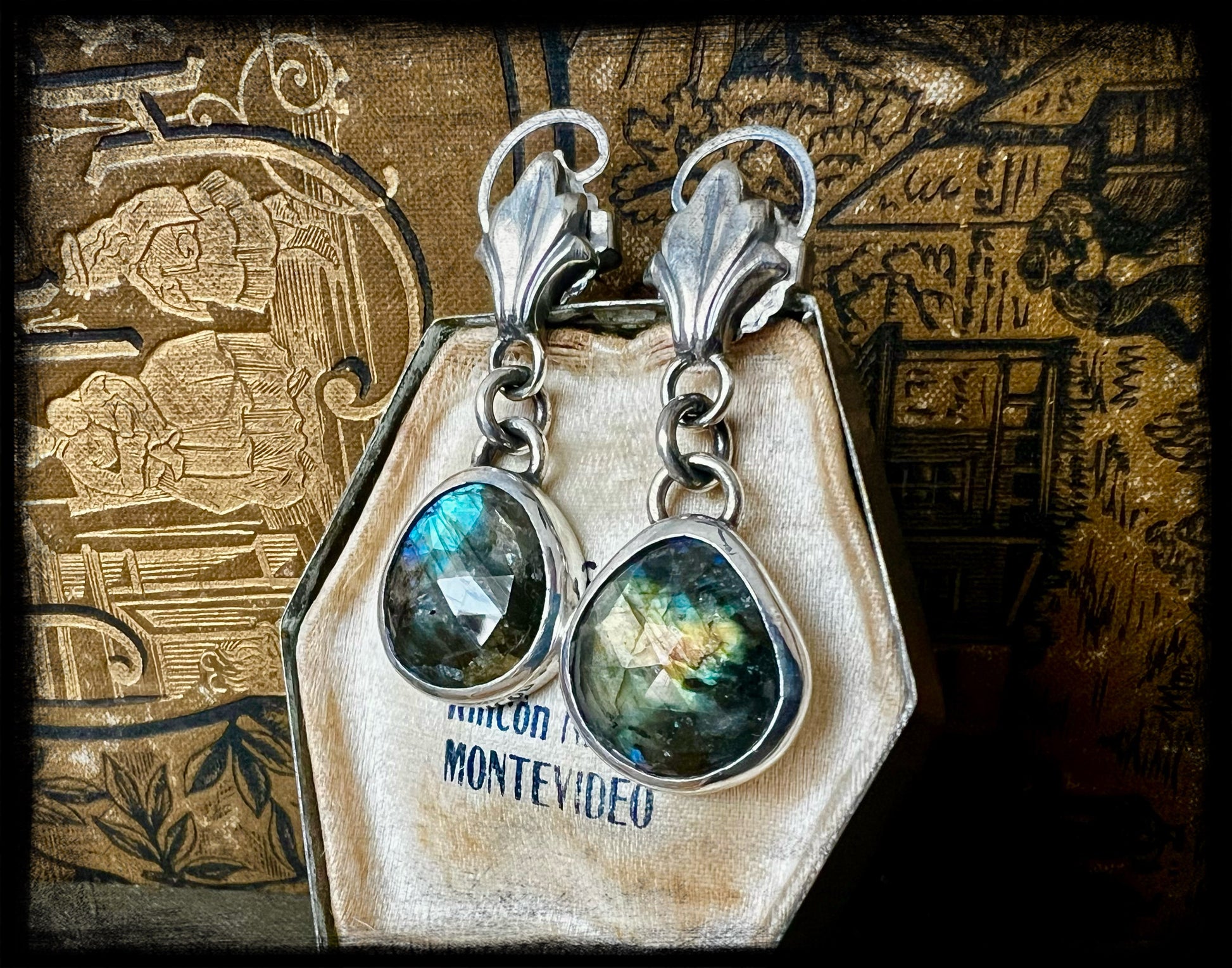Discover elegance with these handmade labradorite earrings, expertly set in sterling silver and adorned with a vintage-style stud. These earrings showcase the stunning labradorite stone, celebrated for its captivating play of colors—vibrant flashes of blue, green, and gold that shift with the light.