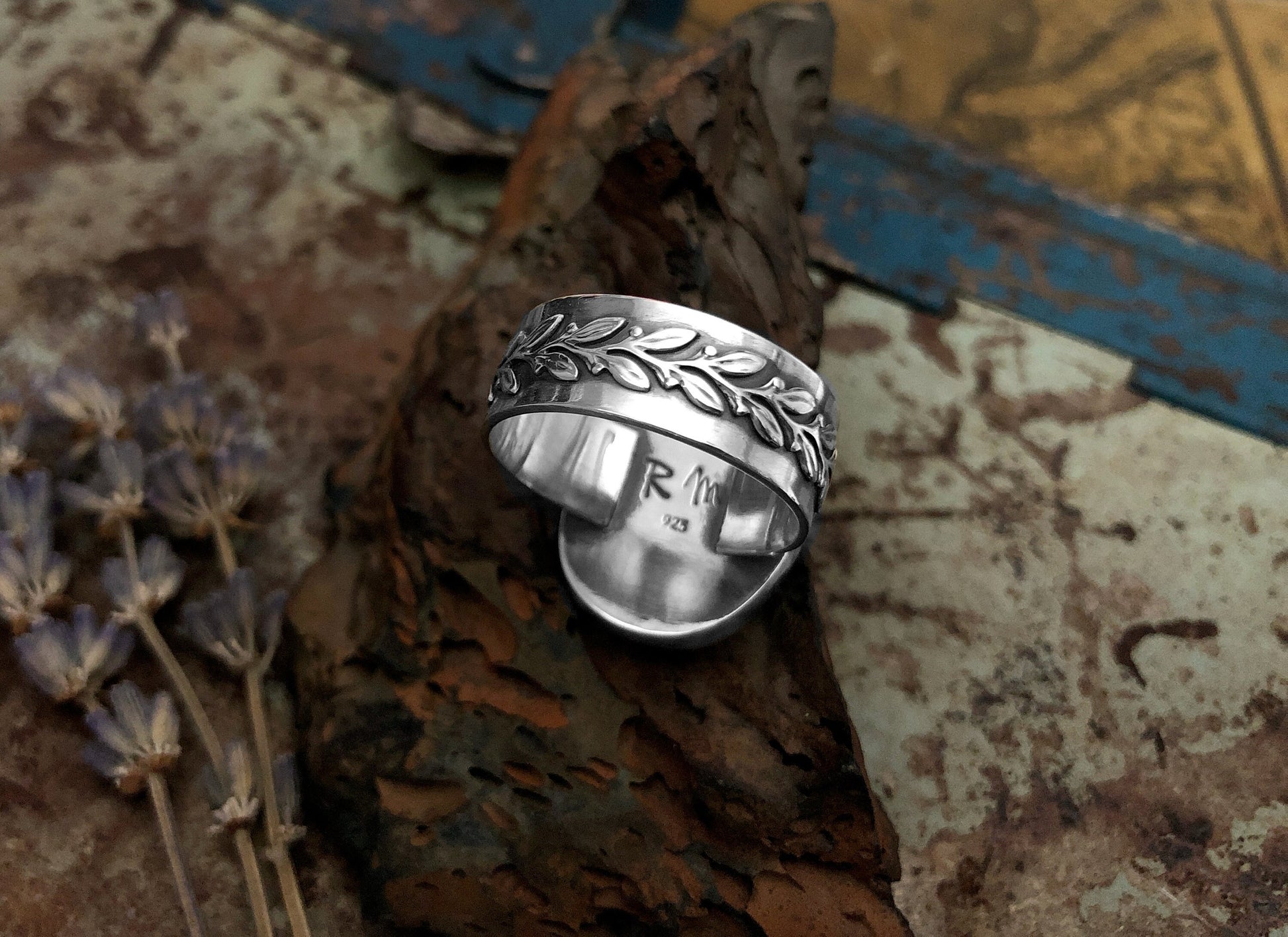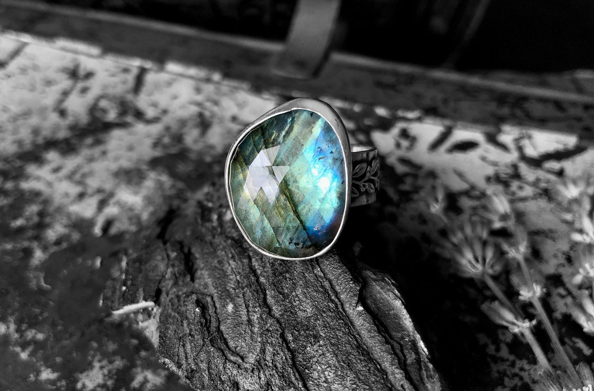 This is a beautiful smoky green Labradorite stone set in a classic sterling bezel . The stone shape is very organic and is a true beauty. The stone measures ~3/4" in length and the ring band is a wide band decorated with a beautiful leave pattern. The ring size fits on the ring mandrel at a size 10 but feels more like an 8.5-9 due to the width of the ring band.
