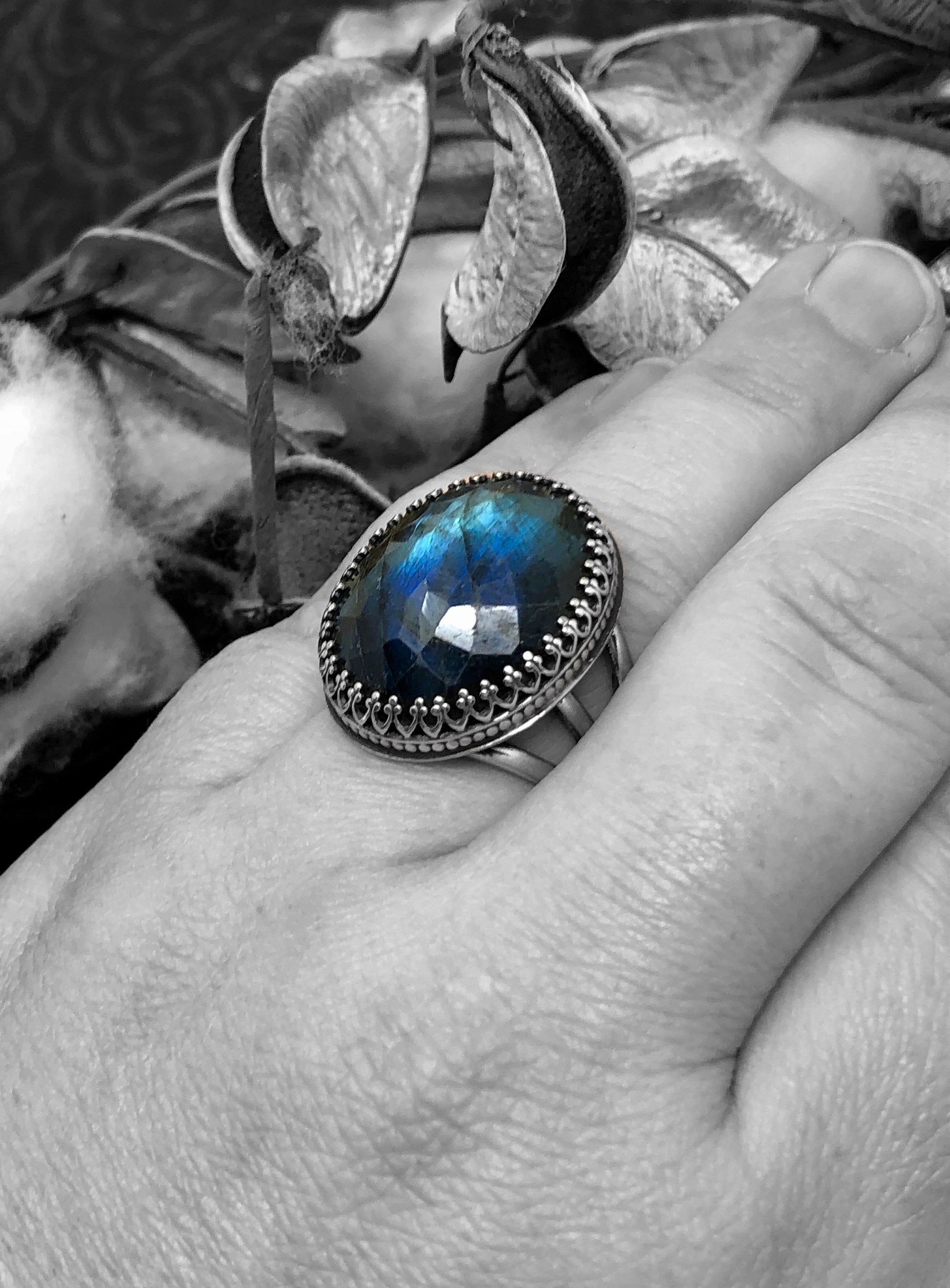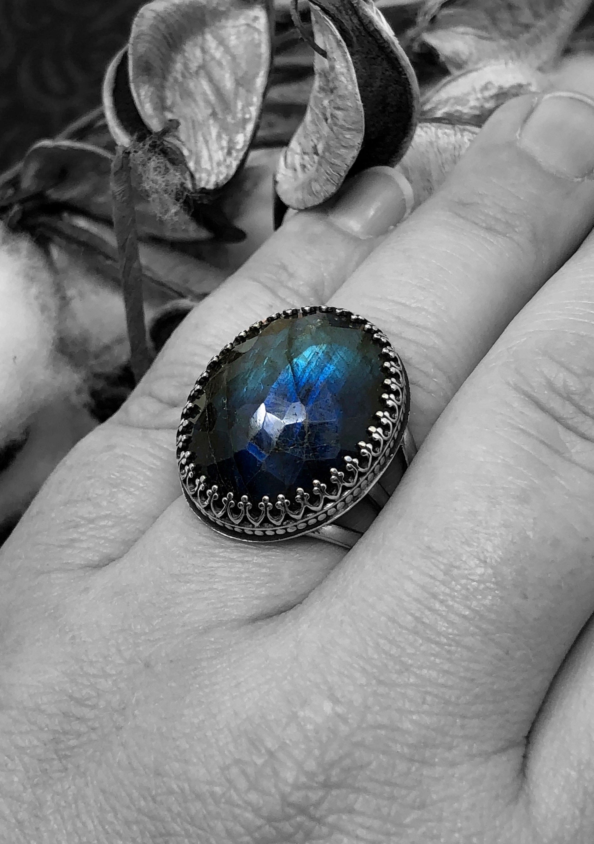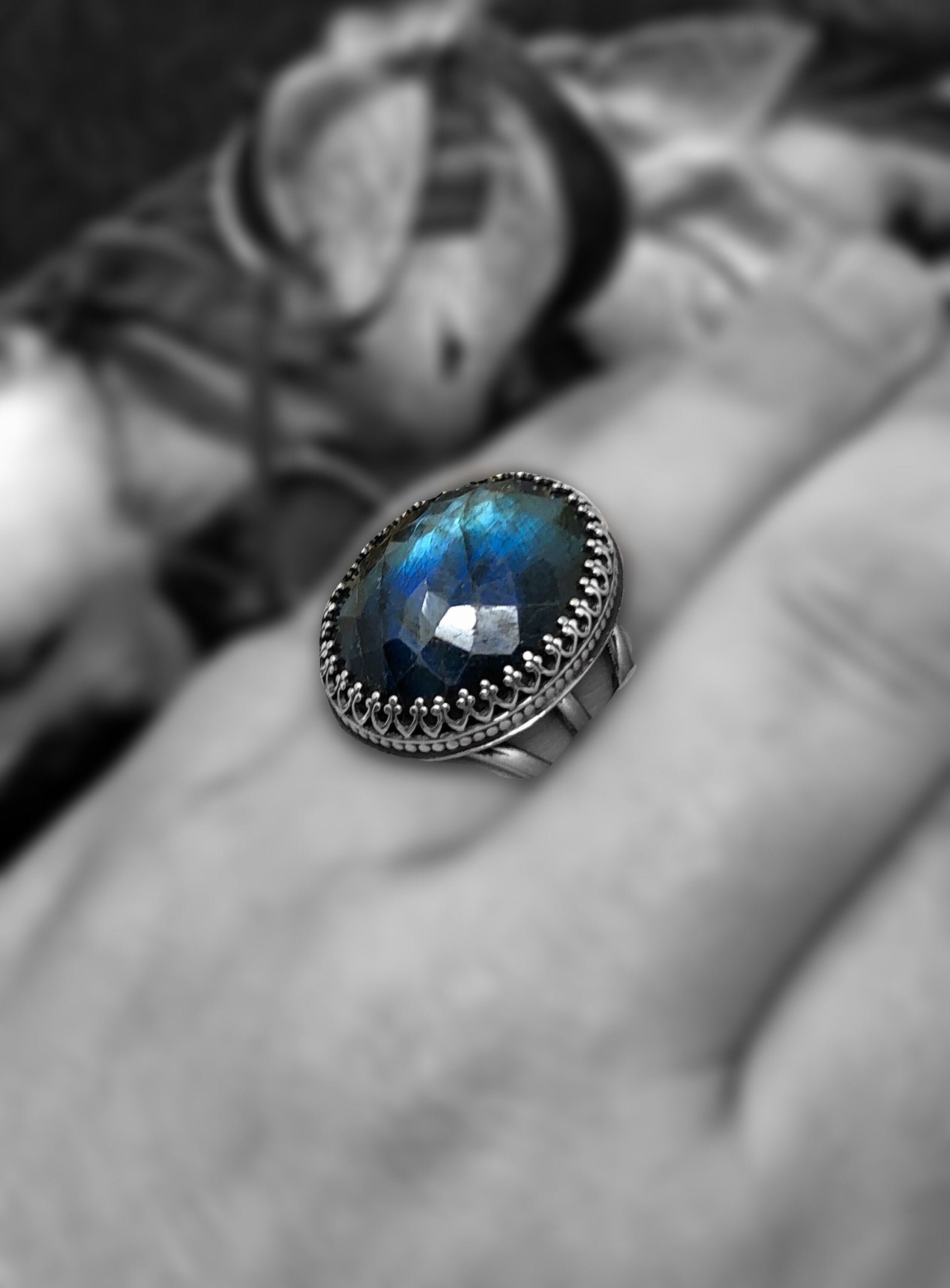This is a large and beautiful rose cut (multi facets) labradorite stone set in an ornate sterling silver bezel with a 3 tier ring band. The stone measures 1 /14" in length and 3/4" wide and the ring band is a size 9.25US. This is a stunning statement ring and would look great with any Boho attire.