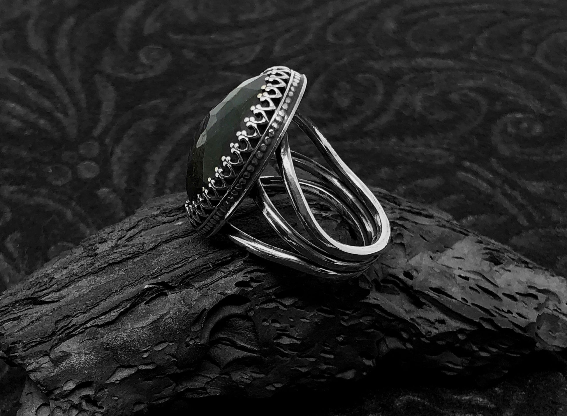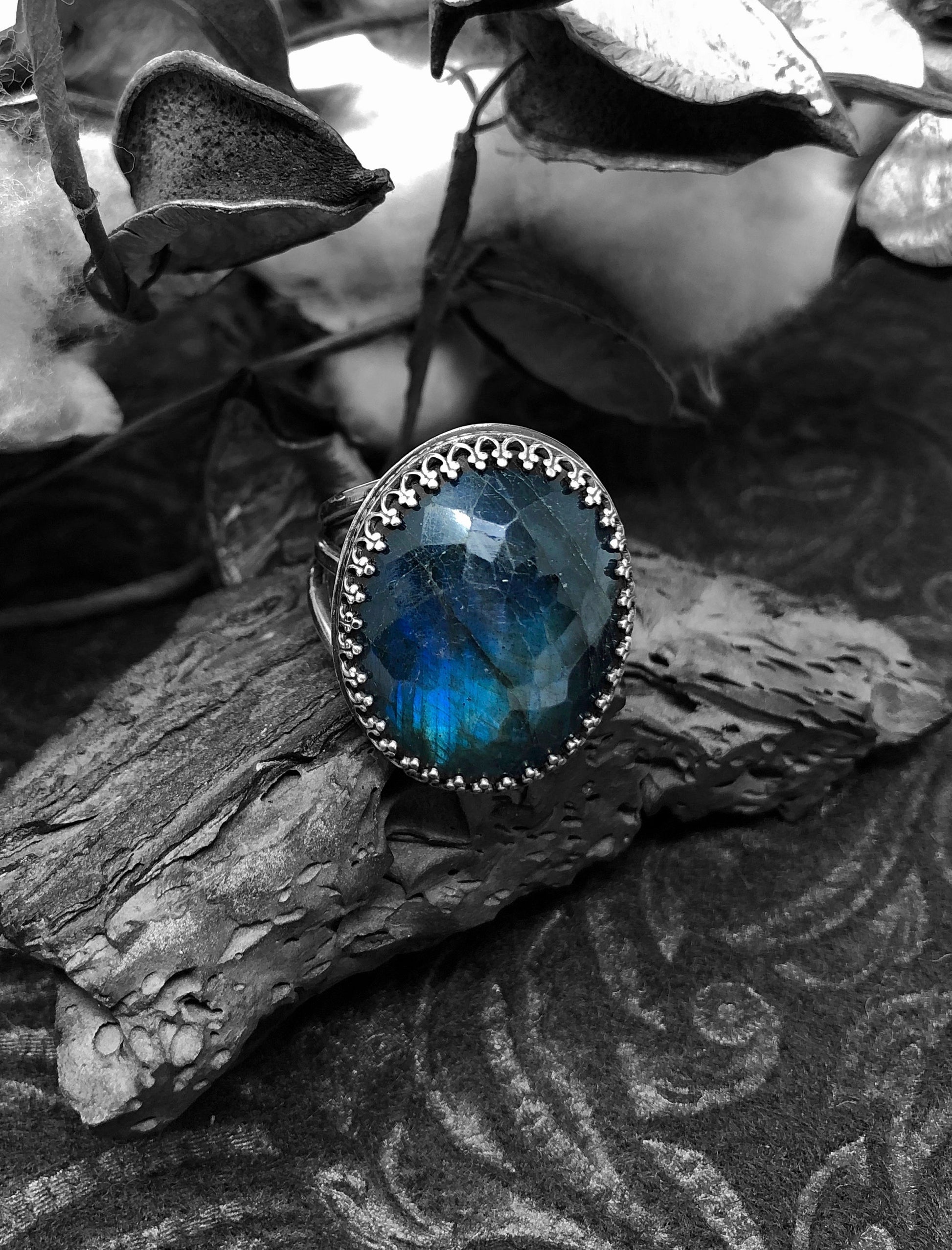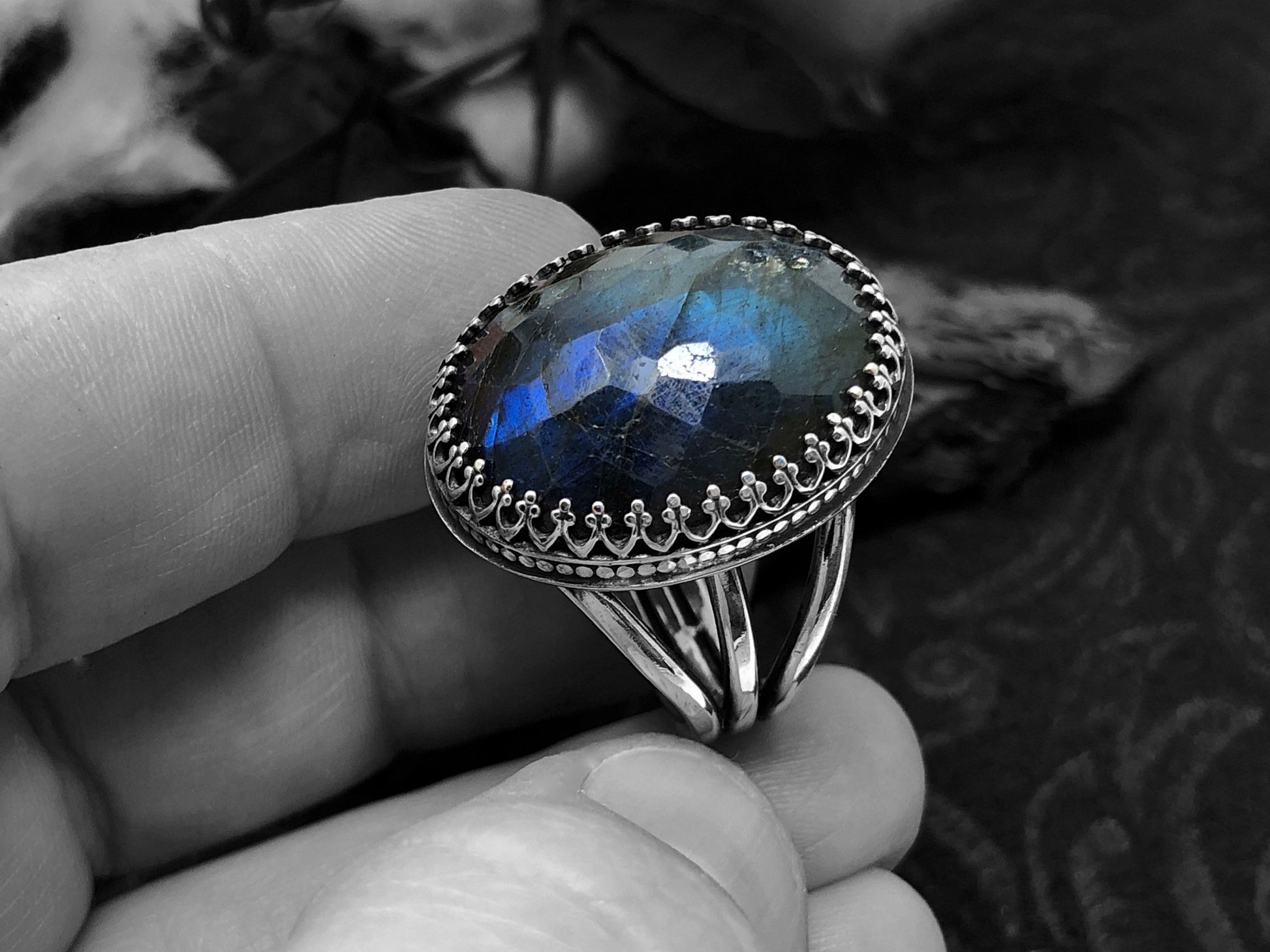 This is a large and beautiful rose cut (multi facets) labradorite stone set in an ornate sterling silver bezel with a 3 tier ring band. The stone measures 1 /14" in length and 3/4" wide and the ring band is a size 9.25US. This is a stunning statement ring and would look great with any Boho attire.