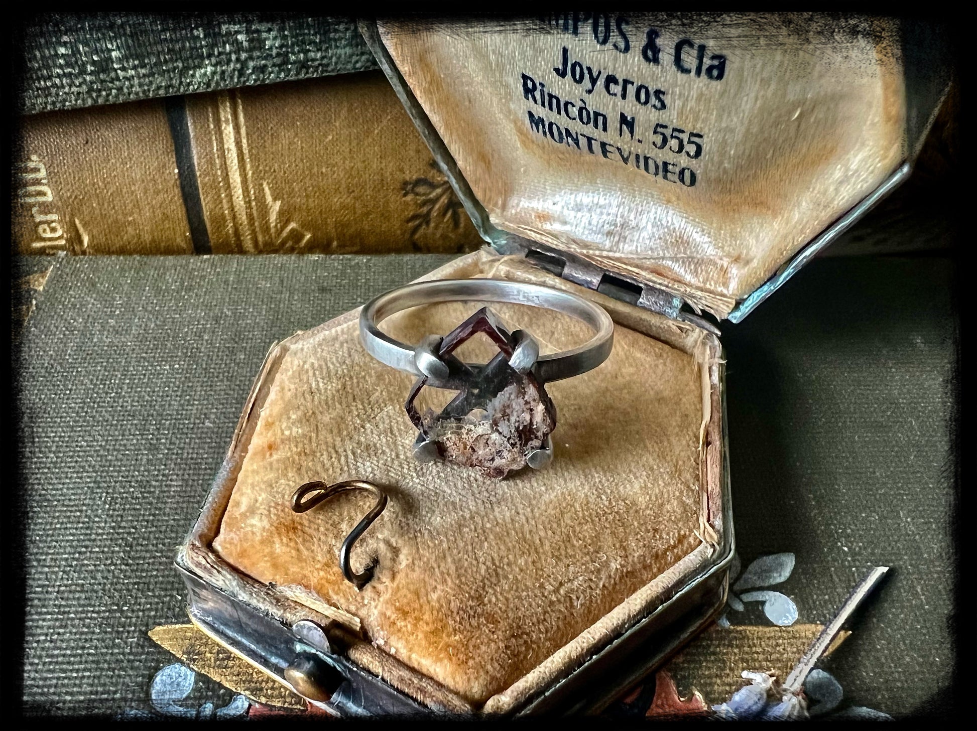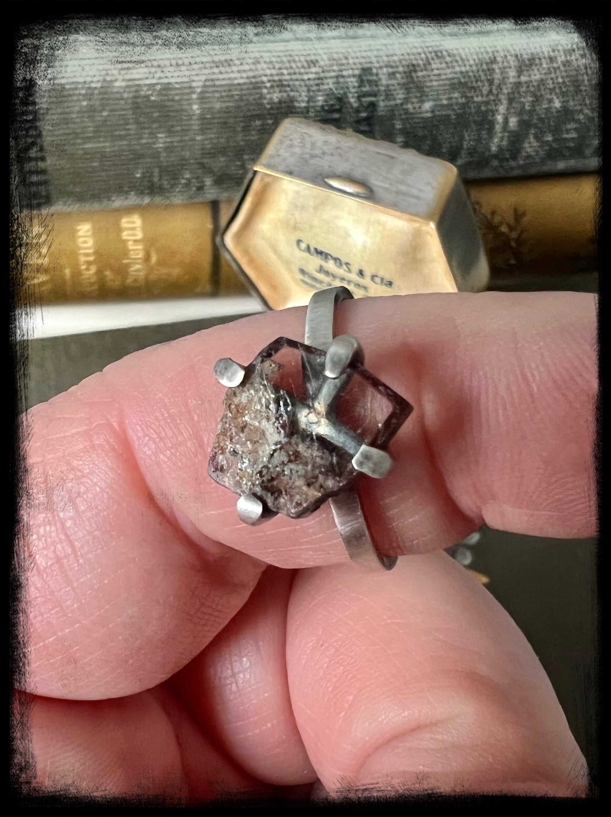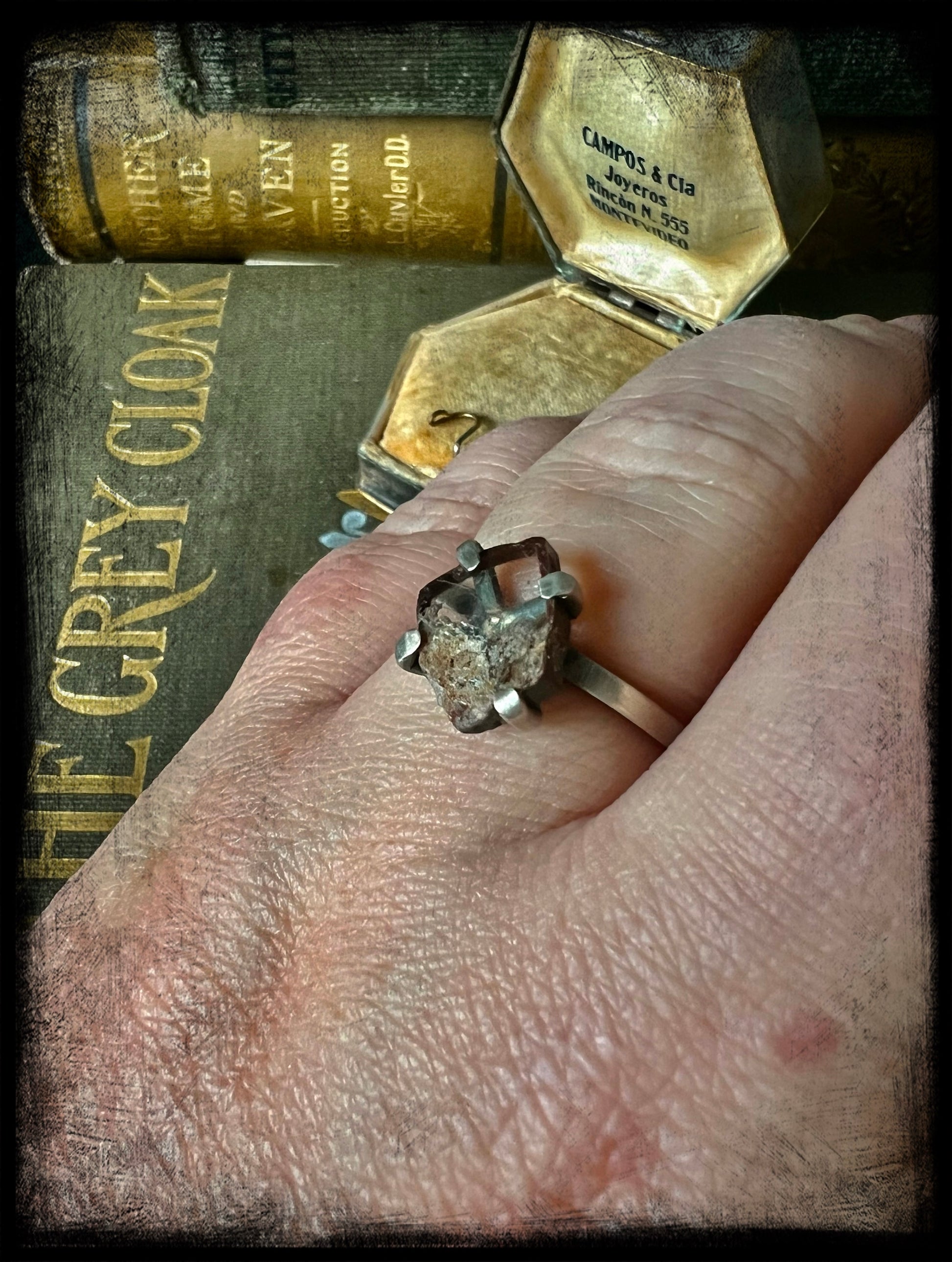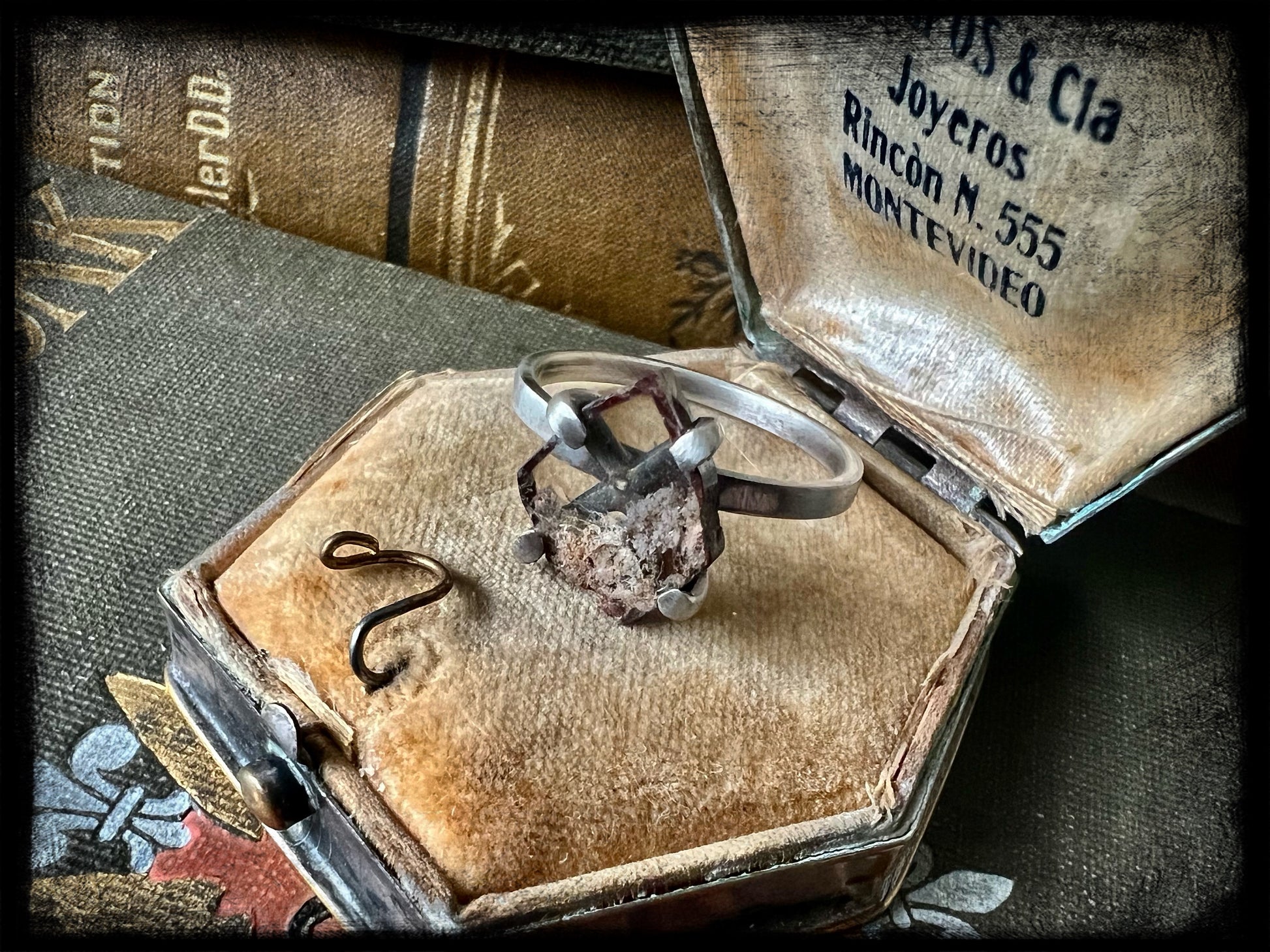 This is a beautiful Mexican Topaz set in a simple sterling silver prong setting. This stone resembles a clear quartz with cool inclusions. This ring is finished with a nice antique patina and the ring band measures a size 9.