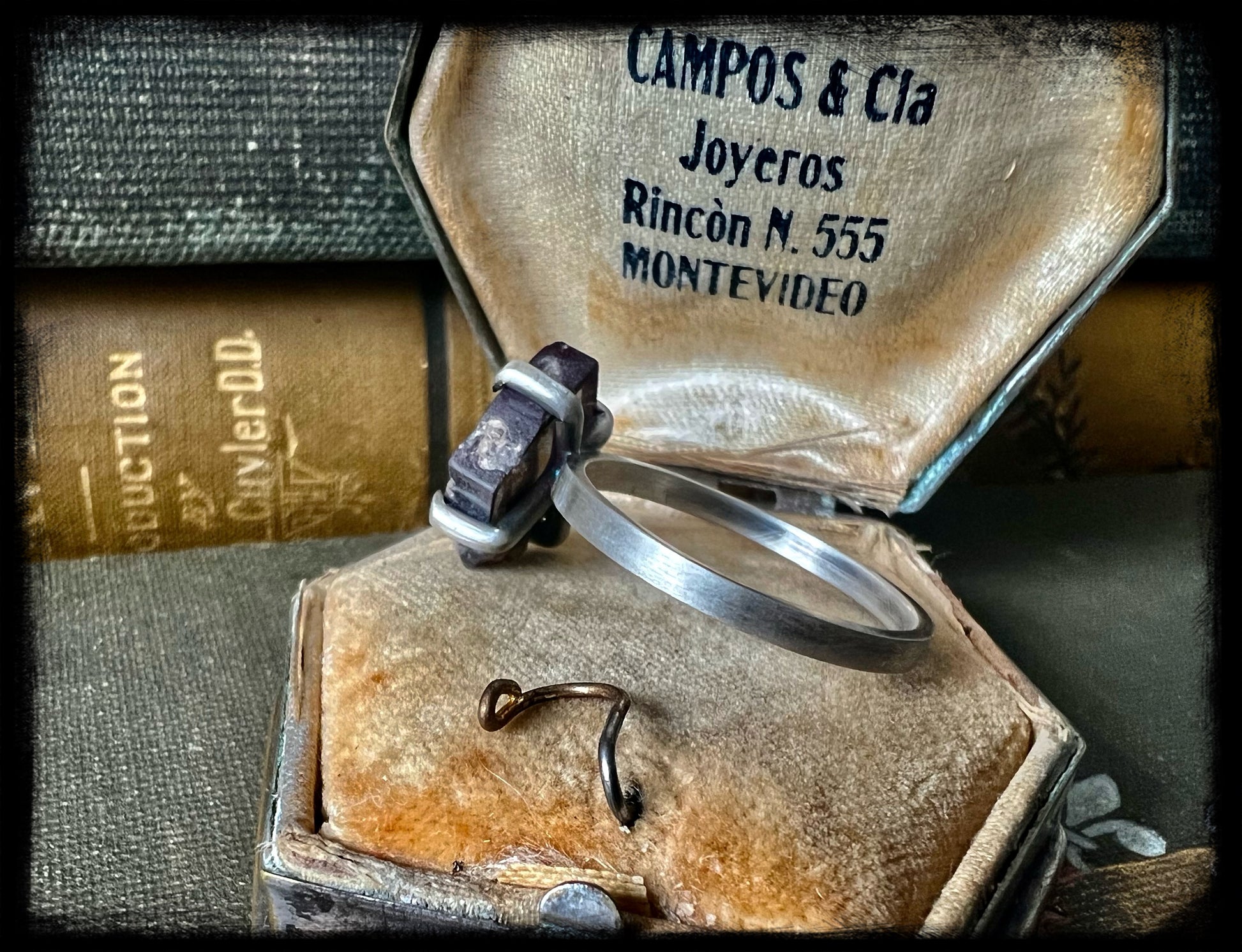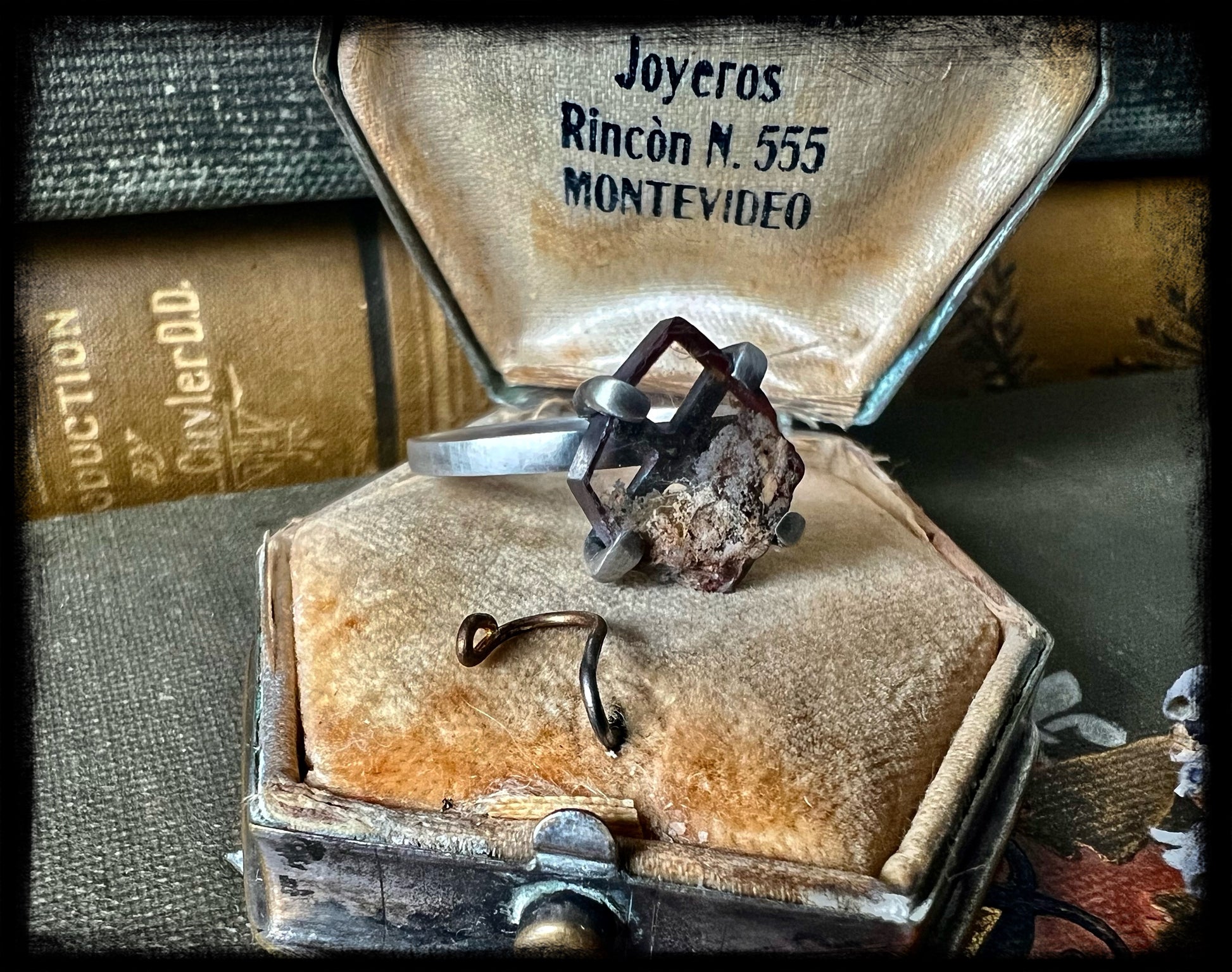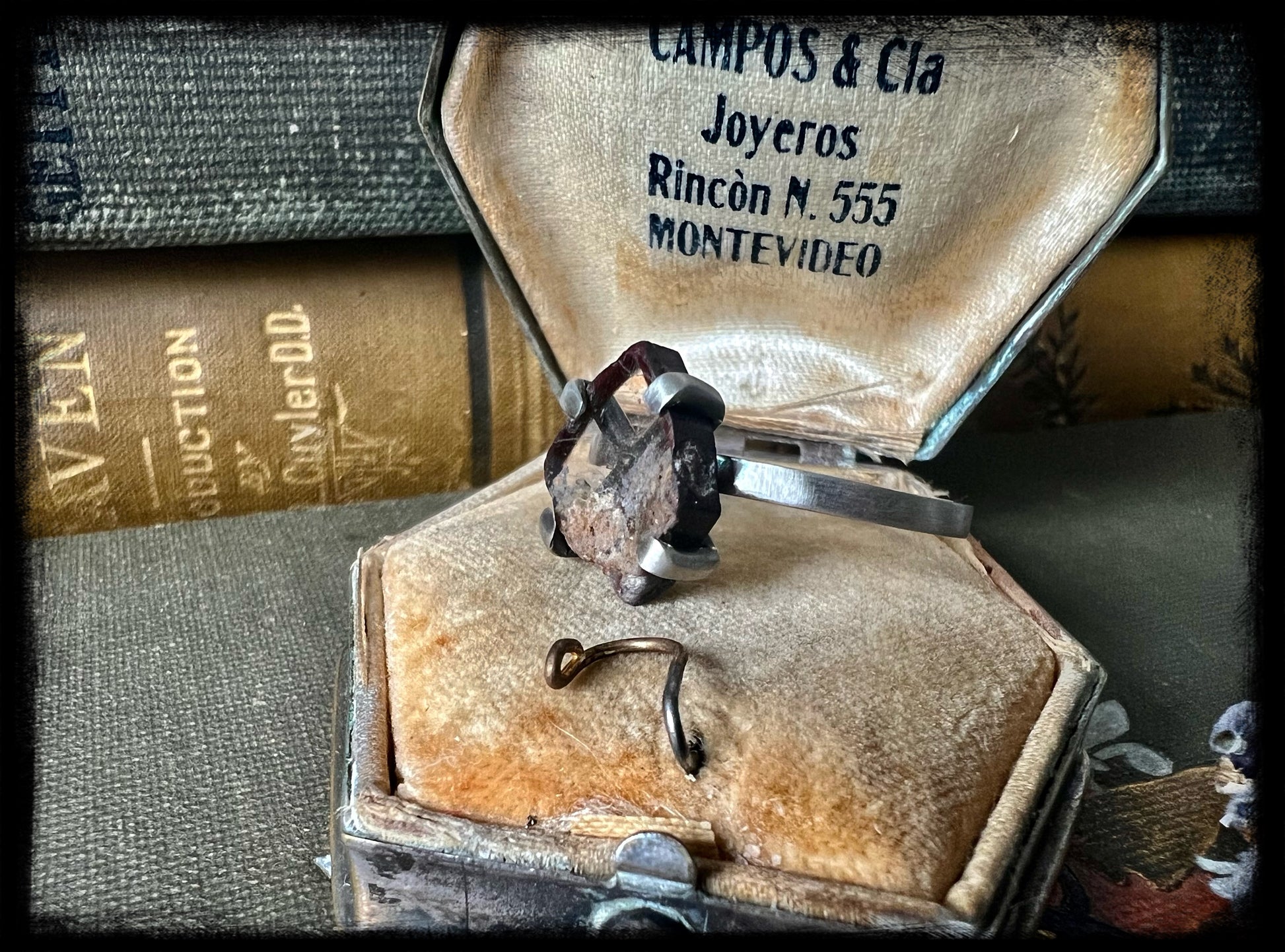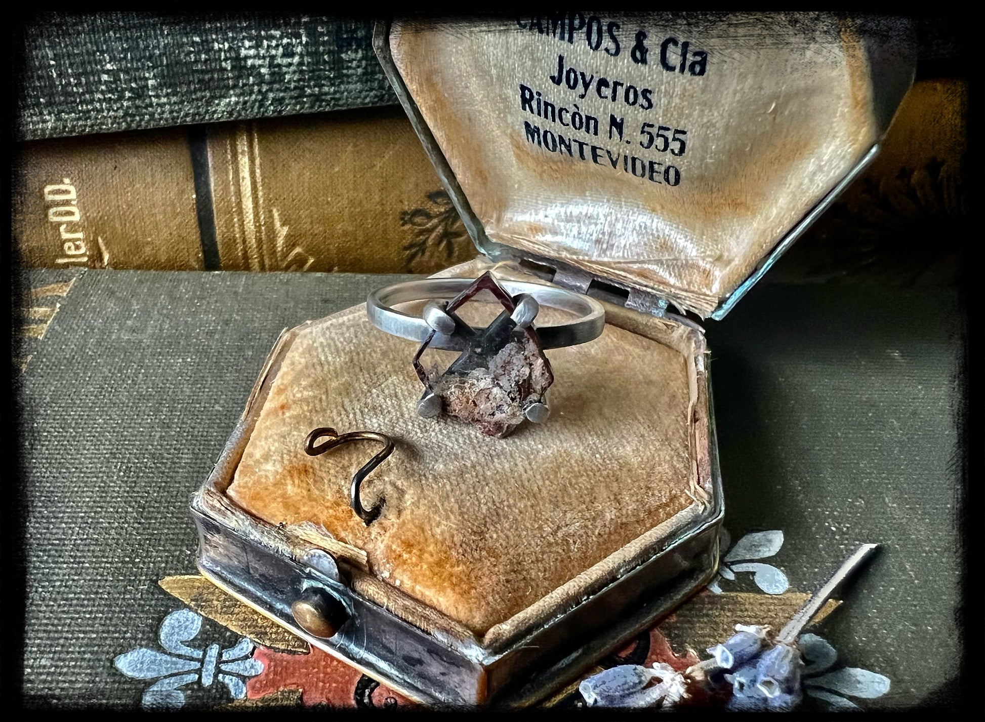 This is a beautiful Mexican Topaz set in a simple sterling silver prong setting. This stone resembles a clear quartz with cool inclusions. This ring is finished with a nice antique patina and the ring band measures a size 9.