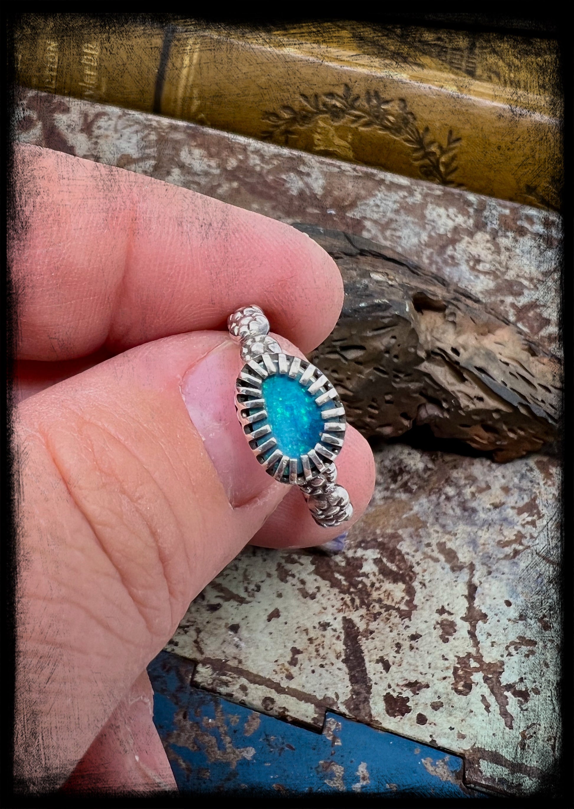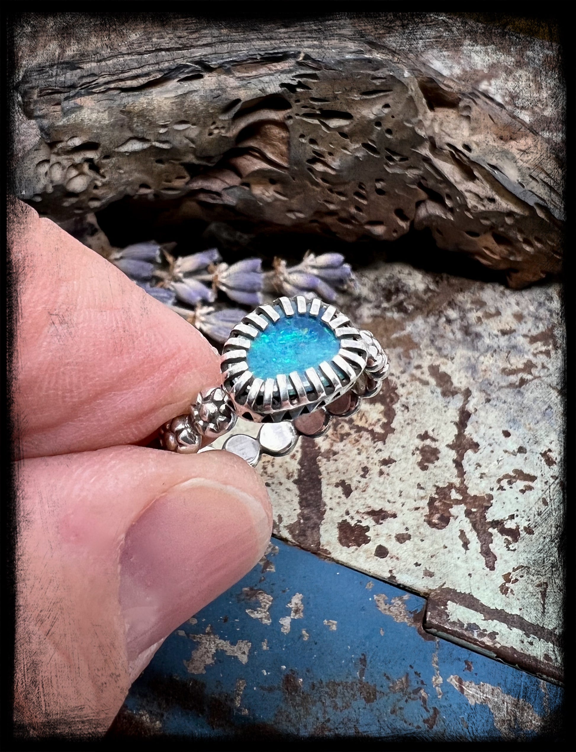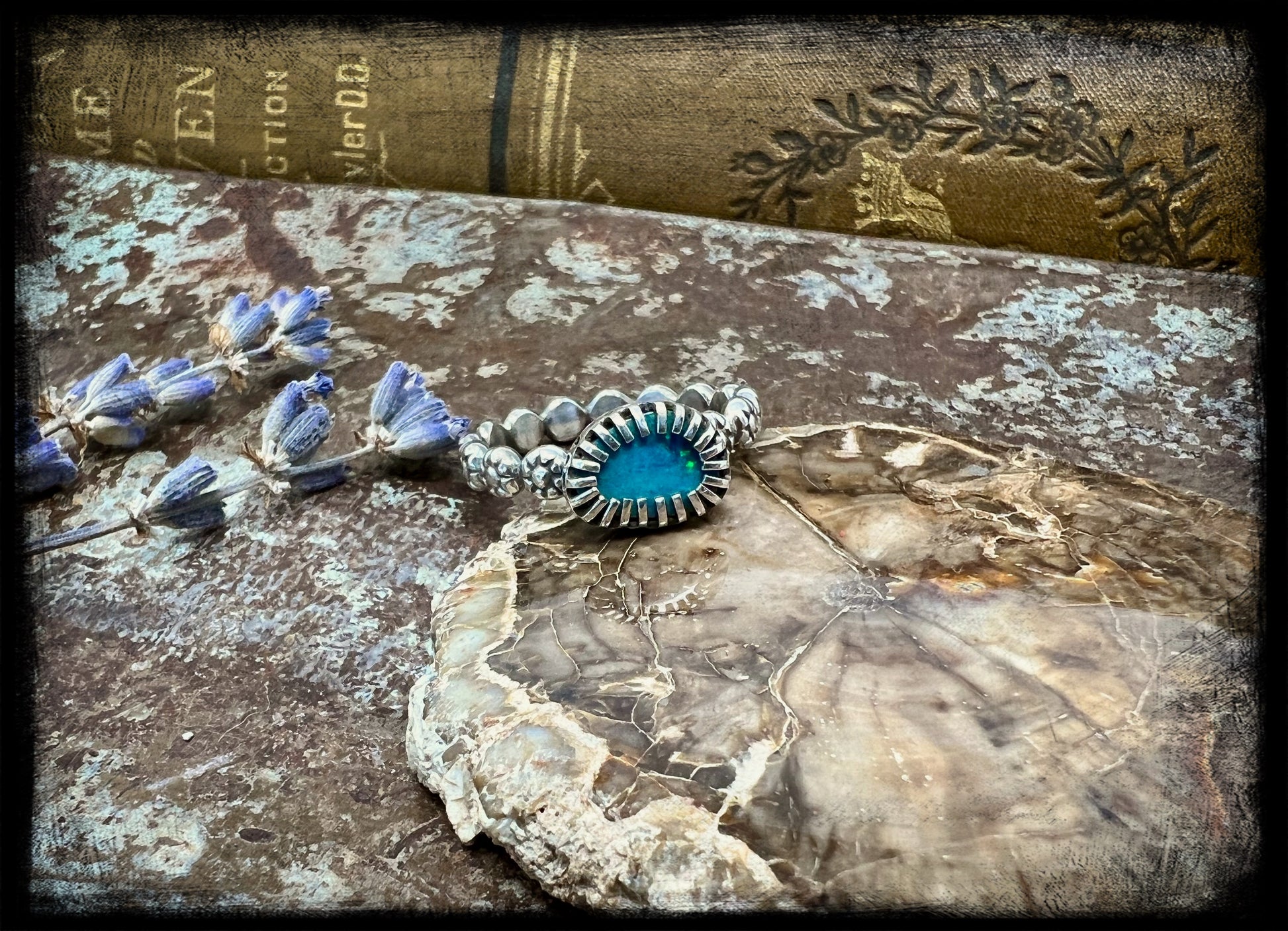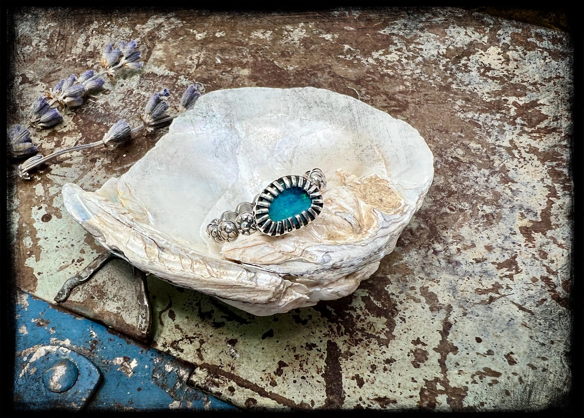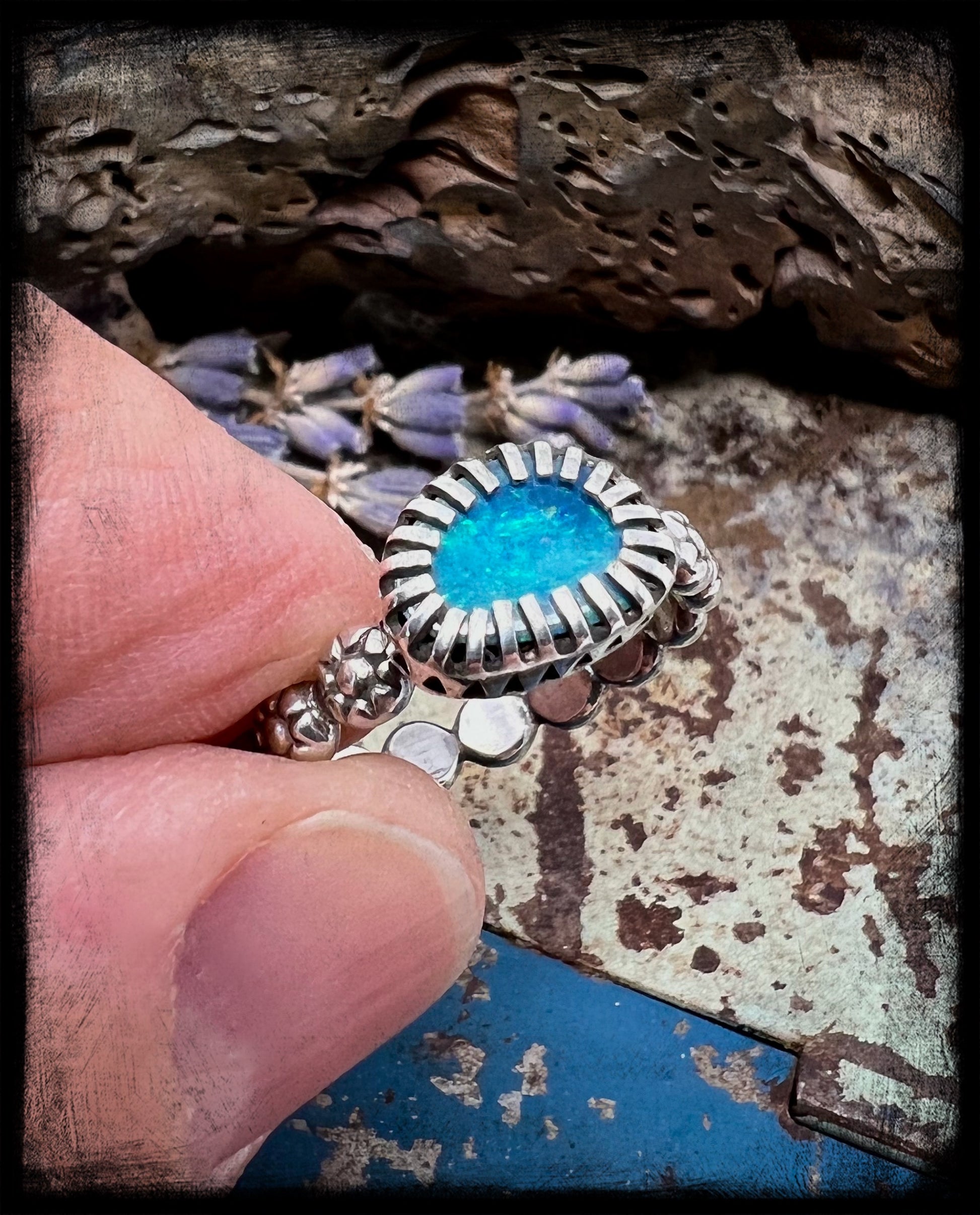 This is a beautiful Caribbean blue opal doublet set in sterling silver with a berry beaded ring band measuring a US8.25. The stone is a beautiful Caribbean blue with a flash of iridescence and measures 1/4" tall by 3/8" wide.