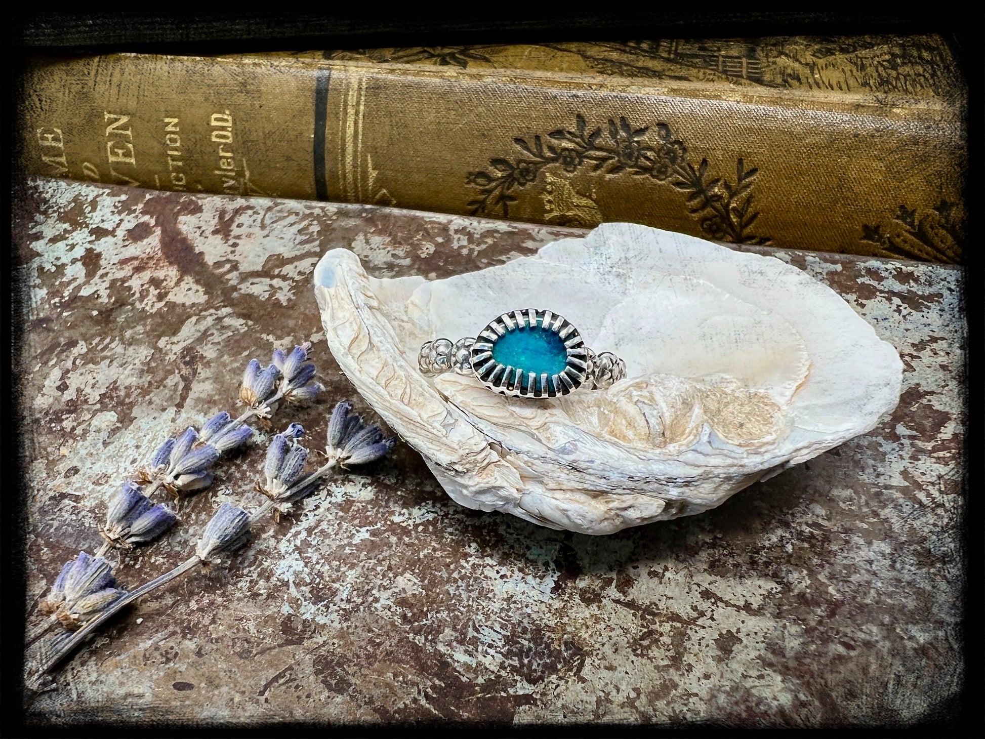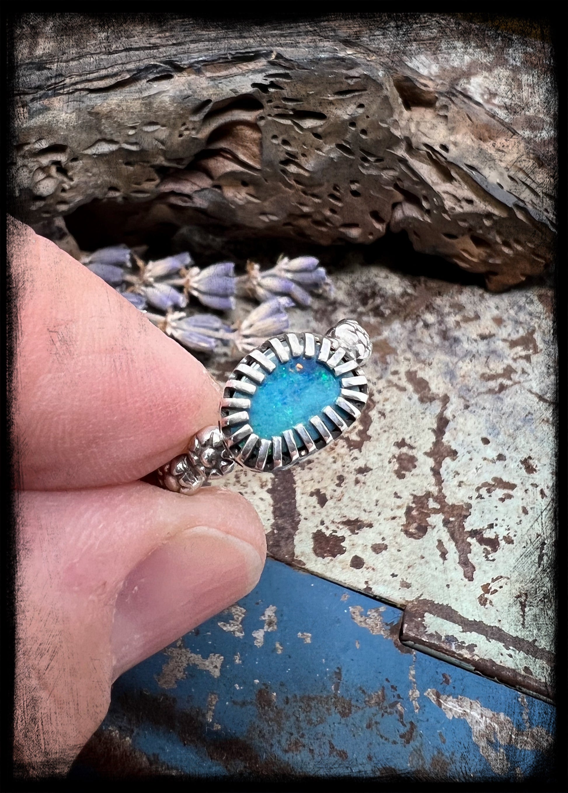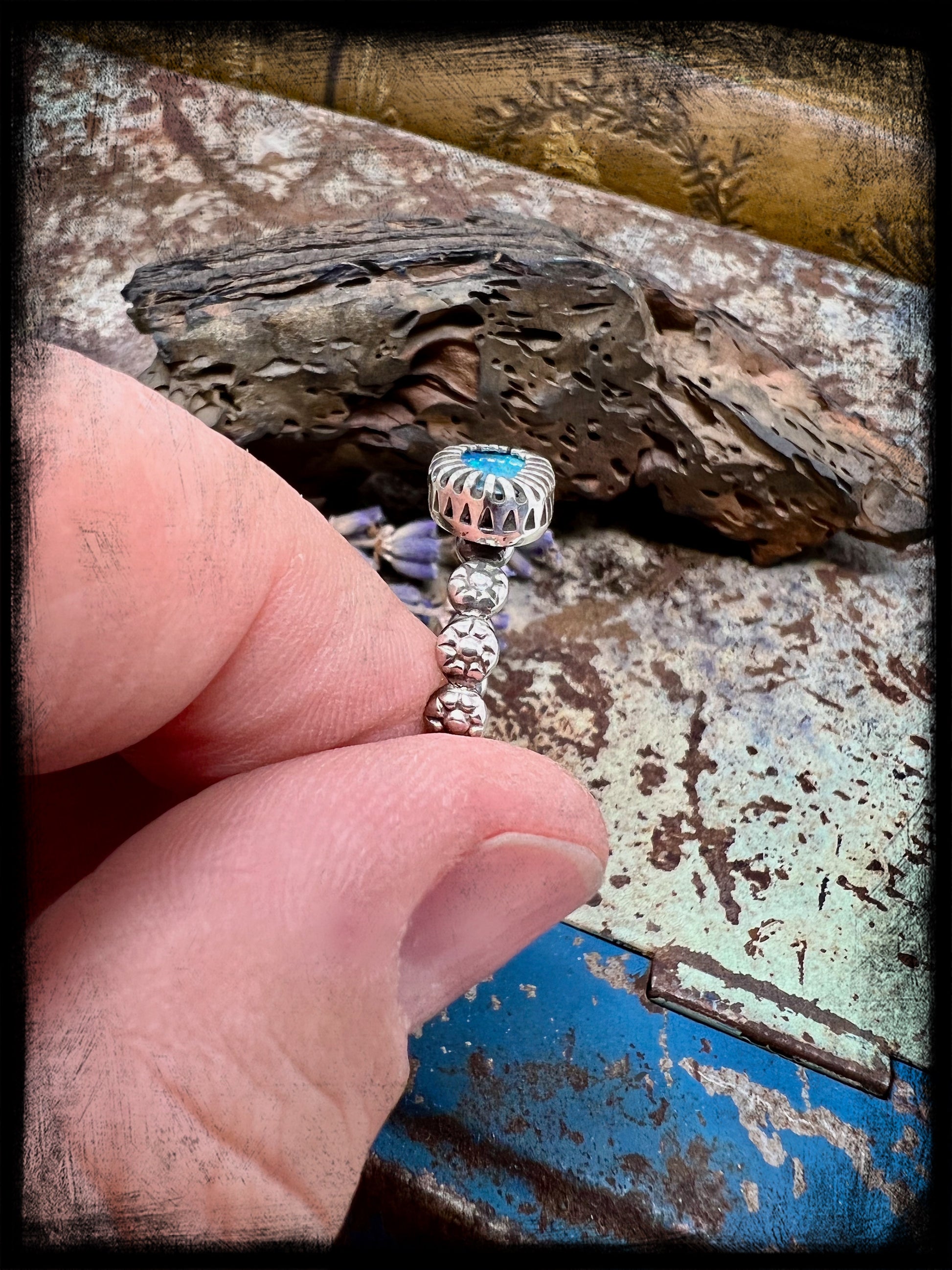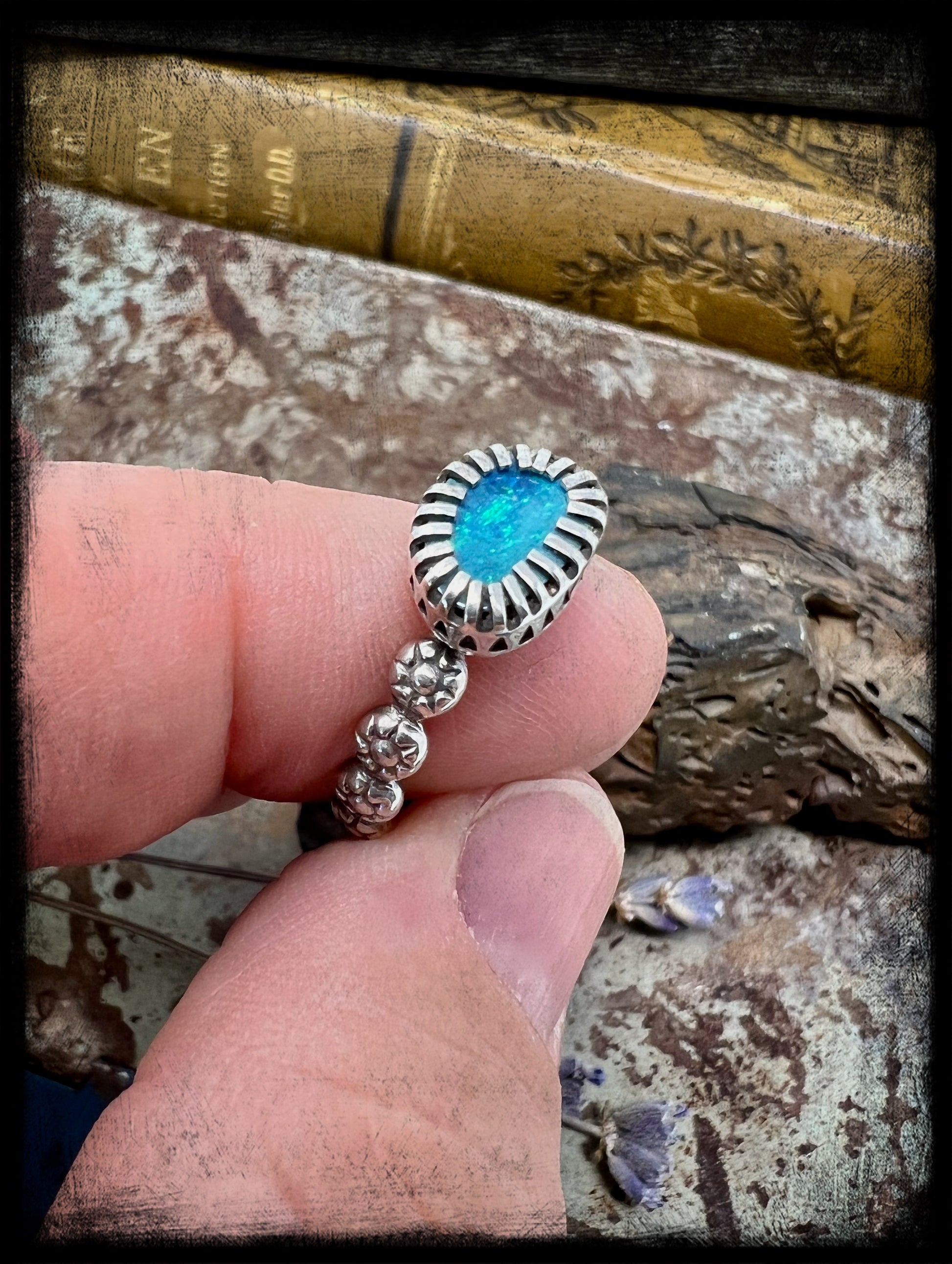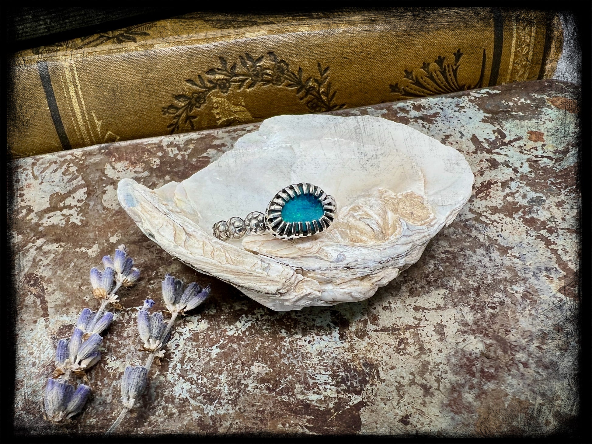 This is a beautiful Caribbean blue opal doublet set in sterling silver with a berry beaded ring band measuring a US8.25. The stone is a beautiful Caribbean blue with a flash of iridescence and measures 1/4" tall by 3/8" wide.