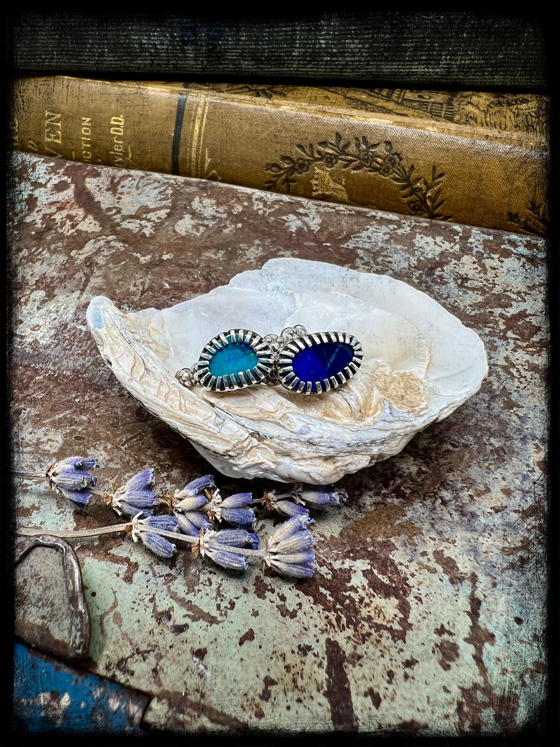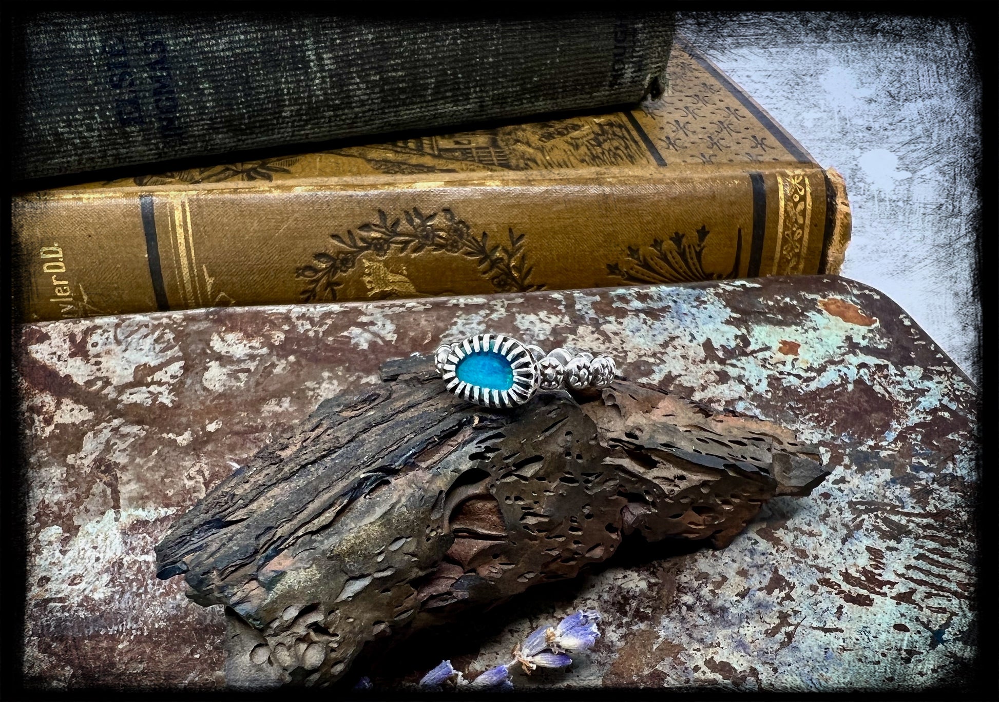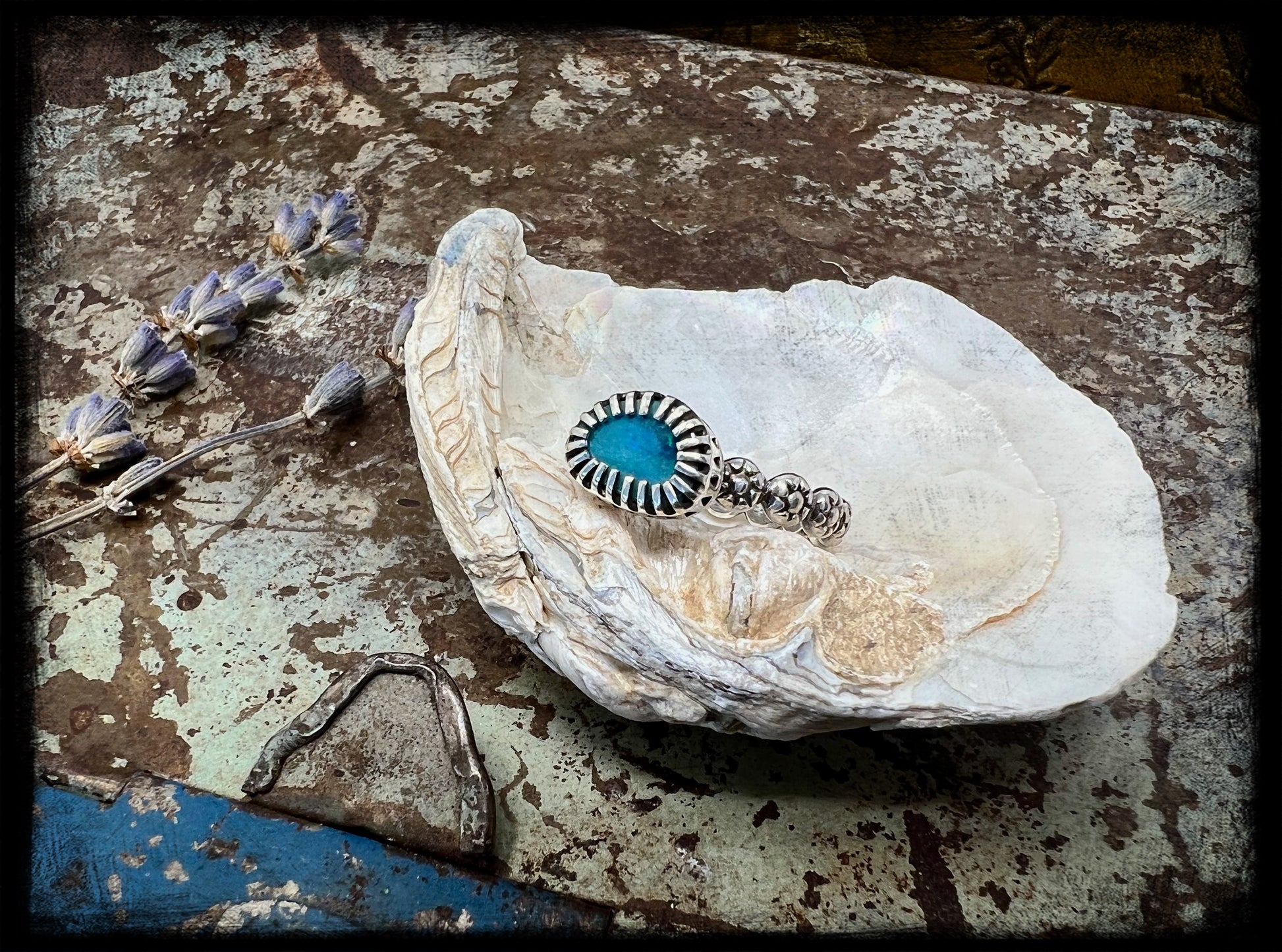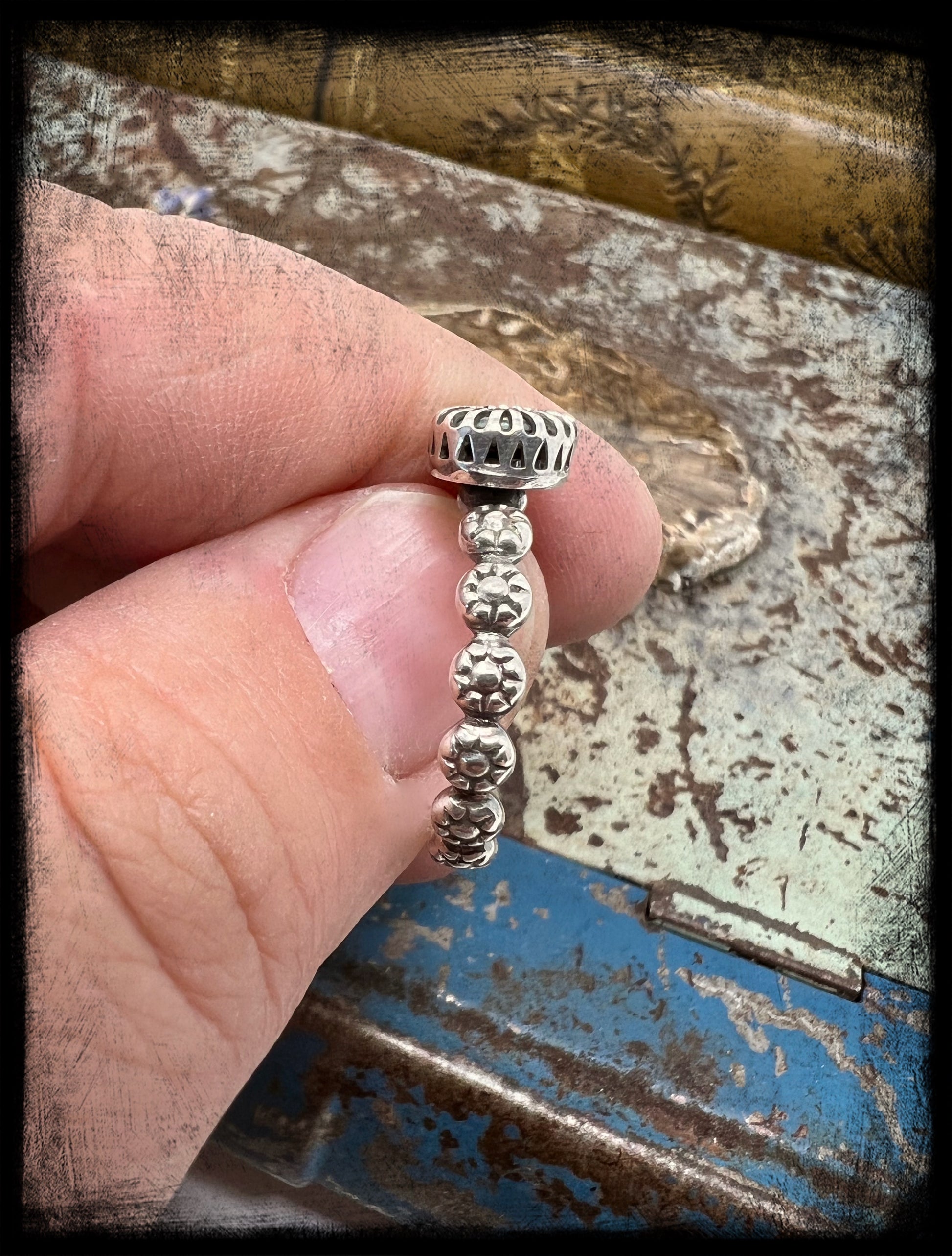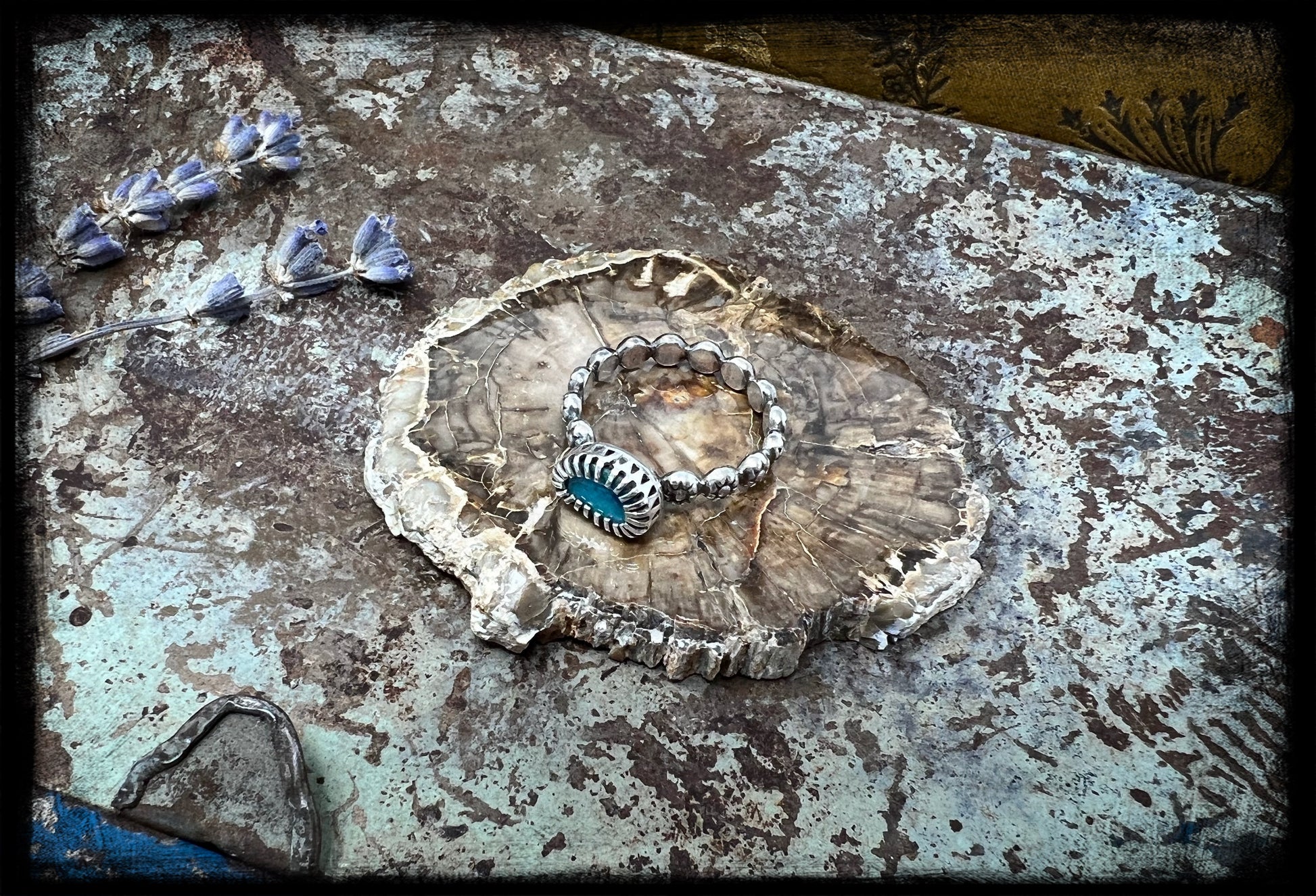 This is a beautiful Caribbean blue opal doublet set in sterling silver with a berry beaded ring band measuring a US8.25. The stone is a beautiful Caribbean blue with a flash of iridescence and measures 1/4" tall by 3/8" wide.