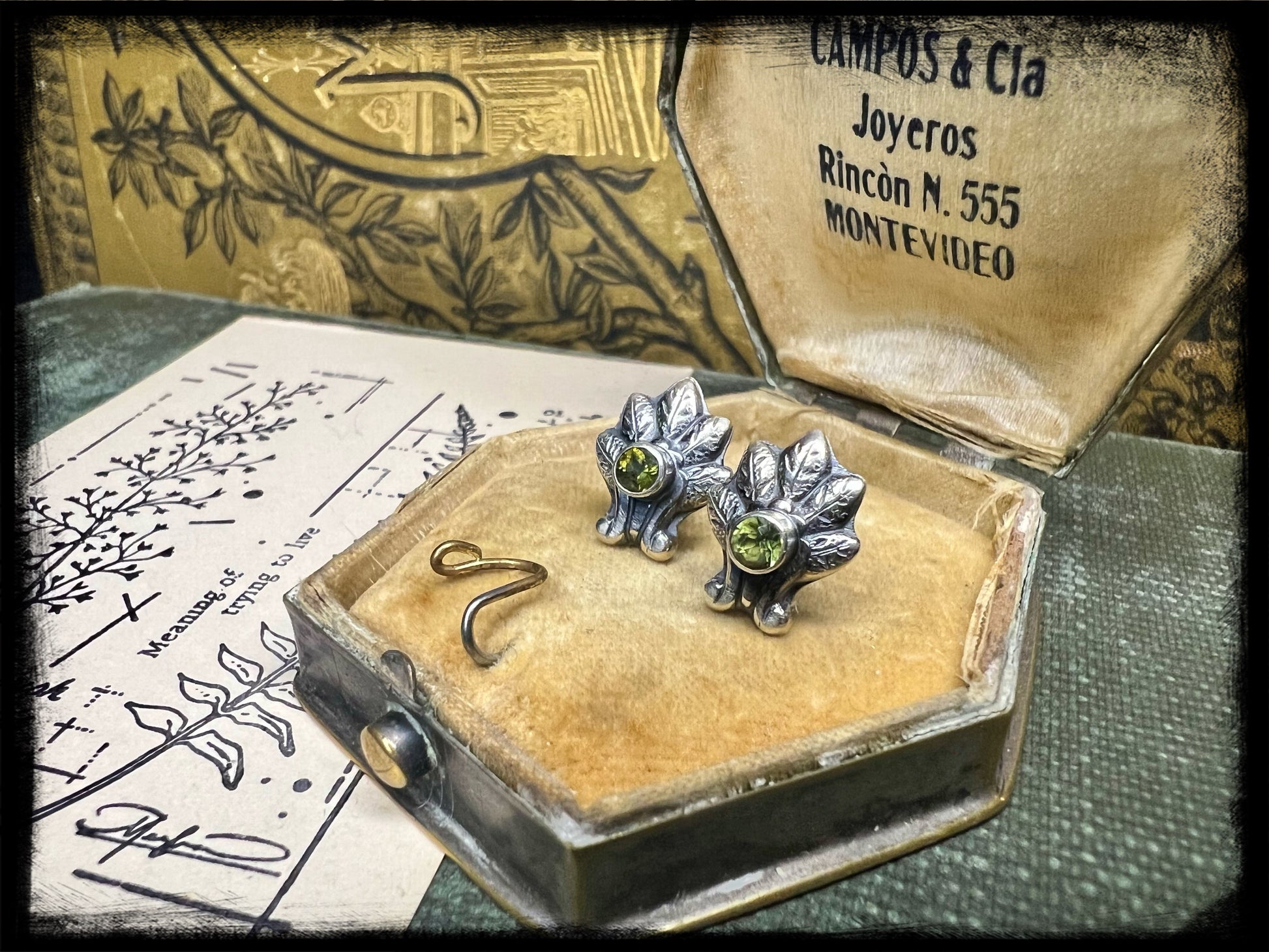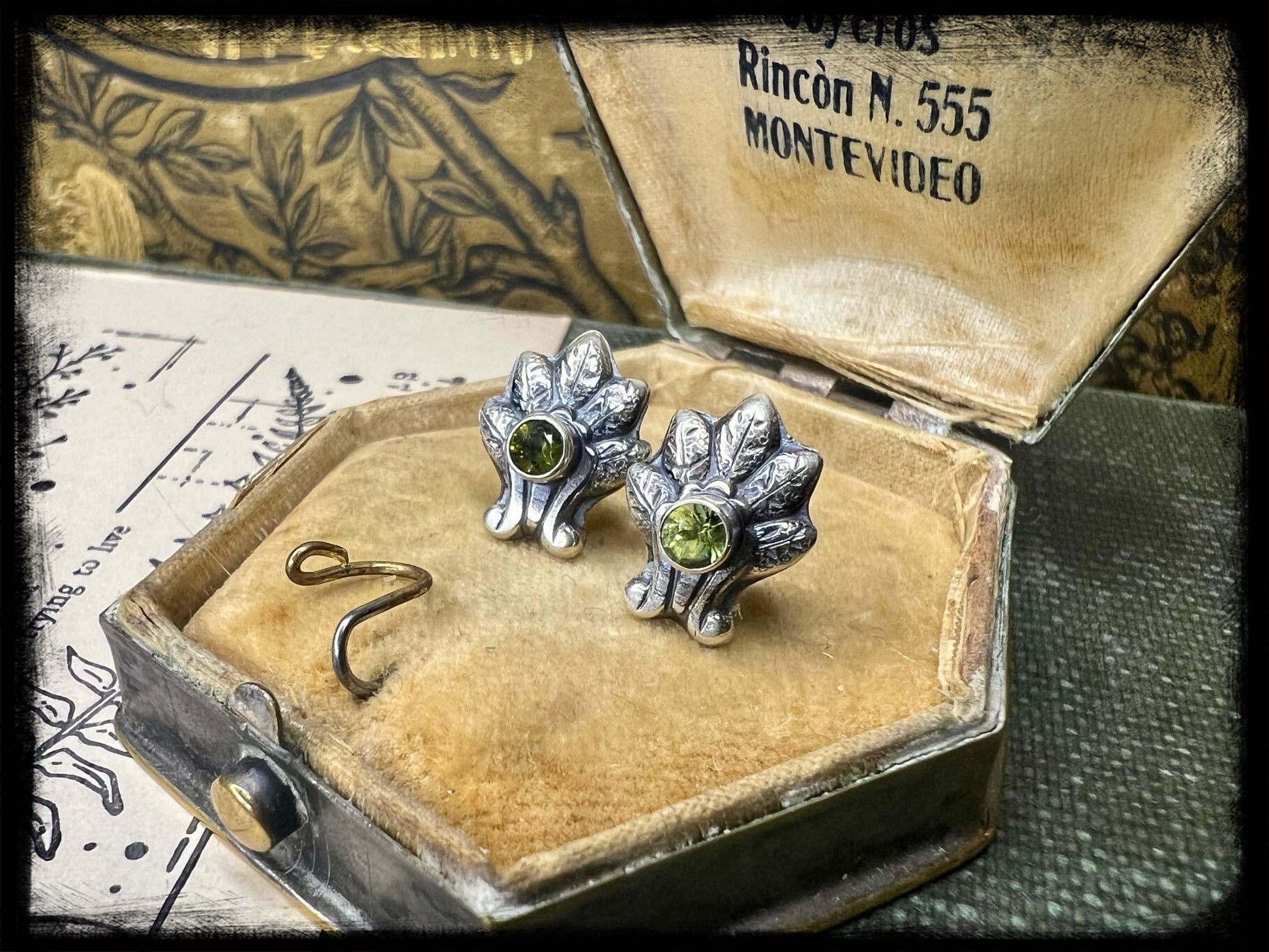 This is an adorable pair of peacock earrings, pressed into sterling silver and finished with a beautiful set of green Tourmaline stones. I wear a pair of these everyday. Great with any attire and comfortable to wear. The Tourmalines are 3mm in size. The two green stones are slightly different in tone but I think that is what also makes them very beautiful.