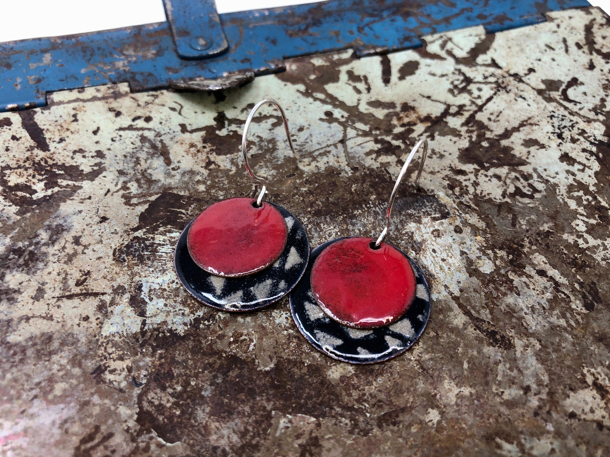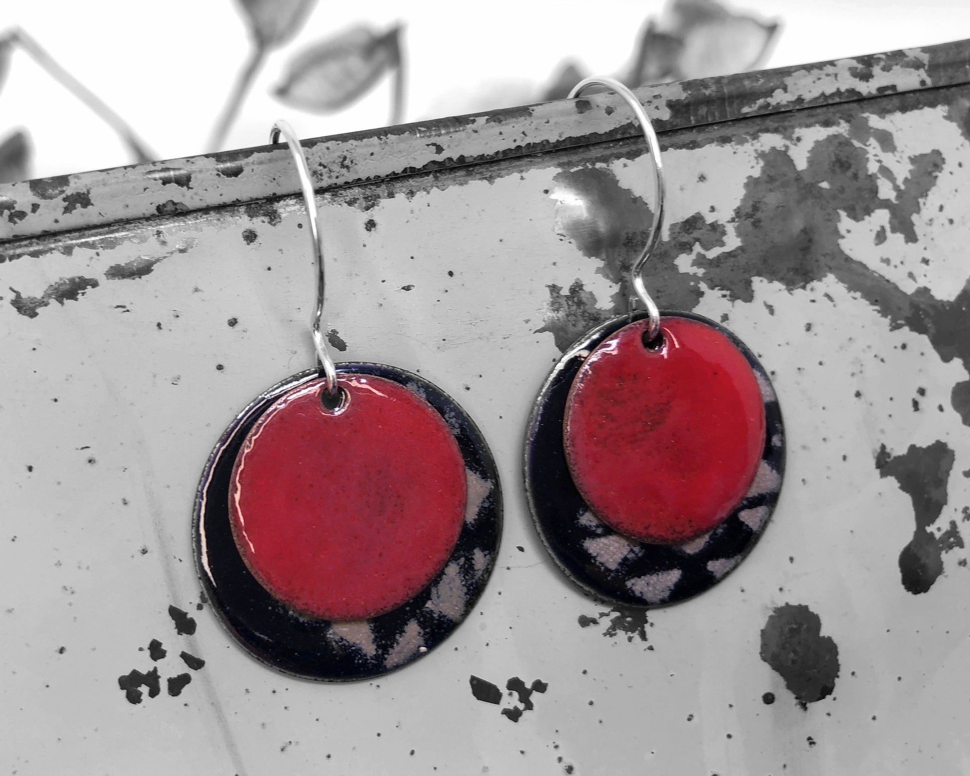 These are handmade enamel coin drop earrings. I have created two layers of copper coins coated in enamel, one in red enamel and the other is black enamel with a white geometric pattern, the largest of the 2 measuring 1" in diameter. This design is very 80's inspired. These fun coins hang from sterling silver earring hooks.