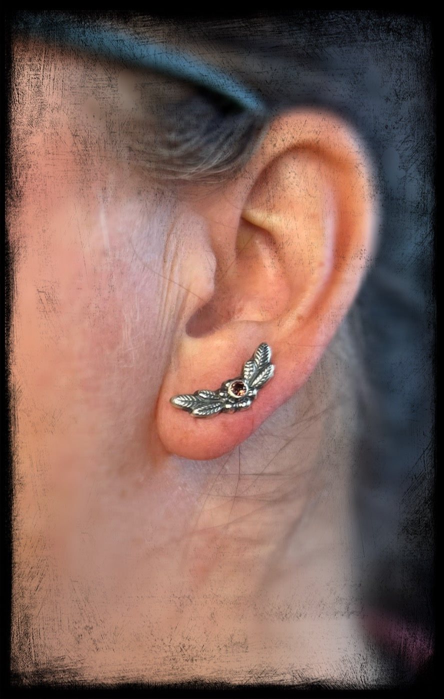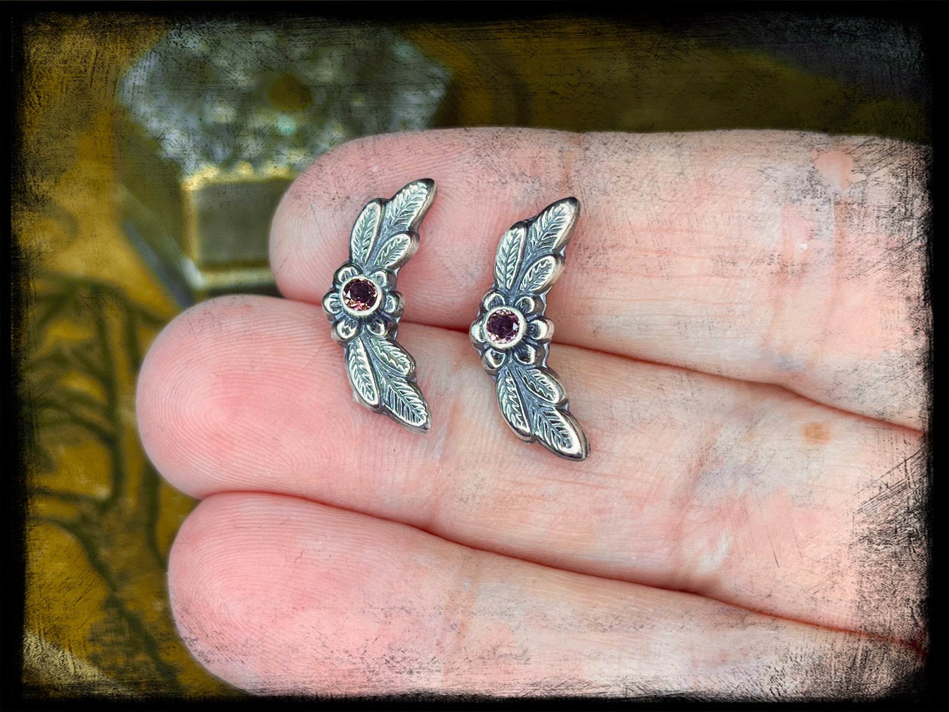 This is a beautiful pair of sterling silver flower stud earrings with dark pink Tourmaline stone settings.