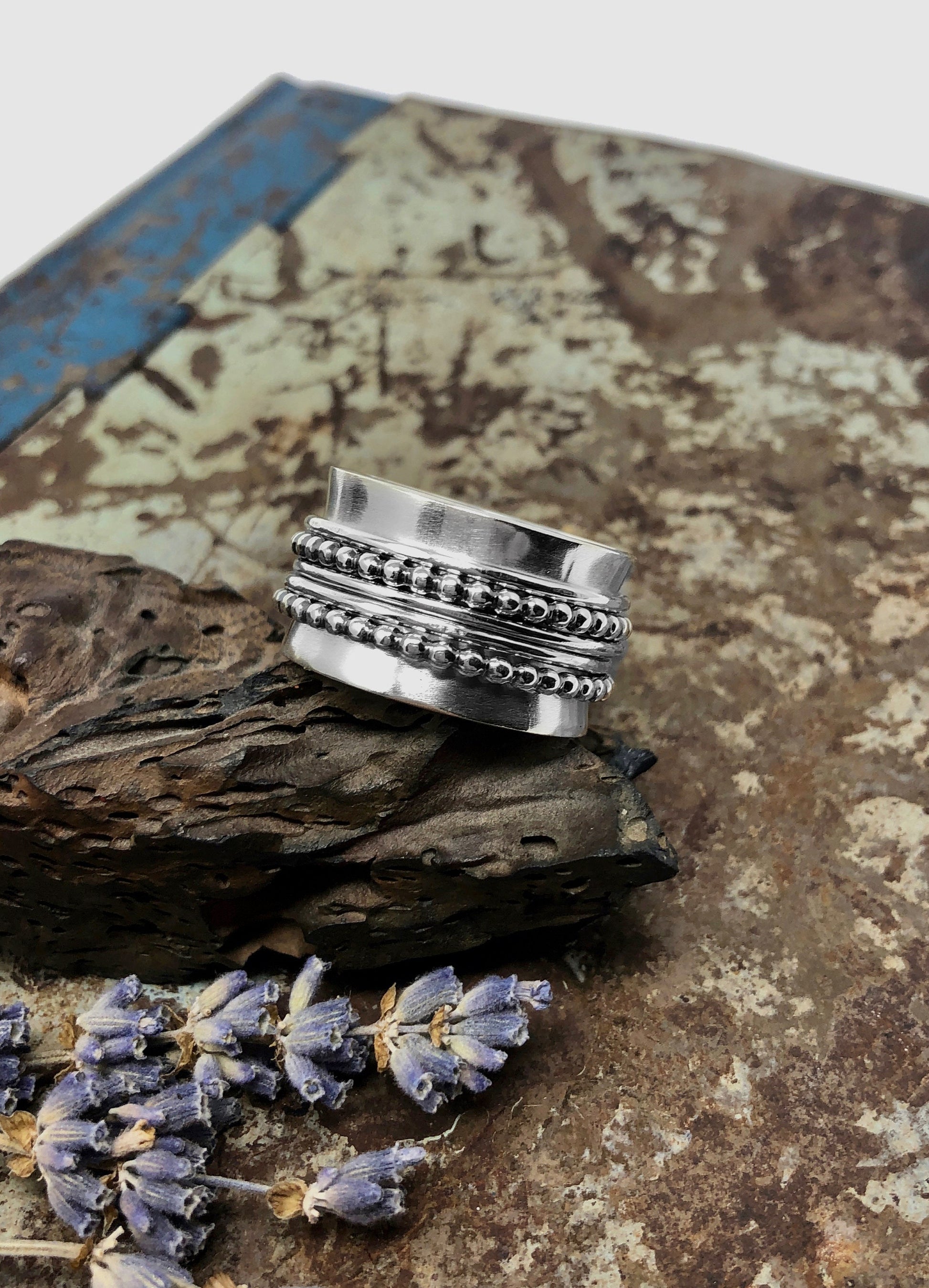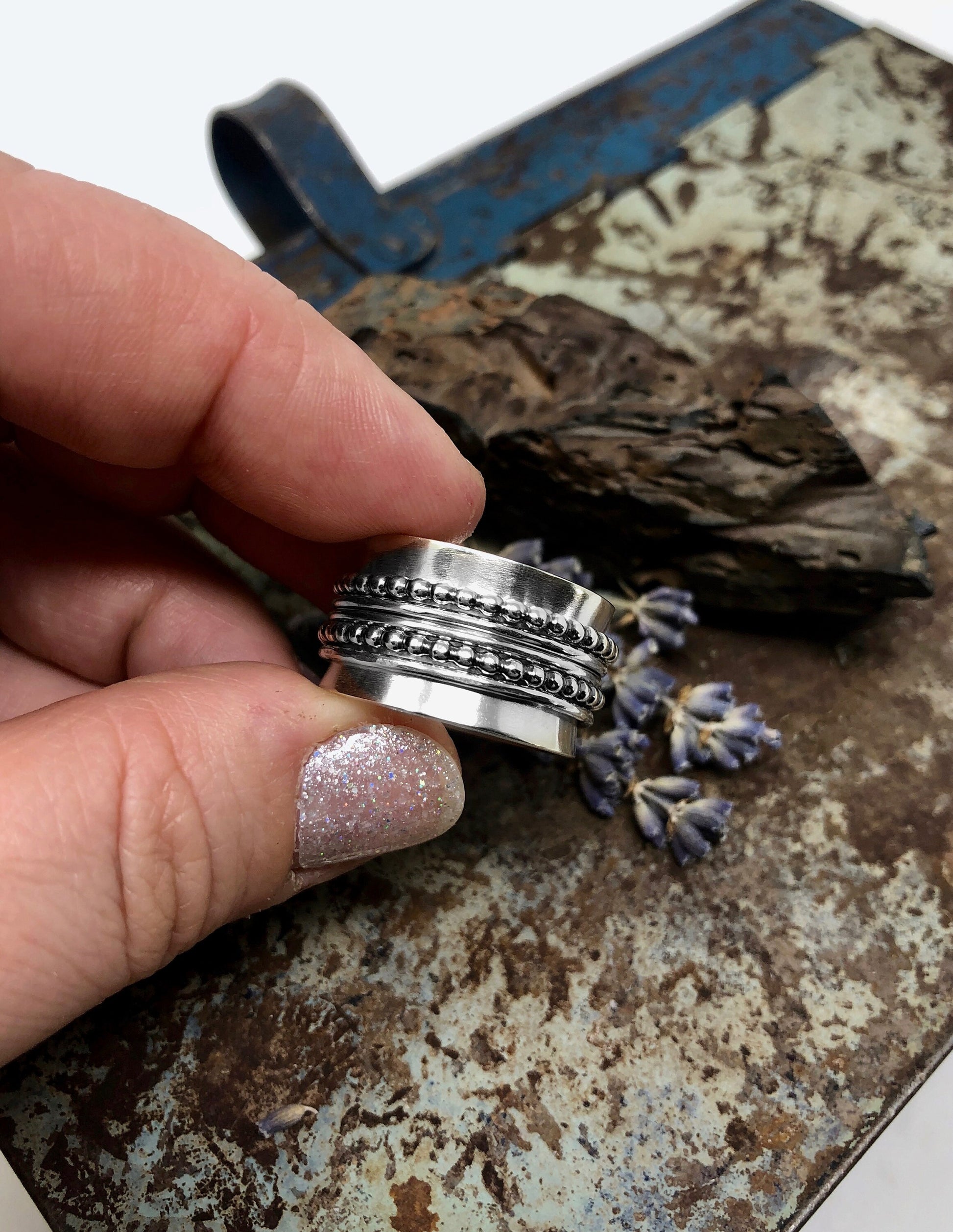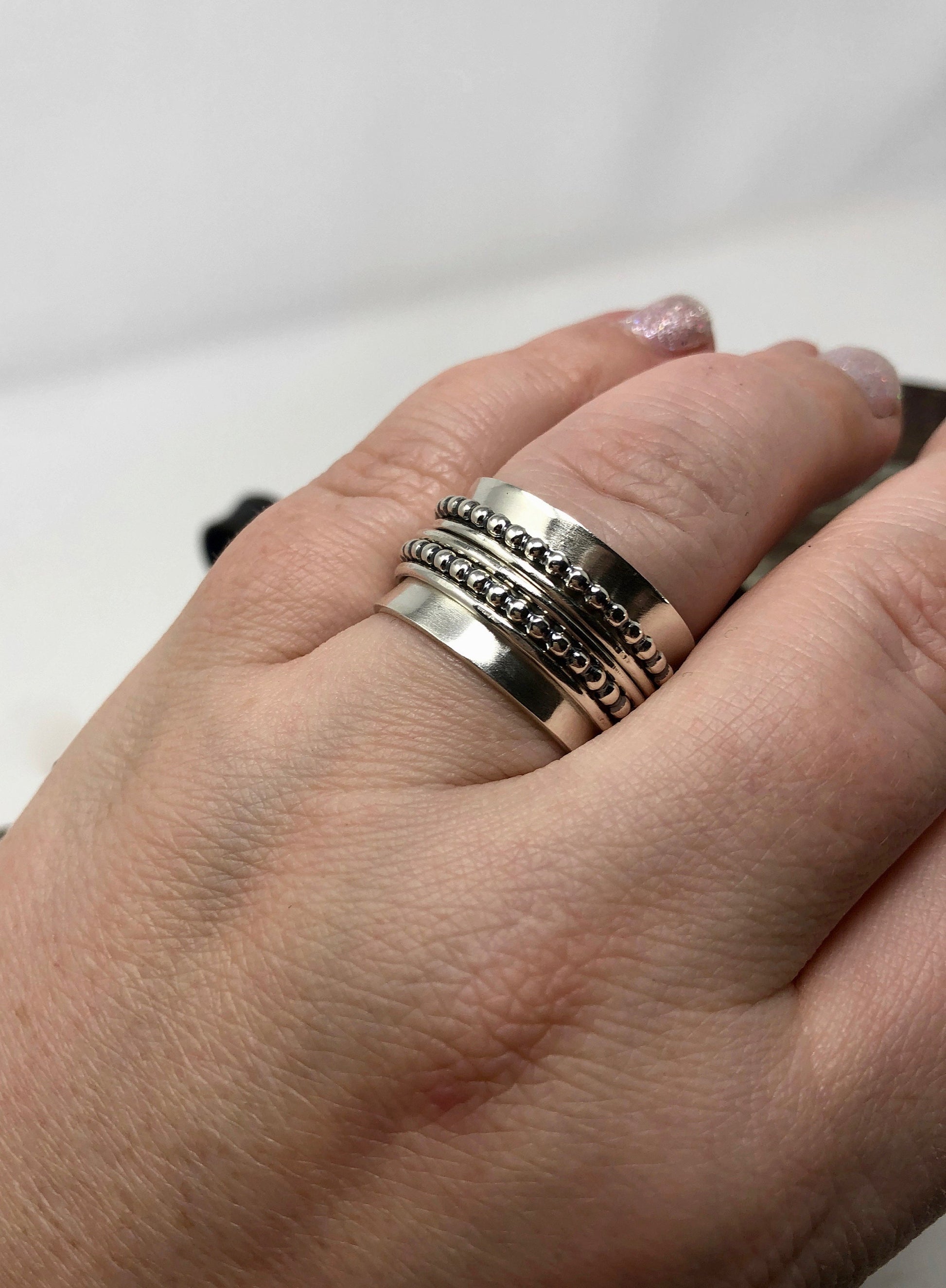 This is a beautiful sterling silver spinner ring. The width of the band measures 9/16" wide and is adorn with 5 individual spinners, three solid and two beaded. This ring band is very comfortable and the spinners add an element of movement. The final finish is a satin polish.