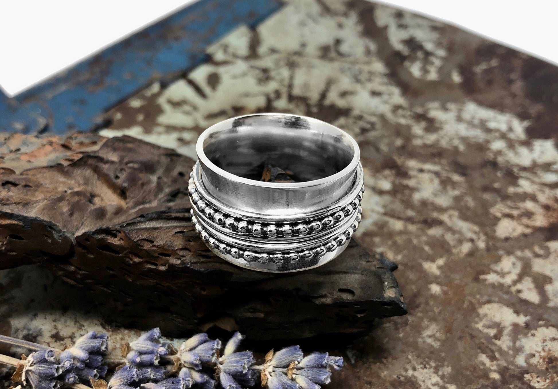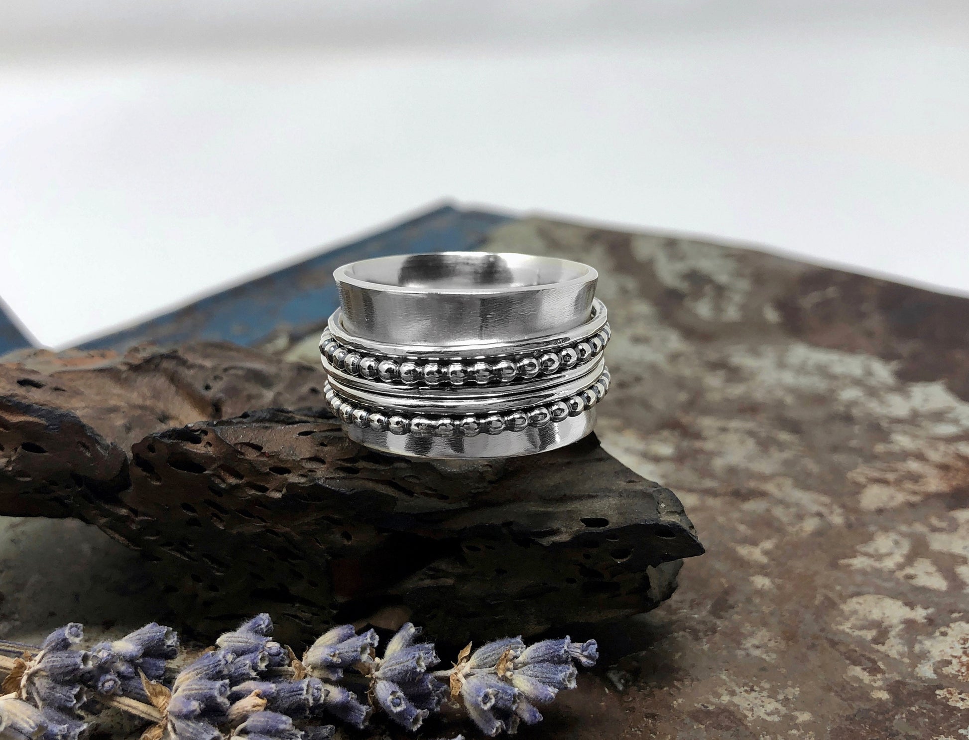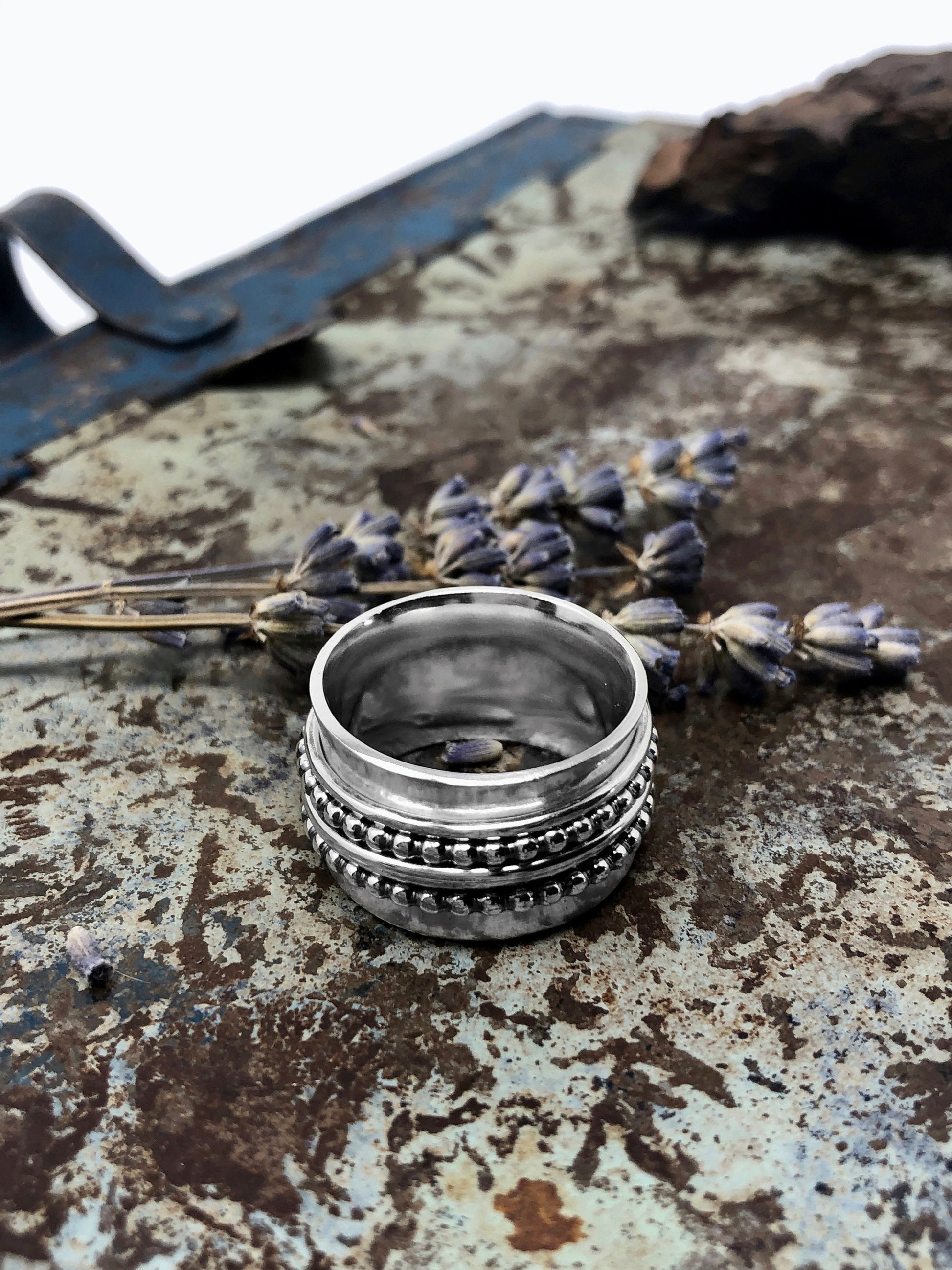 This is a beautiful sterling silver spinner ring. The width of the band measures 9/16" wide and is adorn with 5 individual spinners, three solid and two beaded. This ring band is very comfortable and the spinners add an element of movement. The final finish is a satin polish.