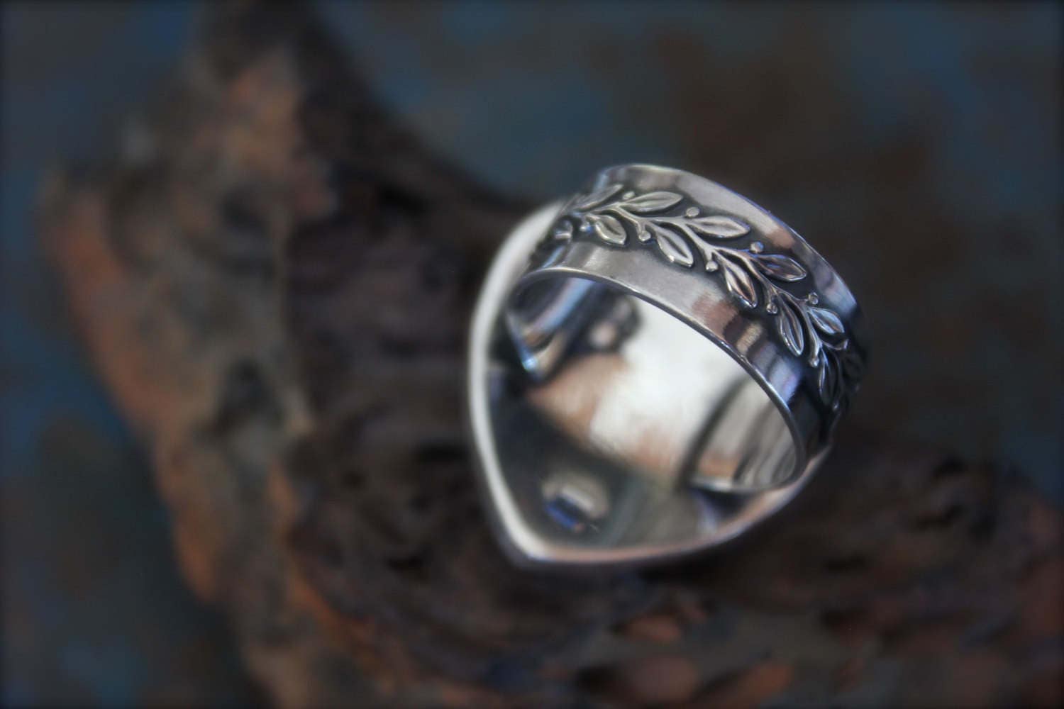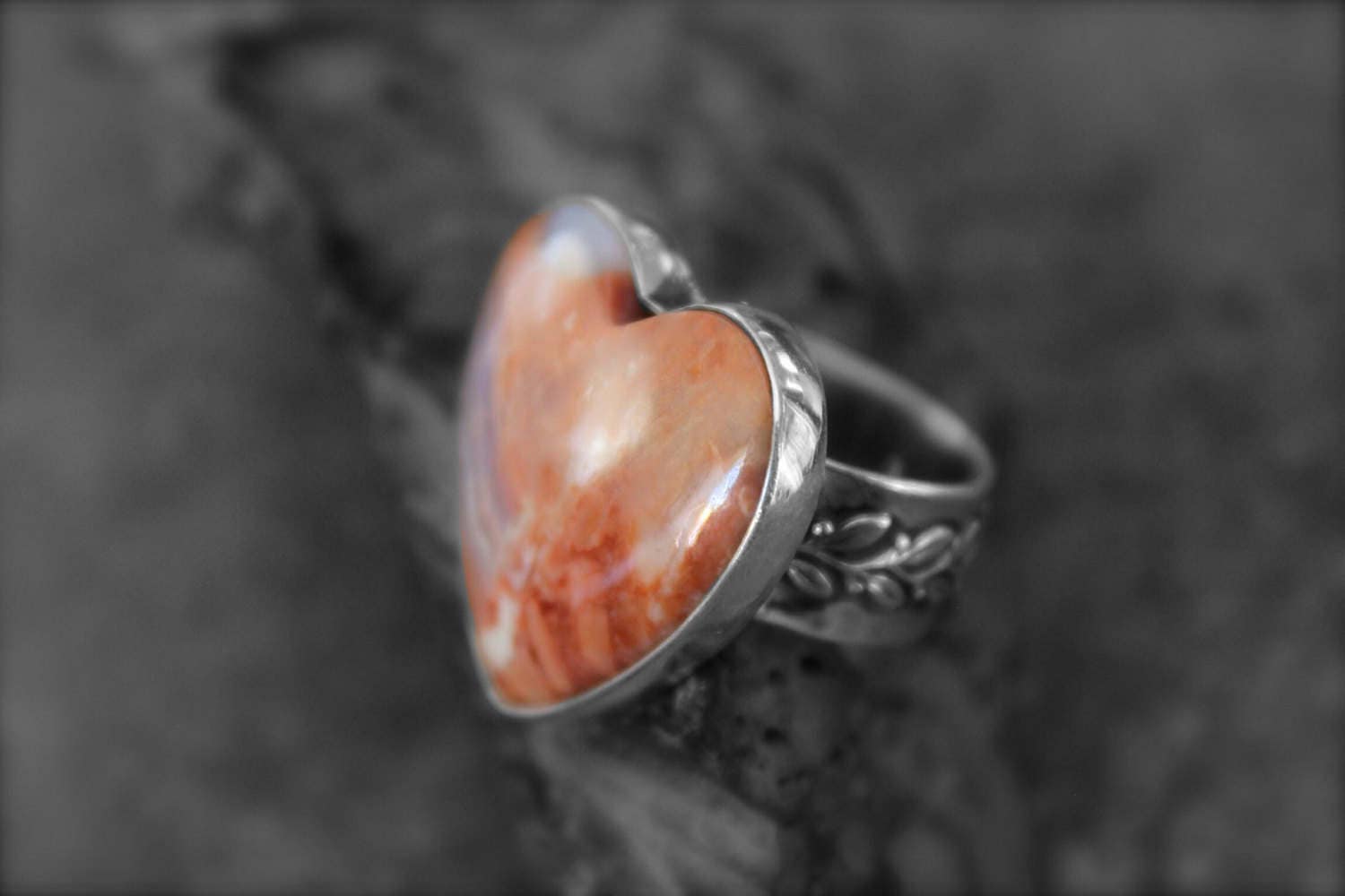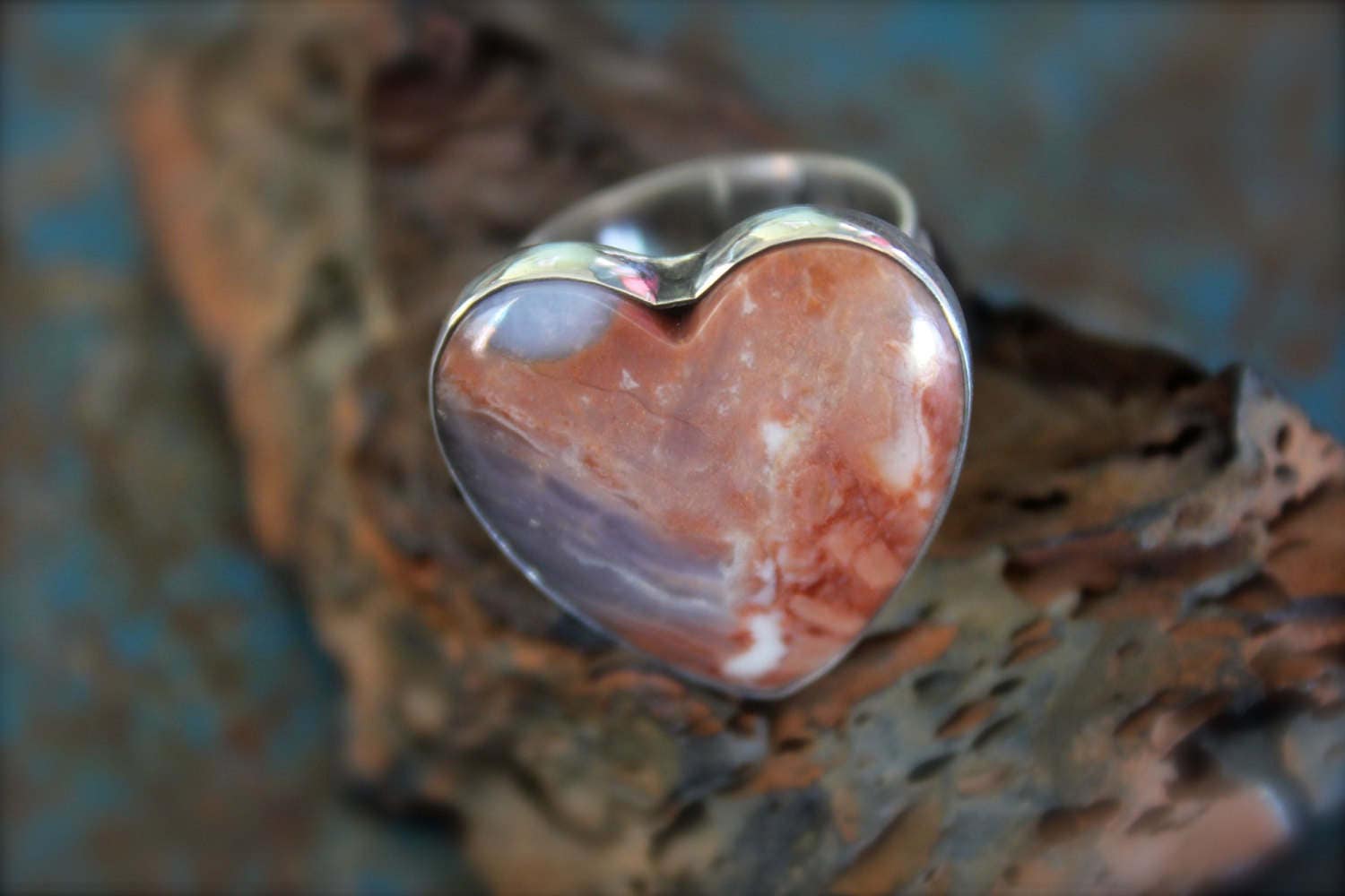 This is a beautiful Thunderegg Agate stone cut into a heart shape and set in sterling silver. The heart measures ~1" in length and is surrounded by a simple but beautiful plain bezel setting. The ring bad is decorated with a gorgeous leaf pattern is measures a size 8.75. The ring was finished with a nice matte patina.