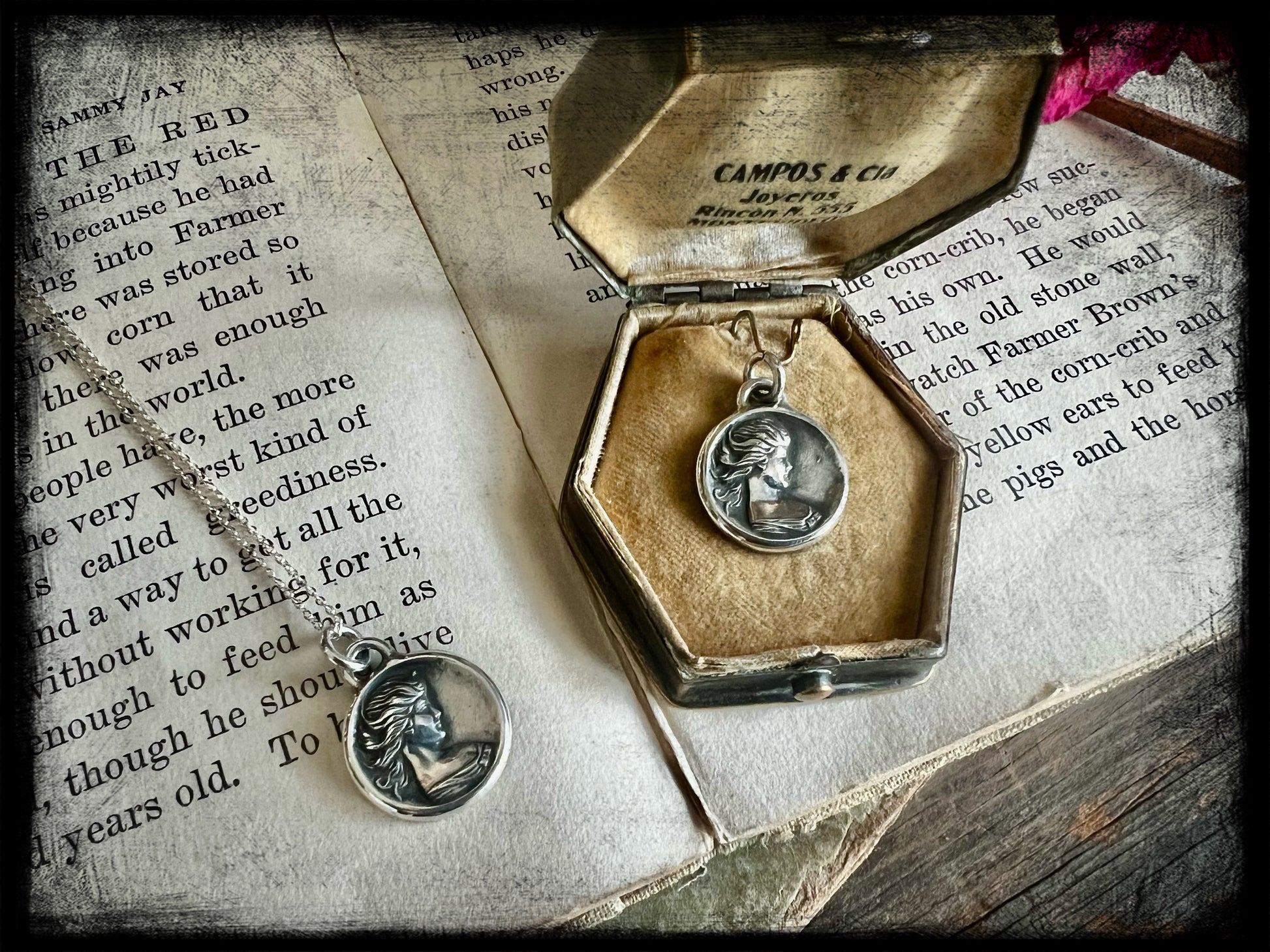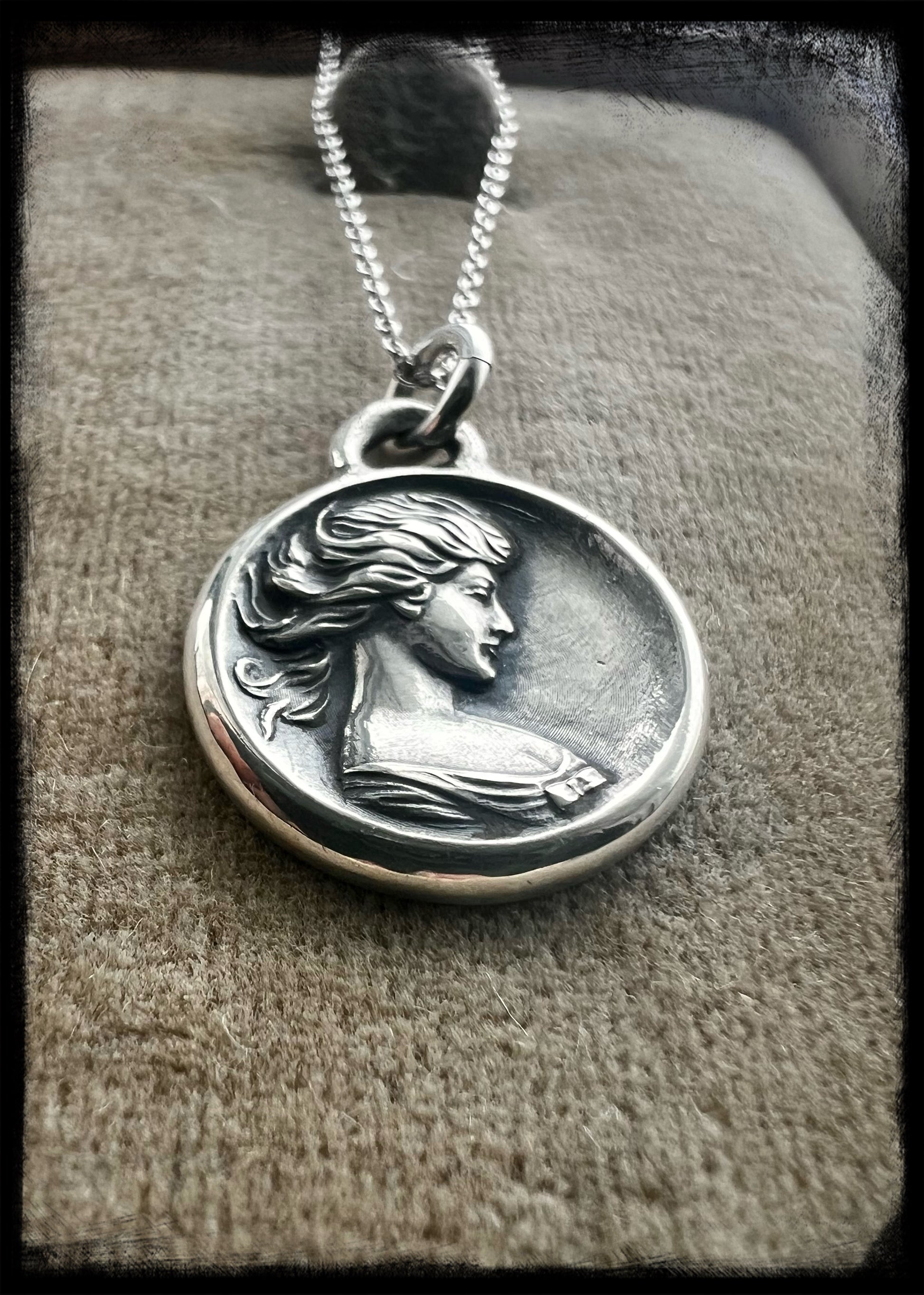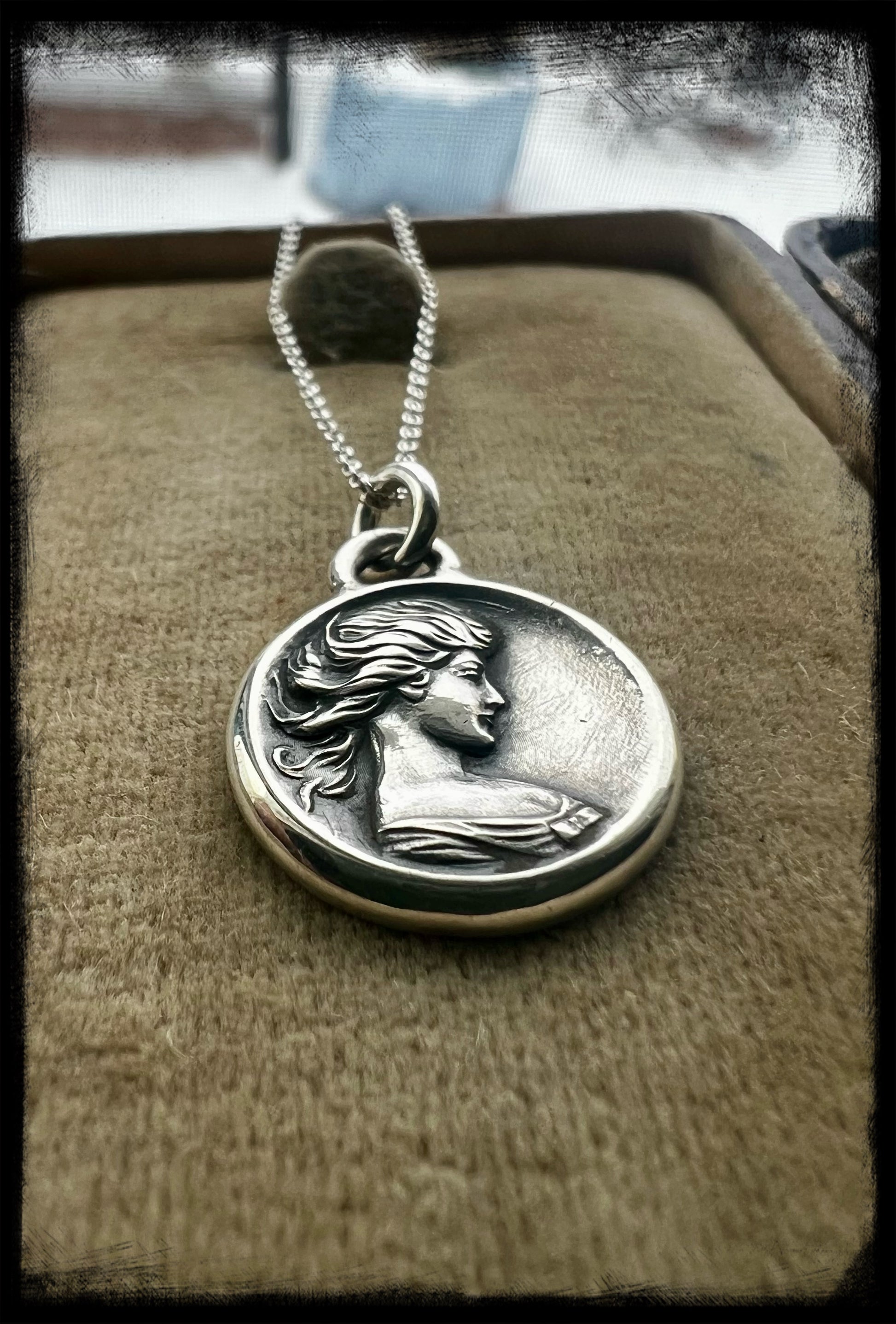 A timeless portrait of grace and freedom, this sterling silver pendant shows a woman's profile with her hair swept back by an unseen breeze. Coin-like in form yet alive with movement, it carries the spirit of resilience and beauty wherever it's worn.